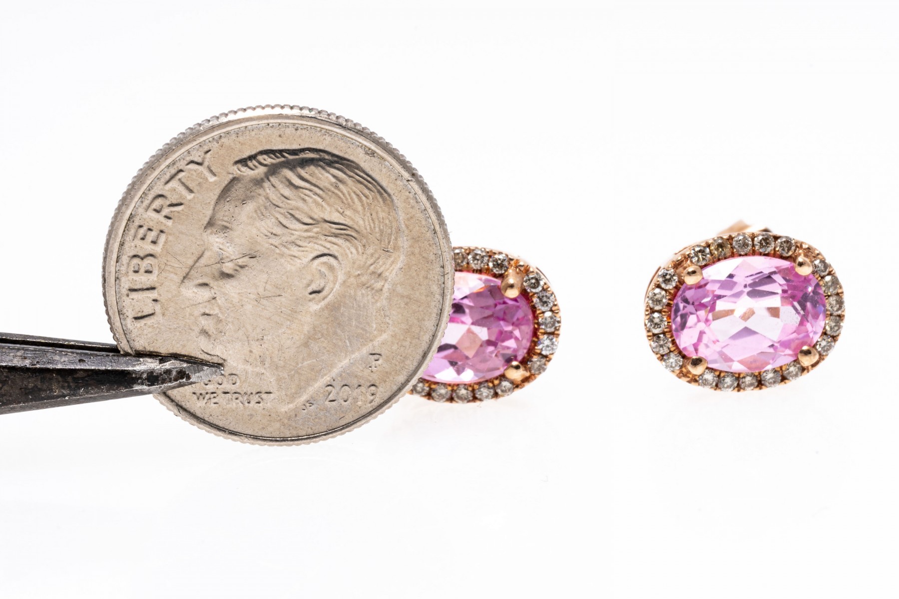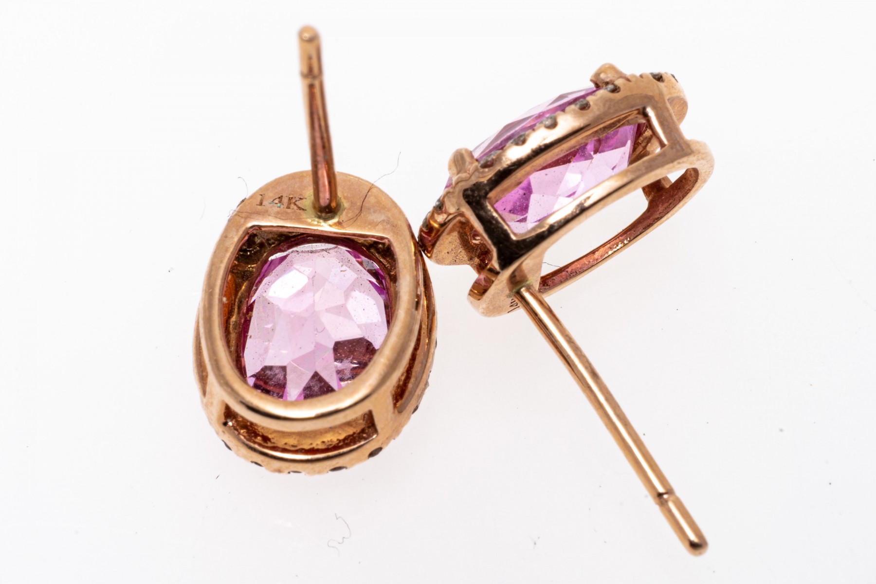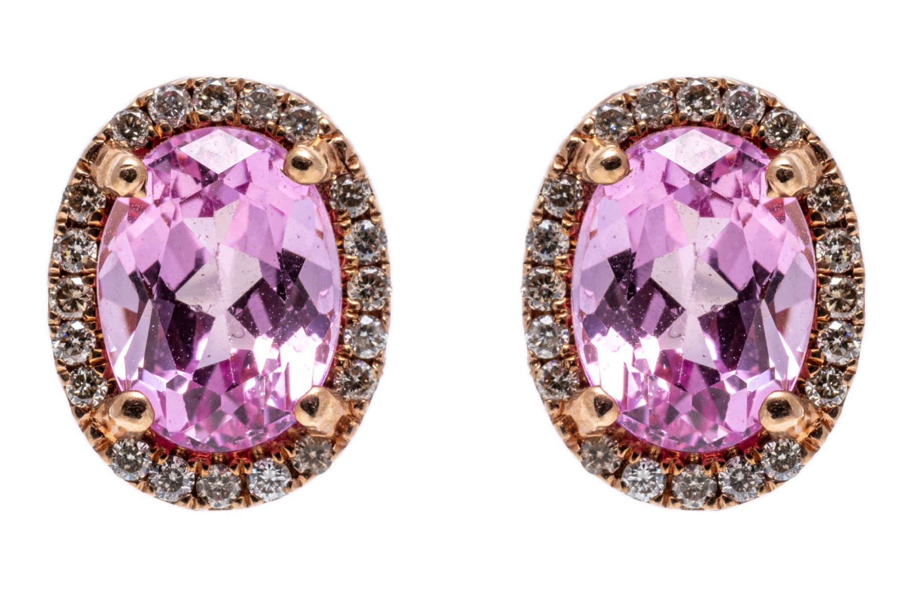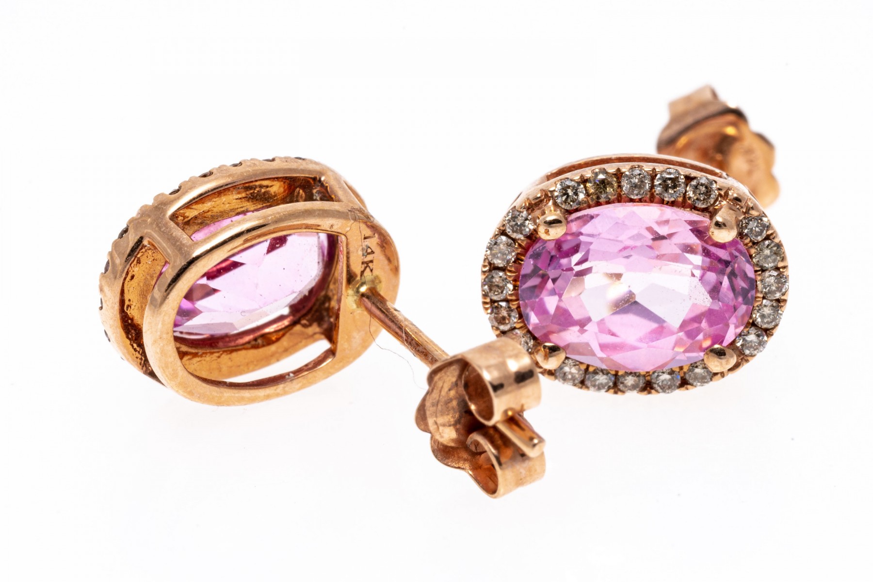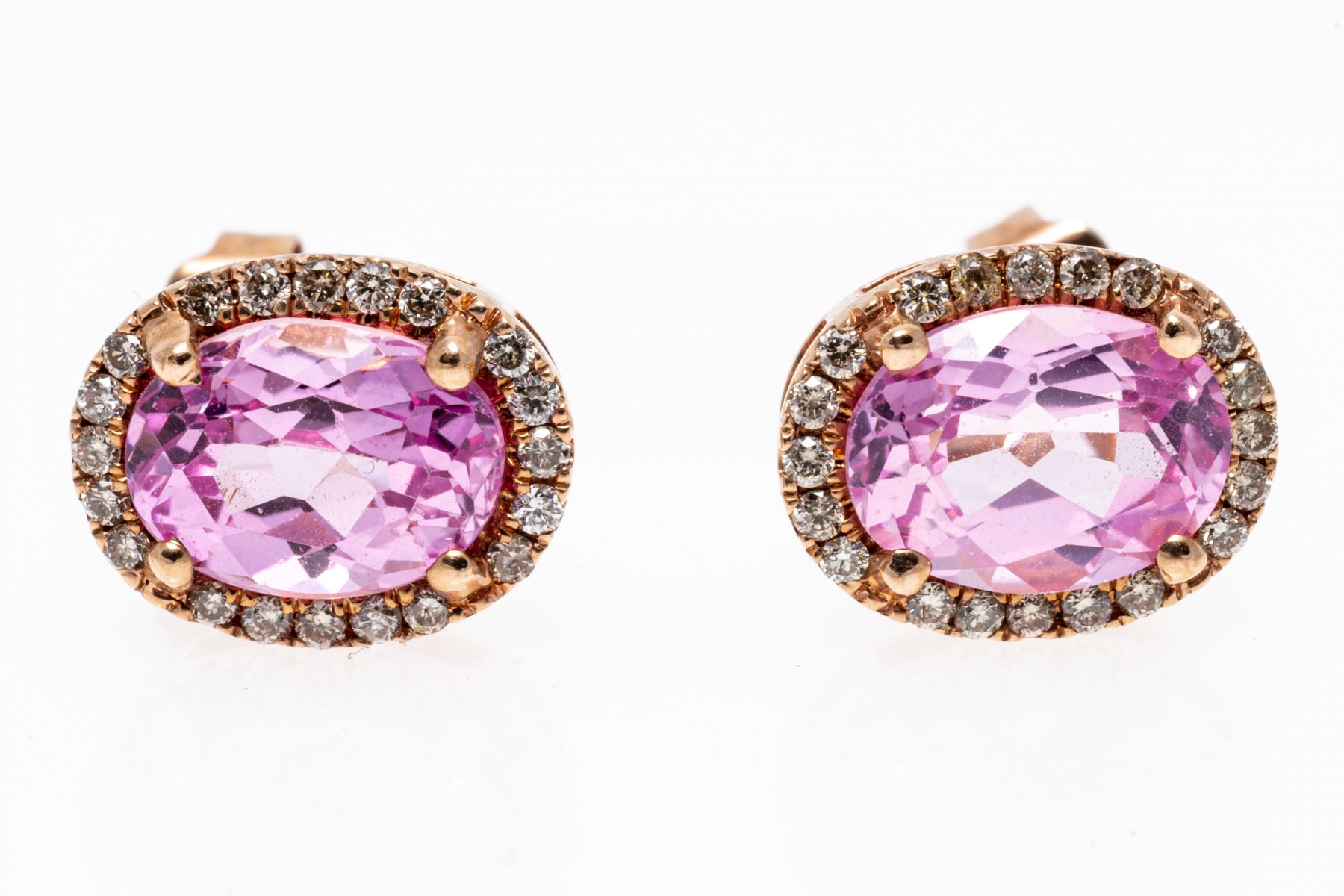 14K rose gold stud earrings. Set into the earrings are oval faceted synthetic sapphires with a bright pink color, encircled by shimmering accent diamonds. Post and clutch backings.