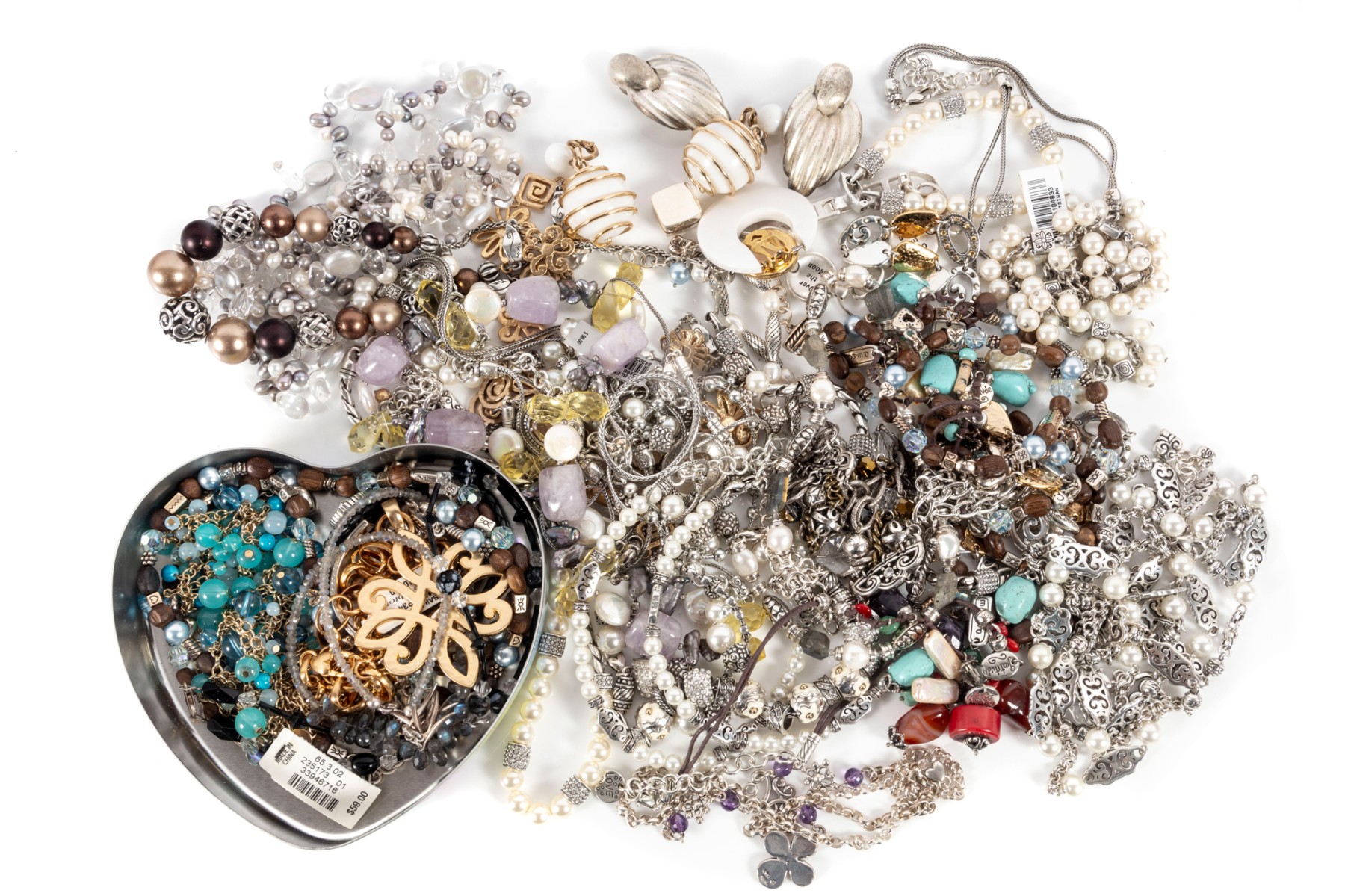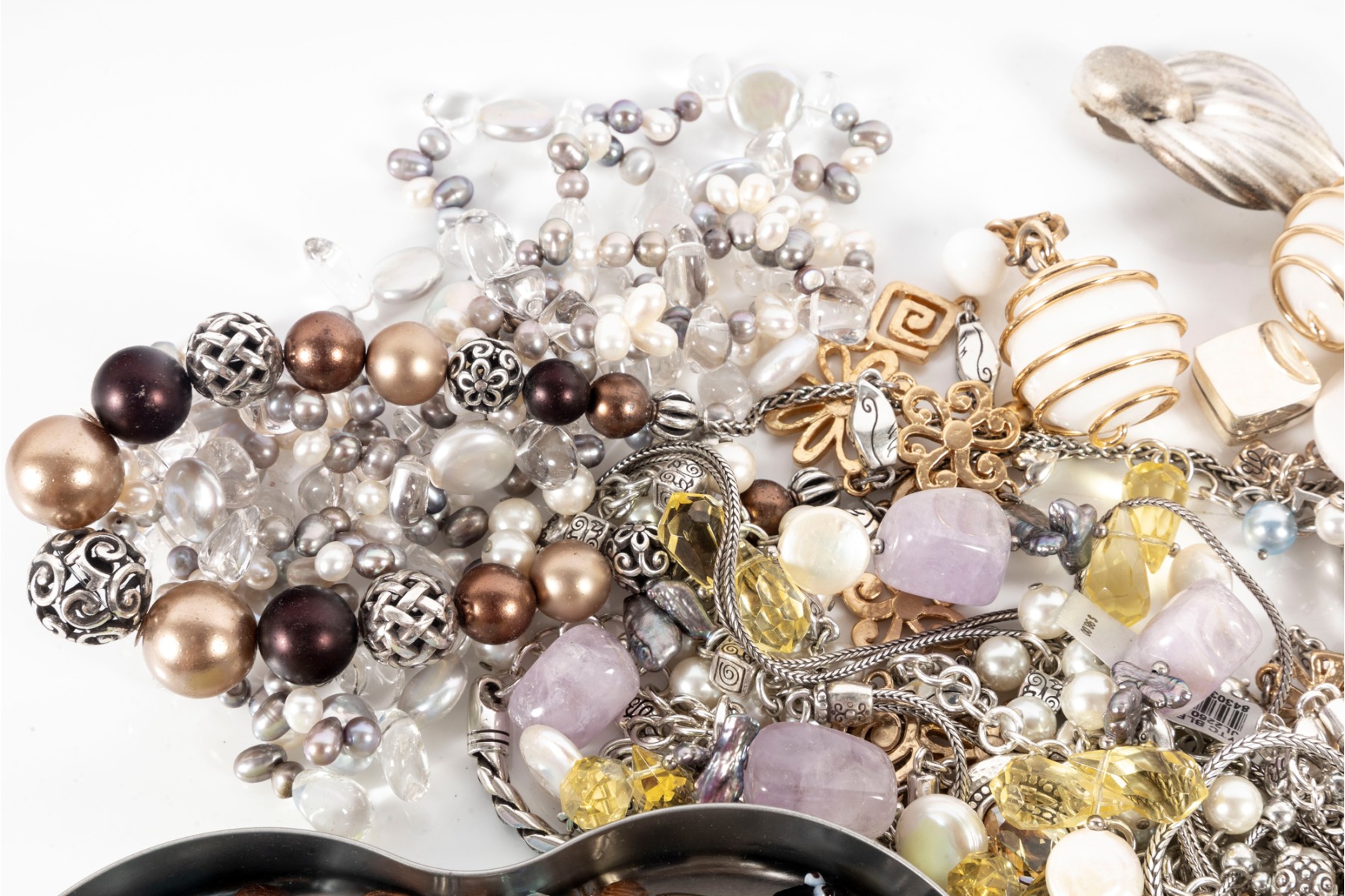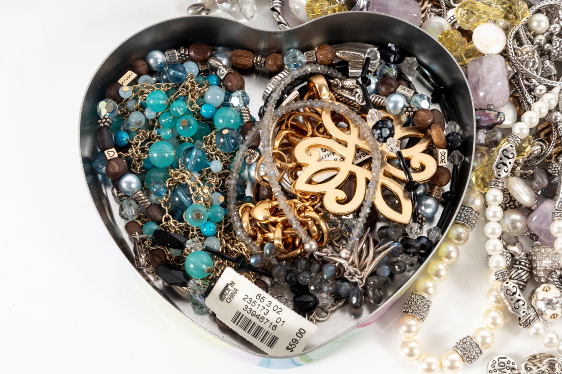 A fabulous collection of Brighton fashion jewelry including a handful of heart-shaped metal tins. Features a variety of necklaces with faux and cultured pearls.