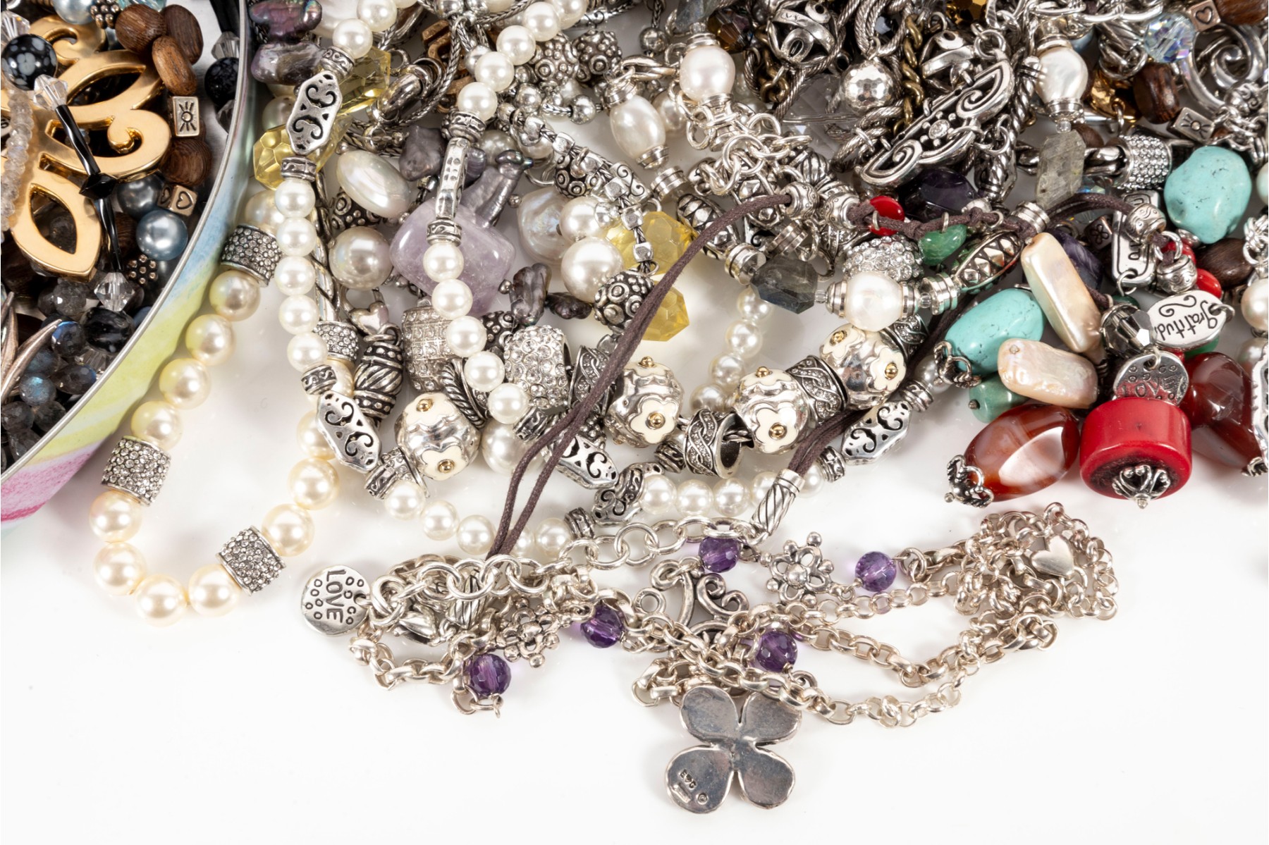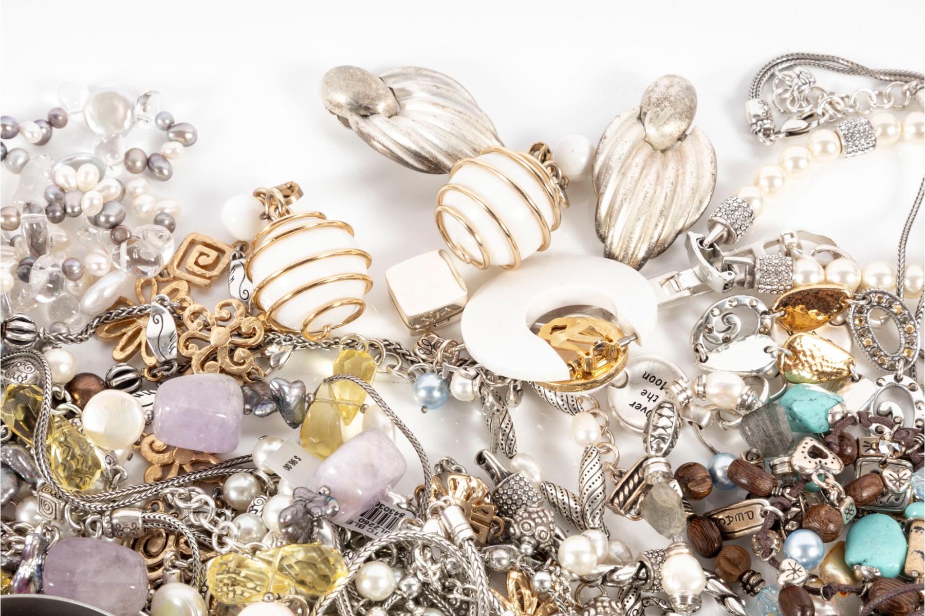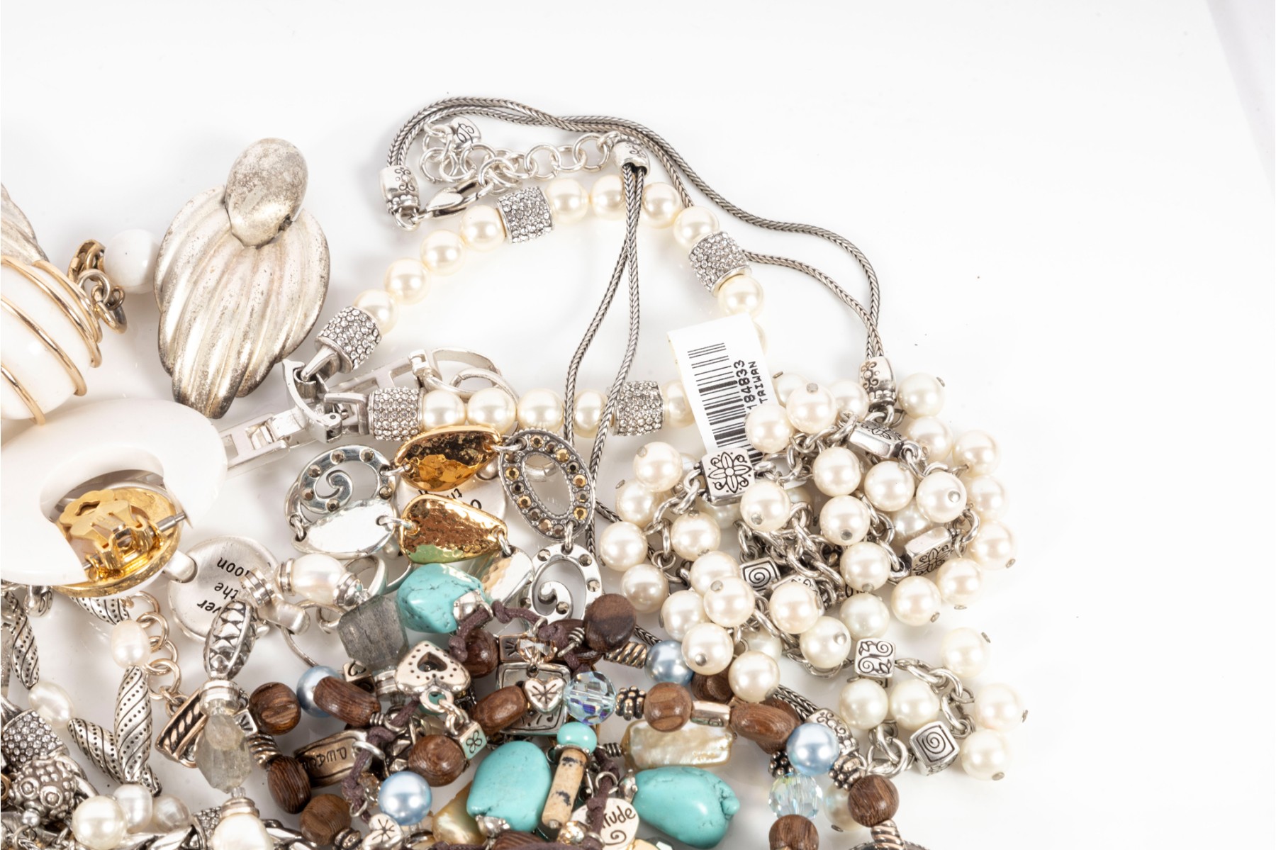 A fabulous collection of Brighton fashion jewelry including a handful of heart-shaped metal tins. Features a variety of necklaces with faux and cultured pearls.
