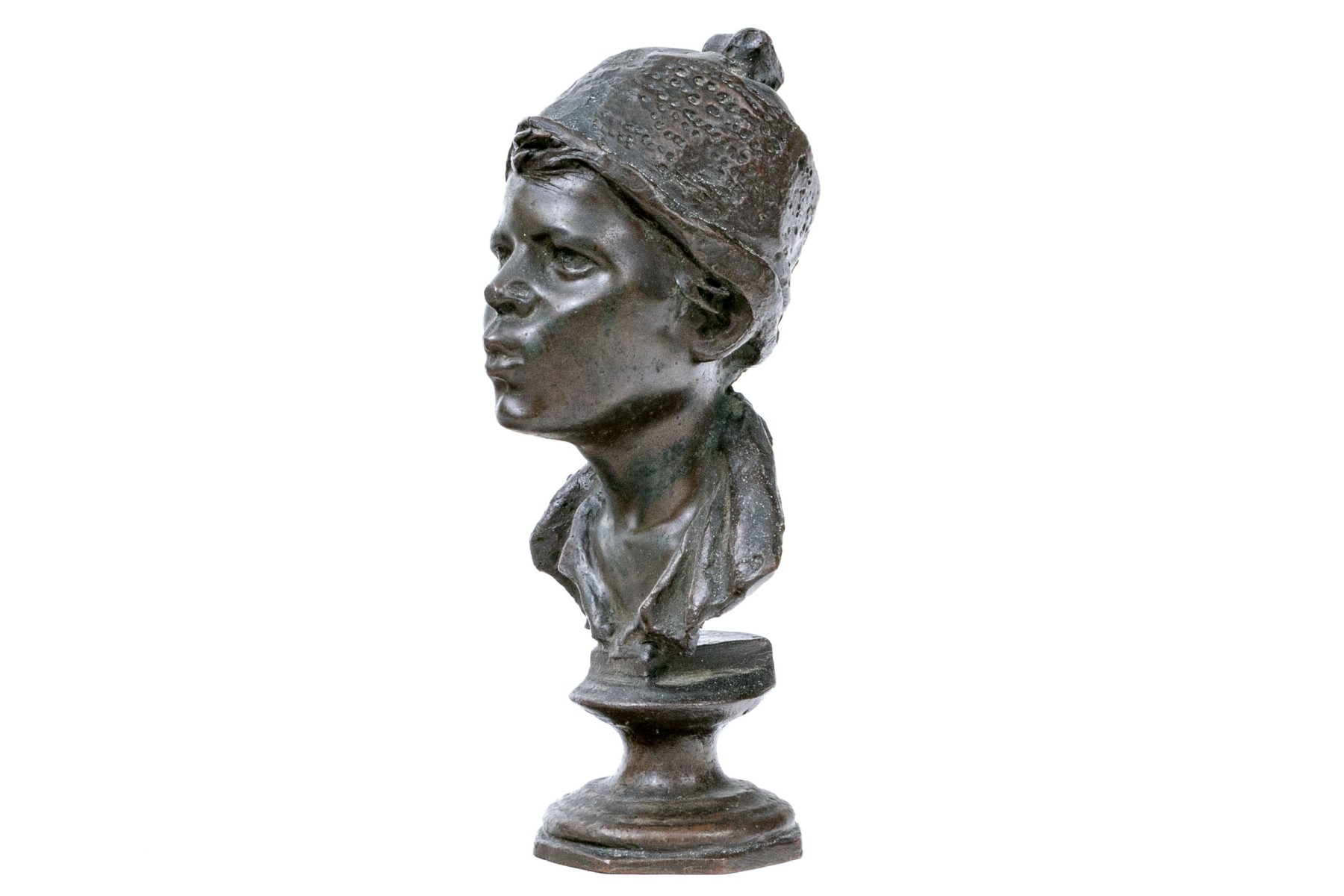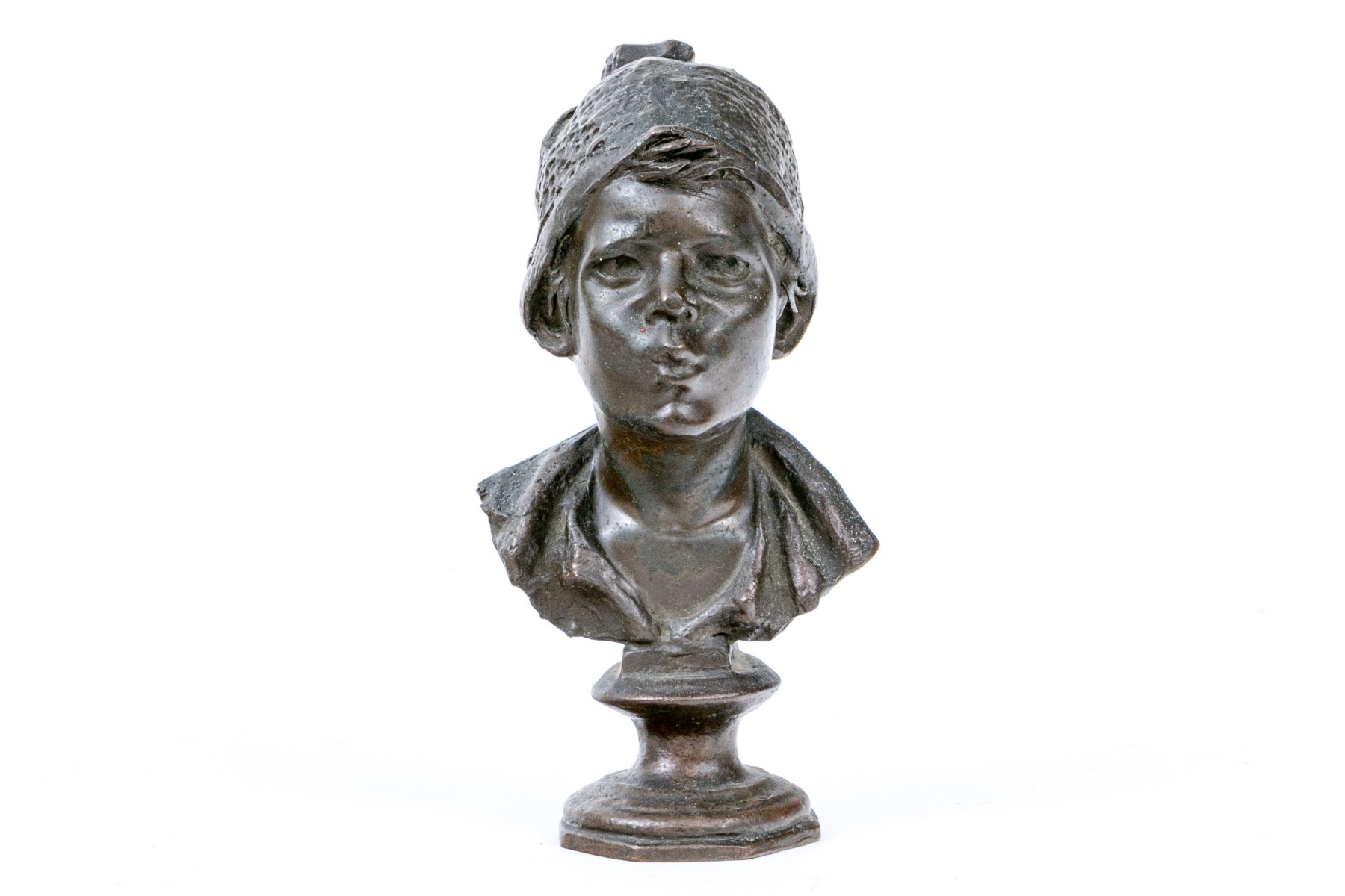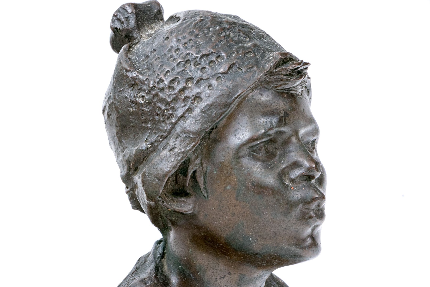 A bronze bust attributed to Giovanni de Martino (Italian, 1870-1935) depicting a boy with pursed lips wearing a hat. Wonderfully detailed and with a nice chocolate patina.