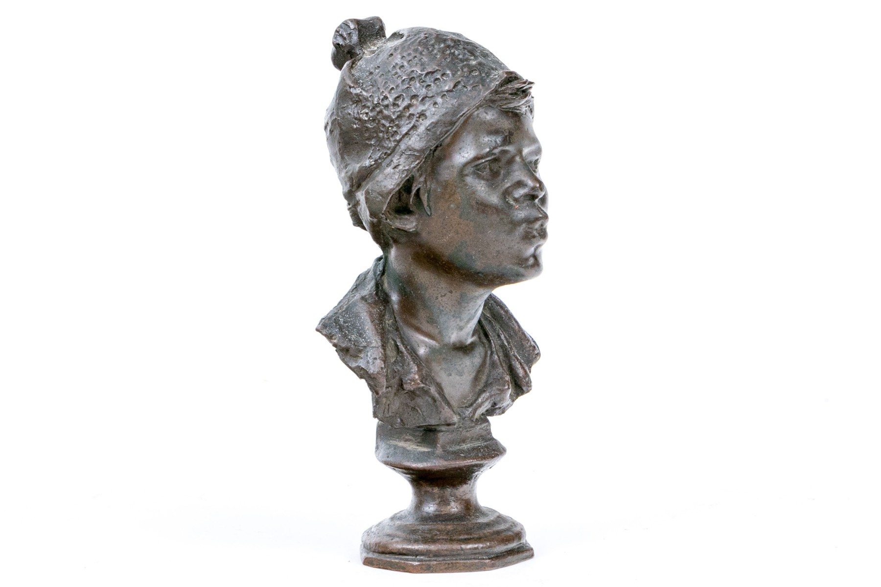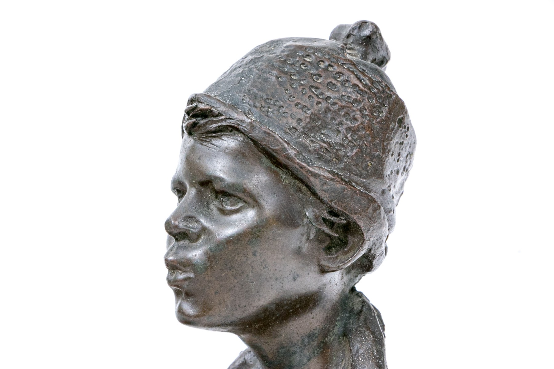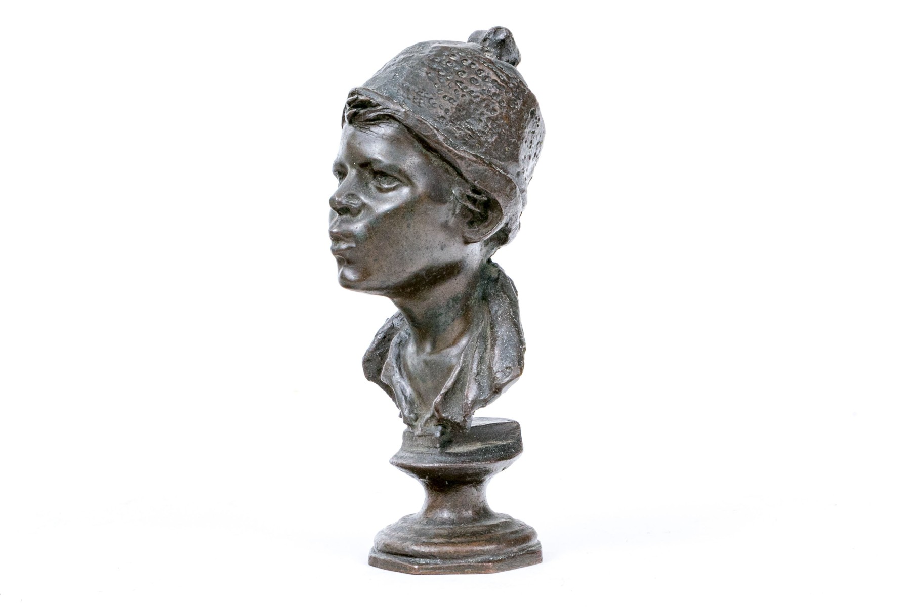 A bronze bust attributed to Giovanni de Martino (Italian, 1870-1935) depicting a boy with pursed lips wearing a hat. Wonderfully detailed and with a nice chocolate patina.