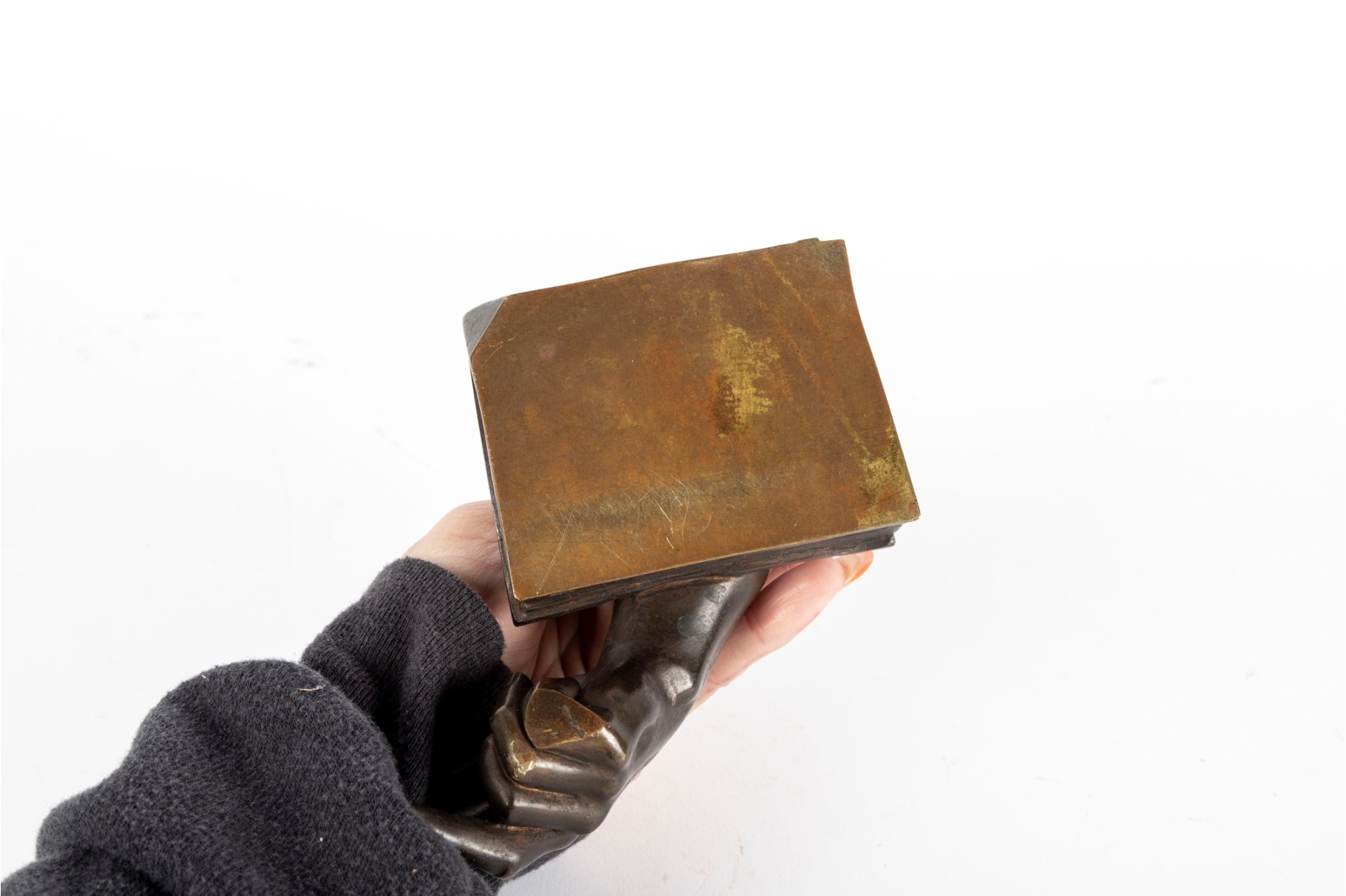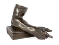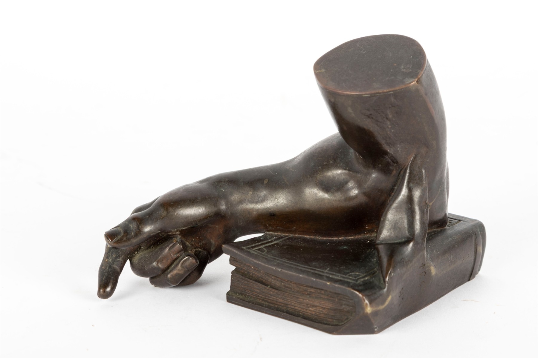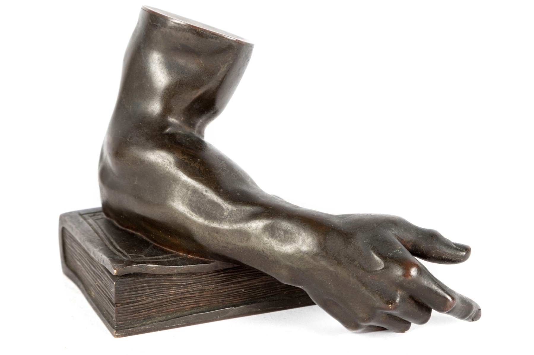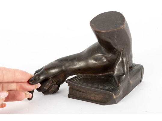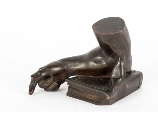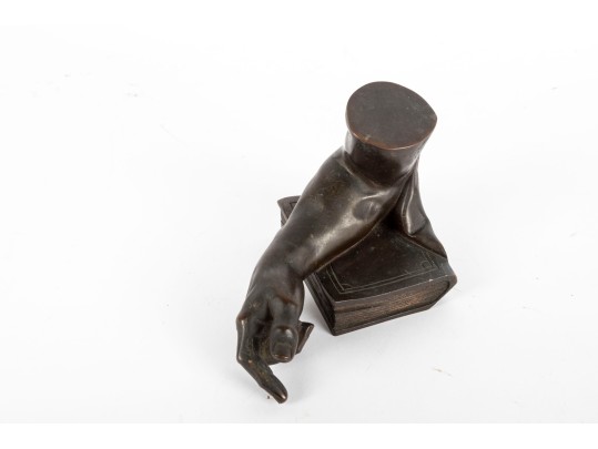 A fabulous bronze figurine of a man's arm with the elbow resting on a thick book. Beautifully detailed, perfect for use as shelf decor or a bookend.