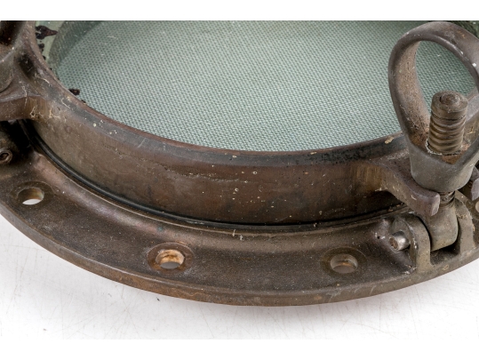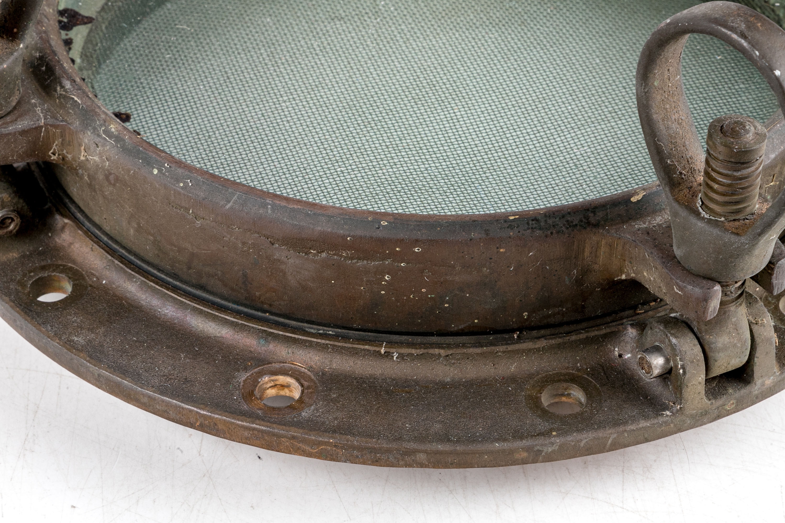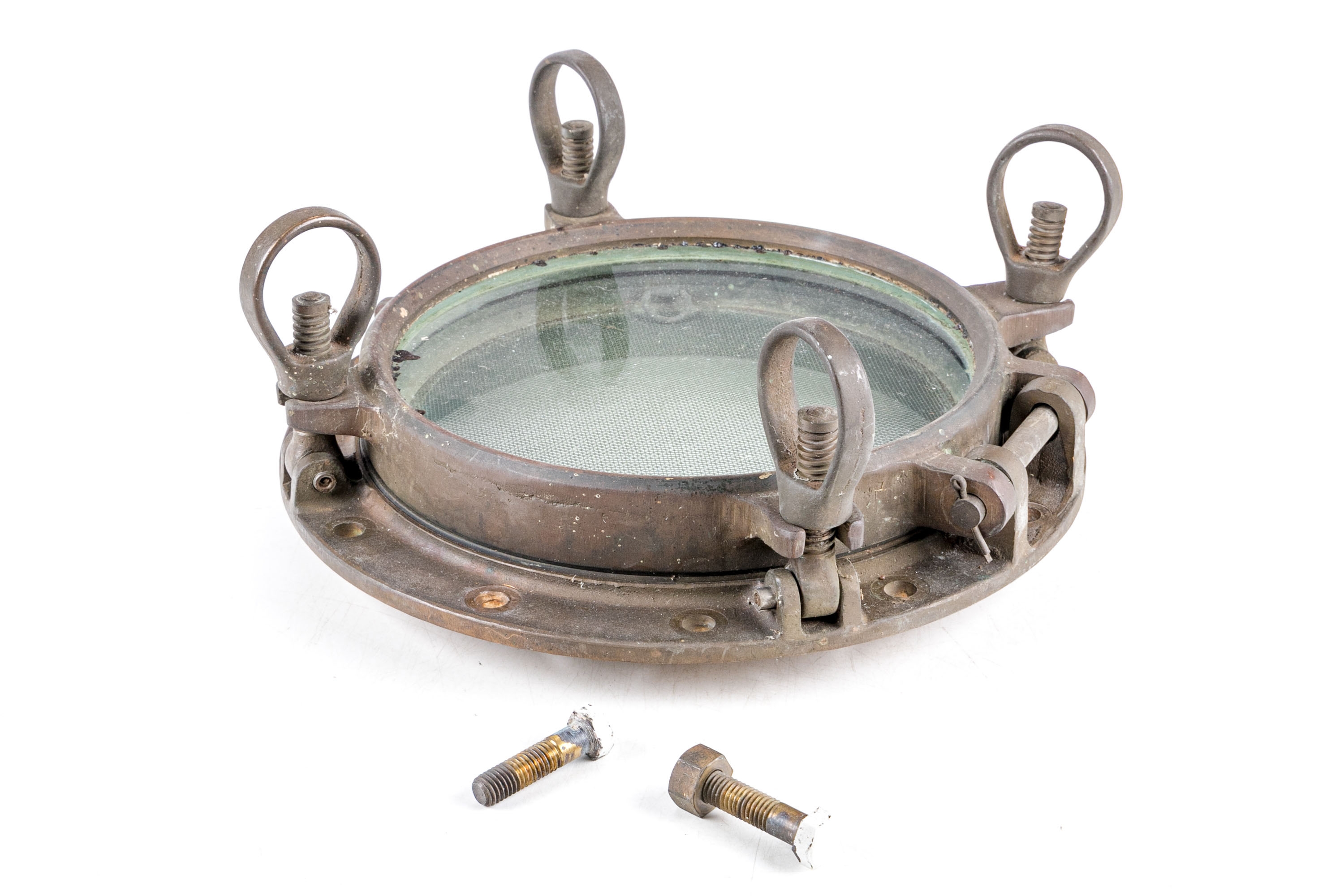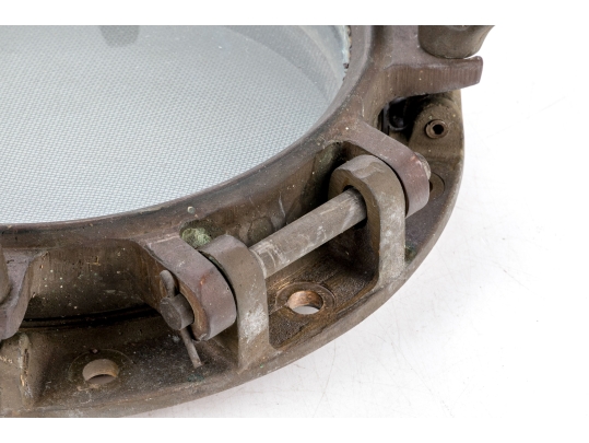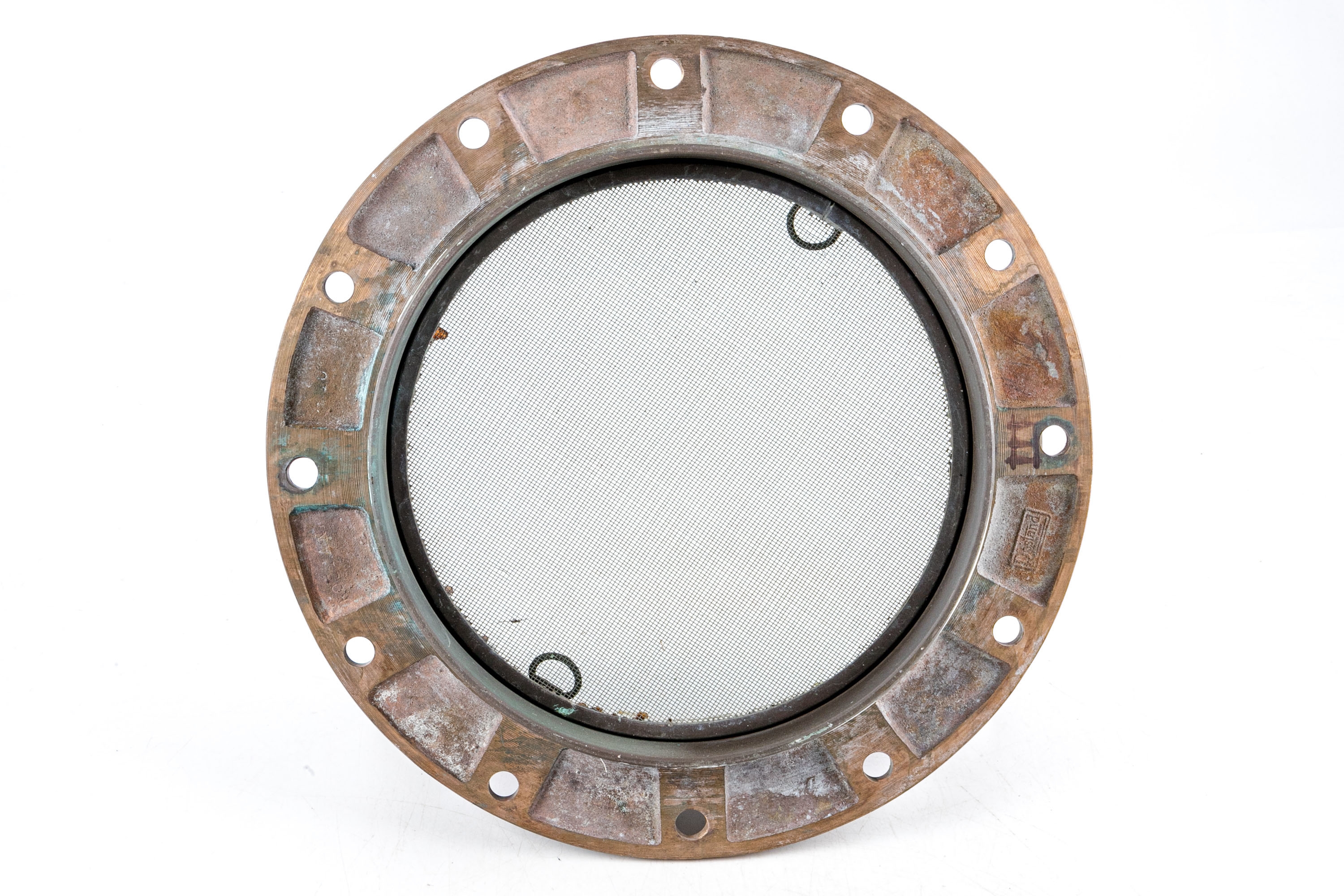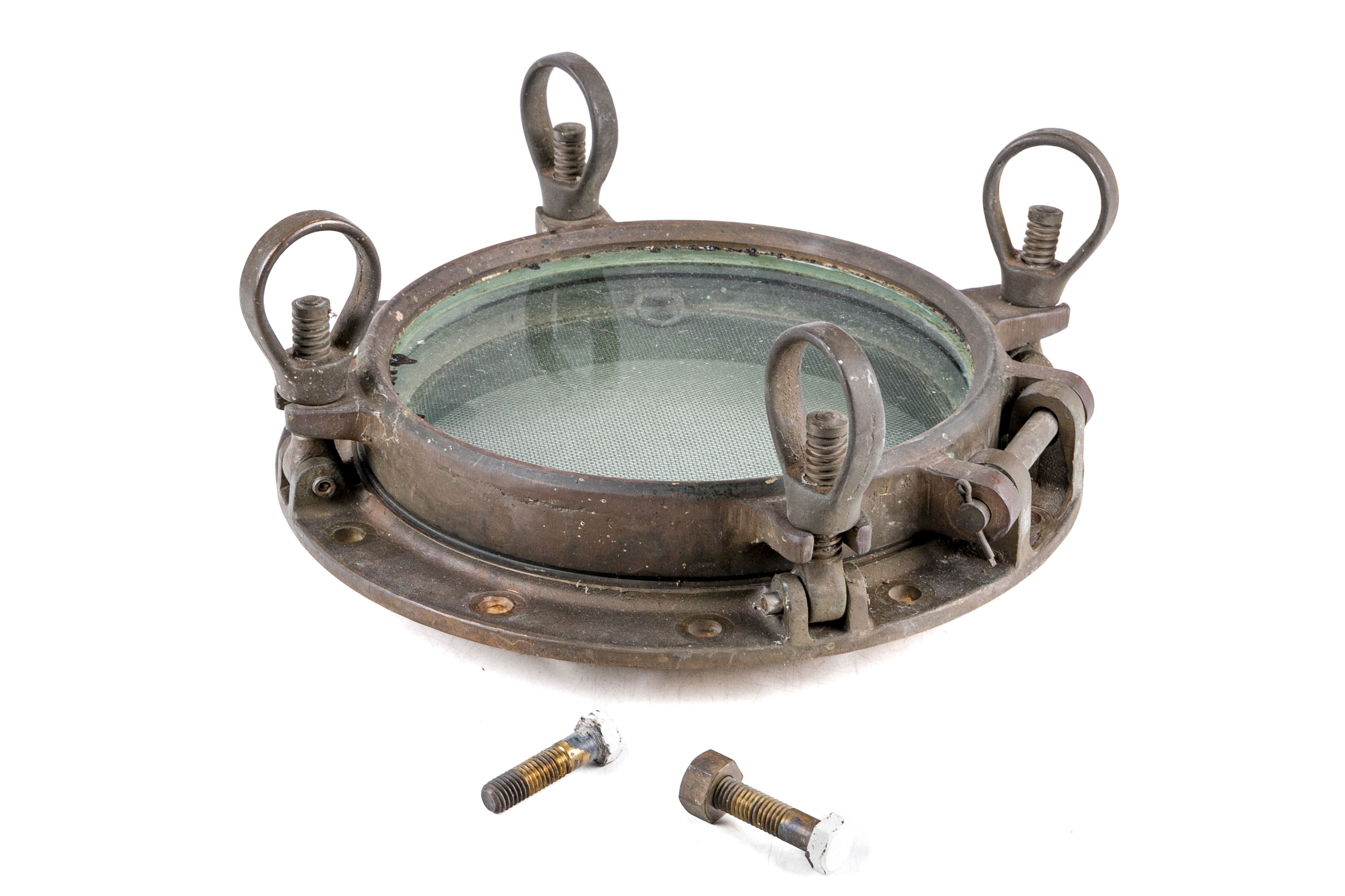 Industrial Age Bronze Porthole With good weight, glass cover with screen and working hatch dogs. There are two accompanying bronze bolts. The Bronze has a great age patina and fine Nautical presentation.