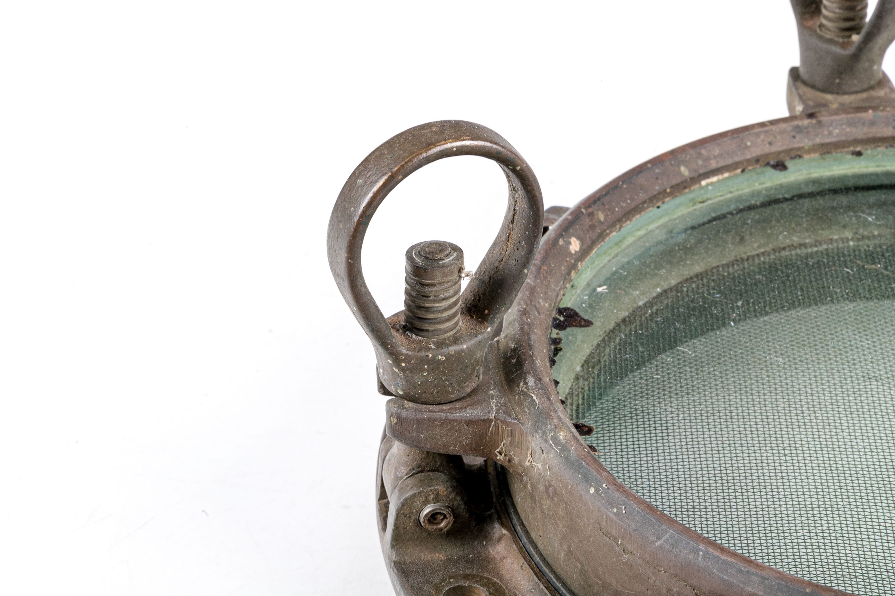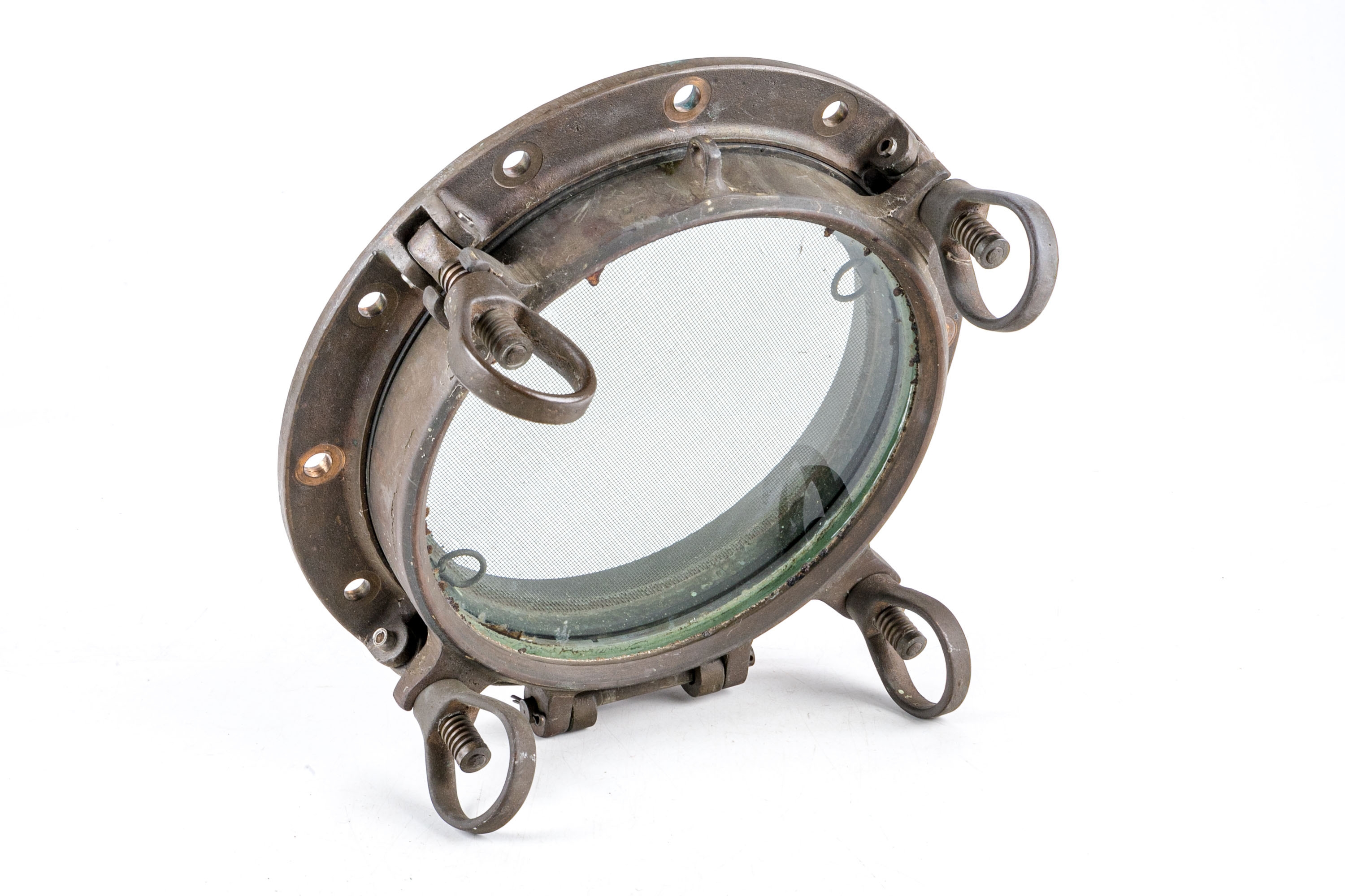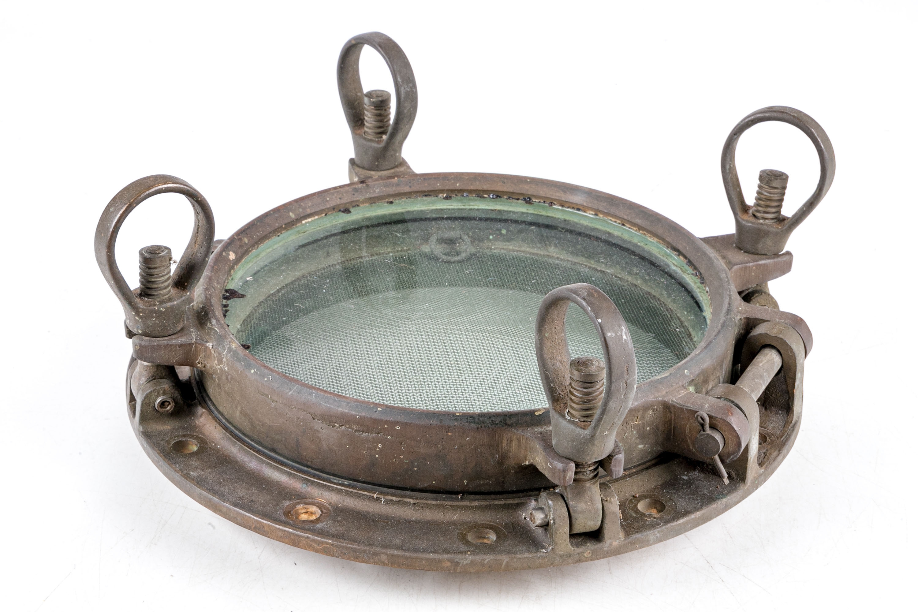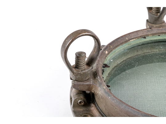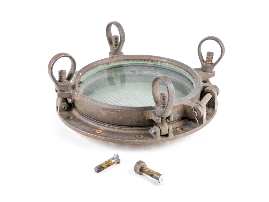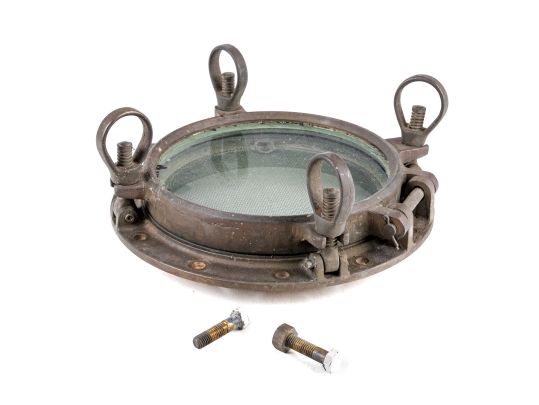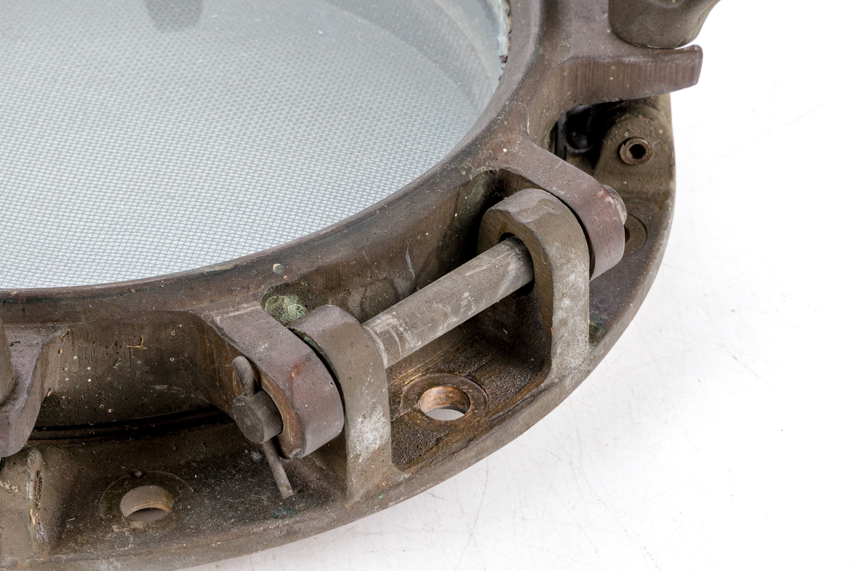 Industrial Age Bronze Porthole With good weight, glass cover with screen and working hatch dogs. There are two accompanying bronze bolts. The Bronze has a great age patina and fine Nautical presentation.