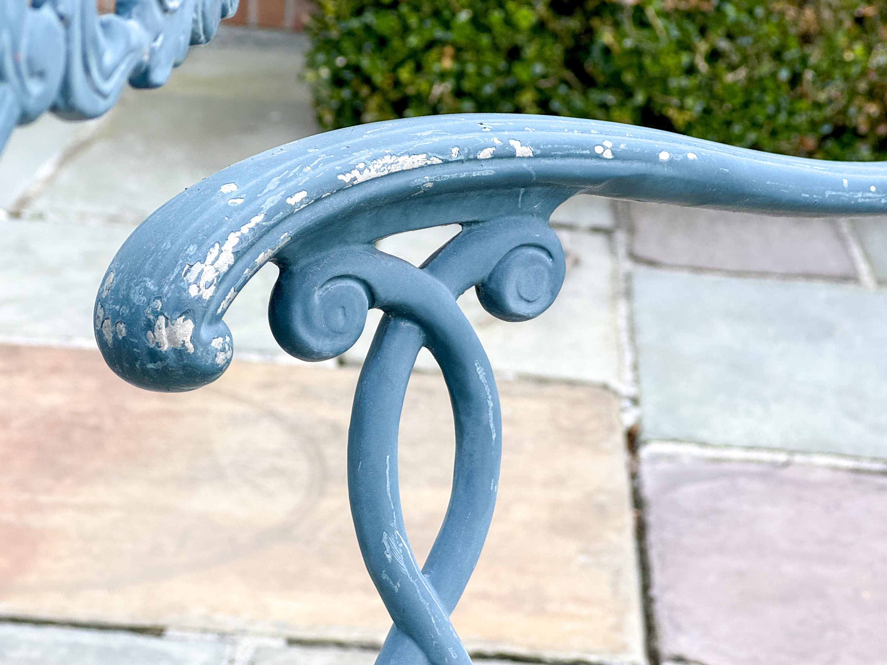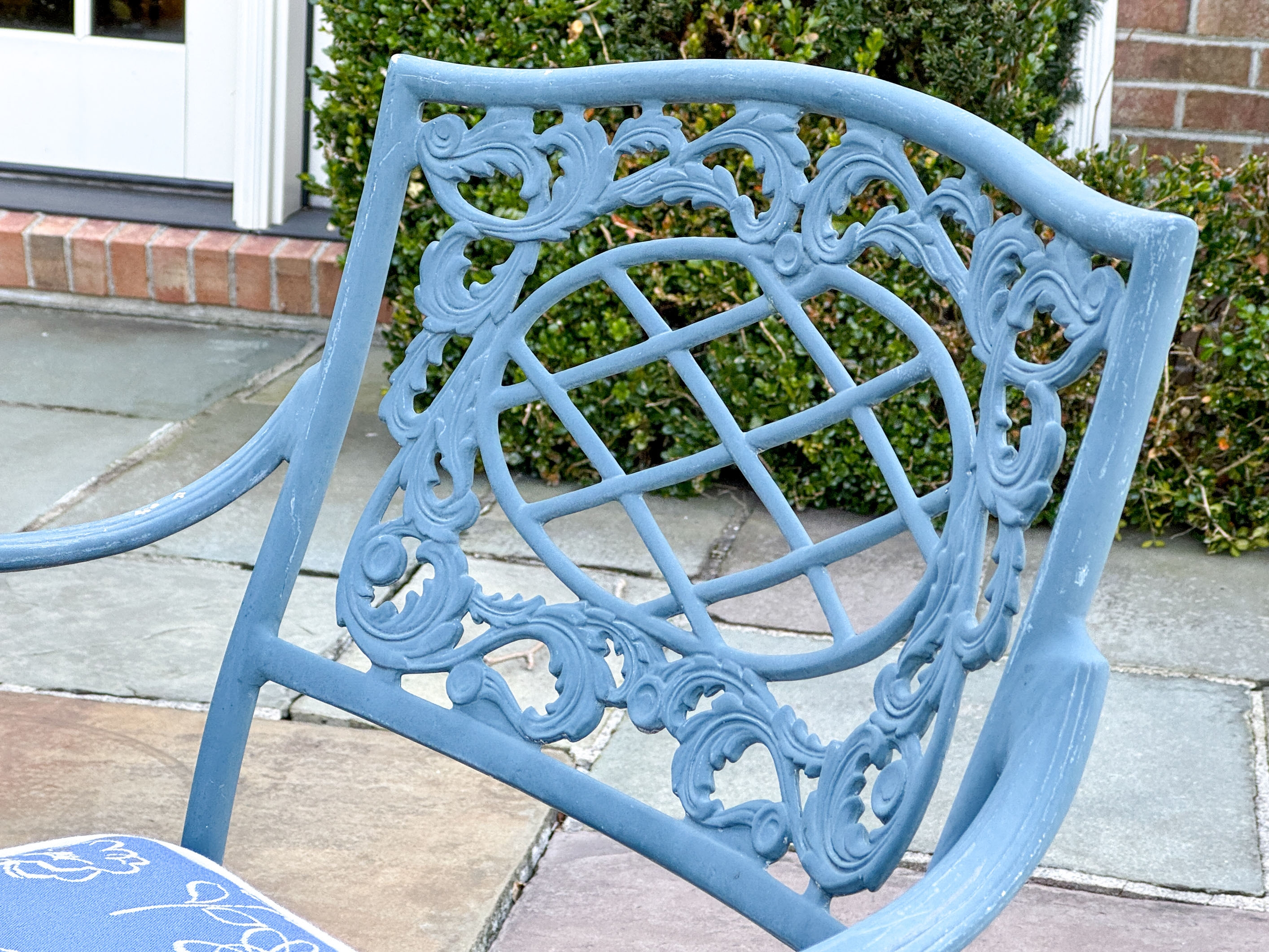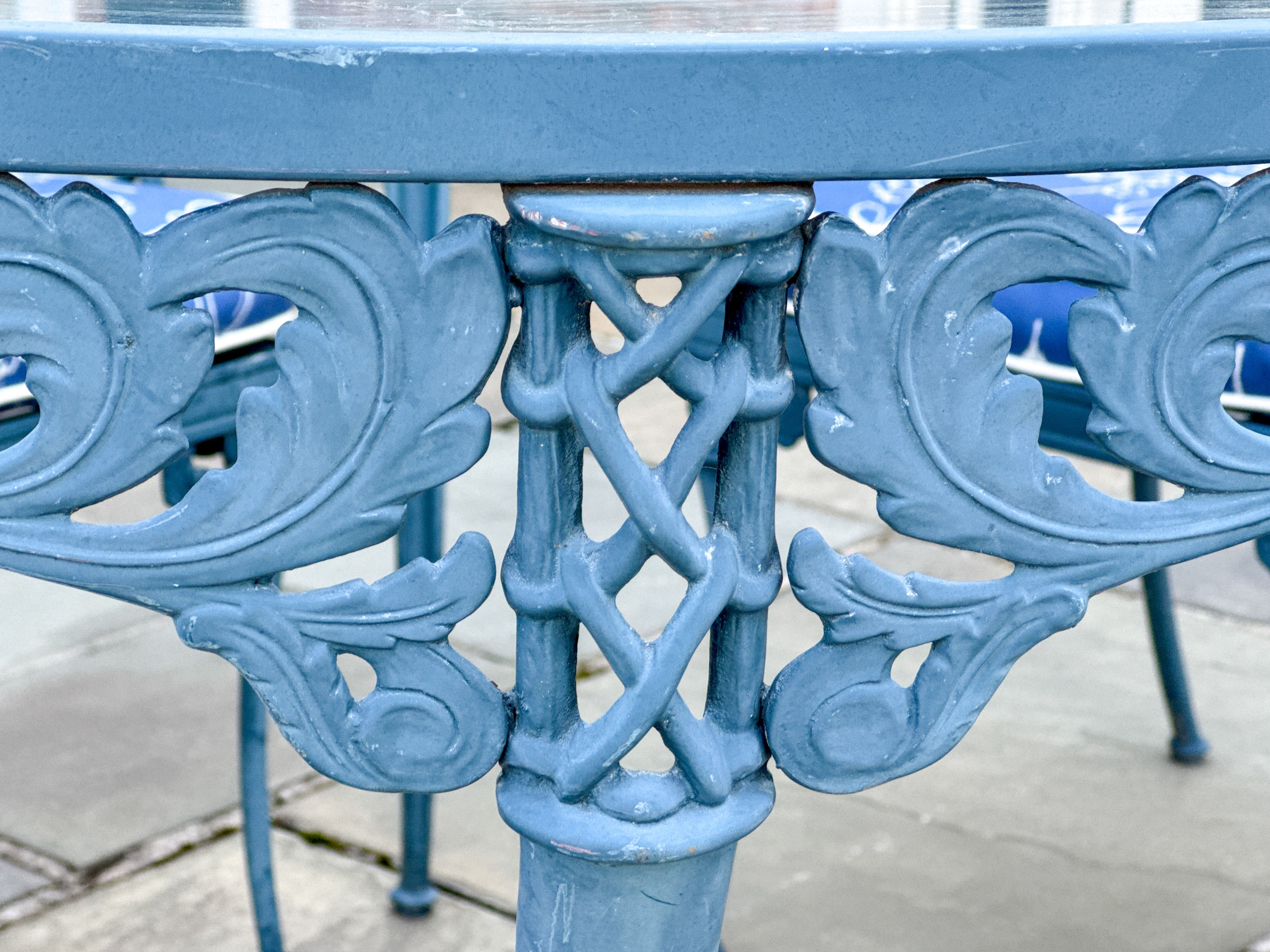An excellent Brown Jordan "Elegance" outdoor dining suite in beautiful subtle verdigris teal powder-coated hue on cast aluminum frames. The large round dining table features a glass top over a beautiful apron of scrolled openwork, complementing four armchairs with bowed top rails over gorgeous backs with foliage around central oval lattice medallions. The scrolled arms of the chairs are raised on infinity motif vines with pretty foliate brackets around the corners and sleek klismos style legs. Chairs include beautiful royal blue cushions with flower motifs in white, finished with white piped trims.