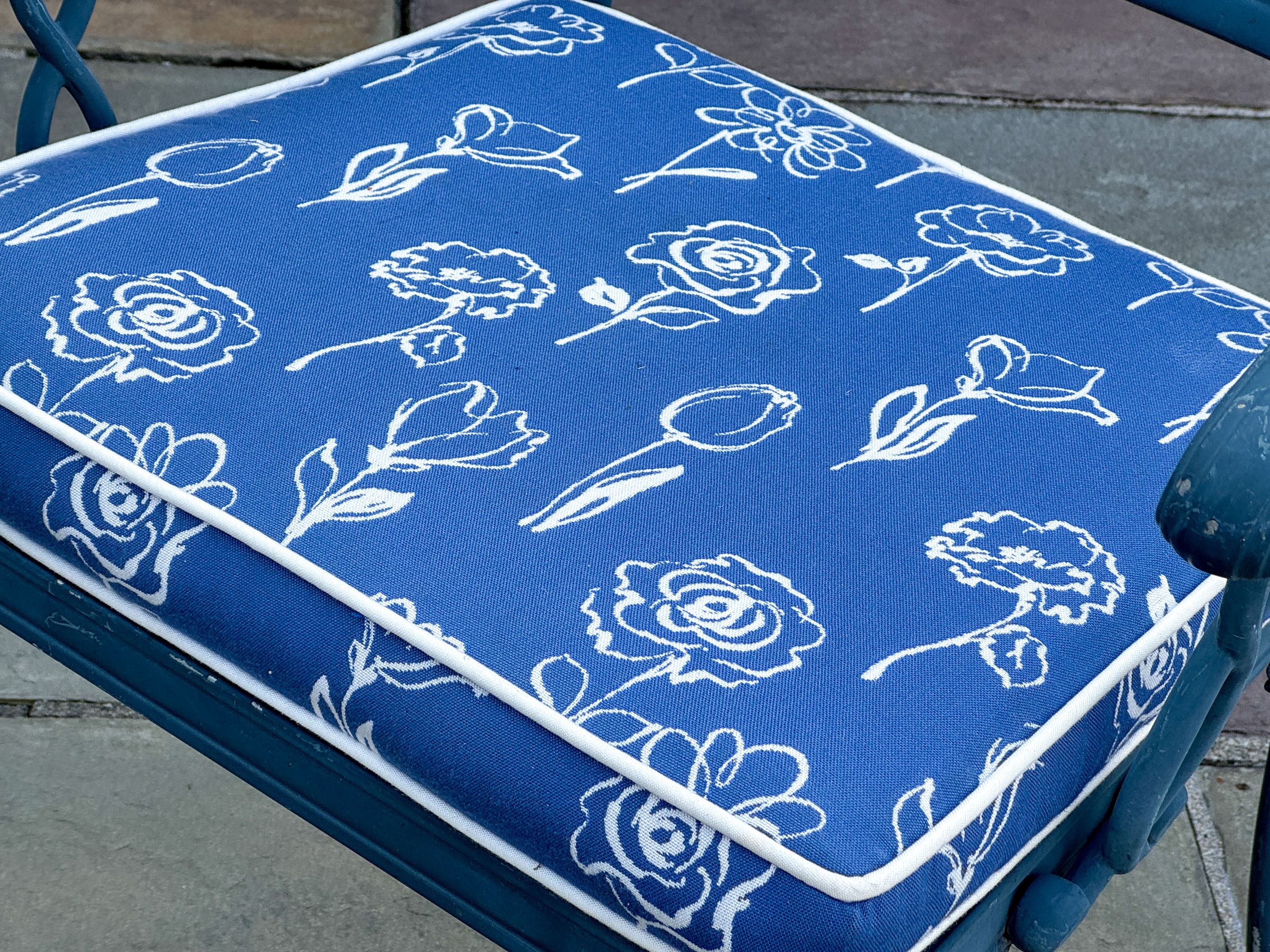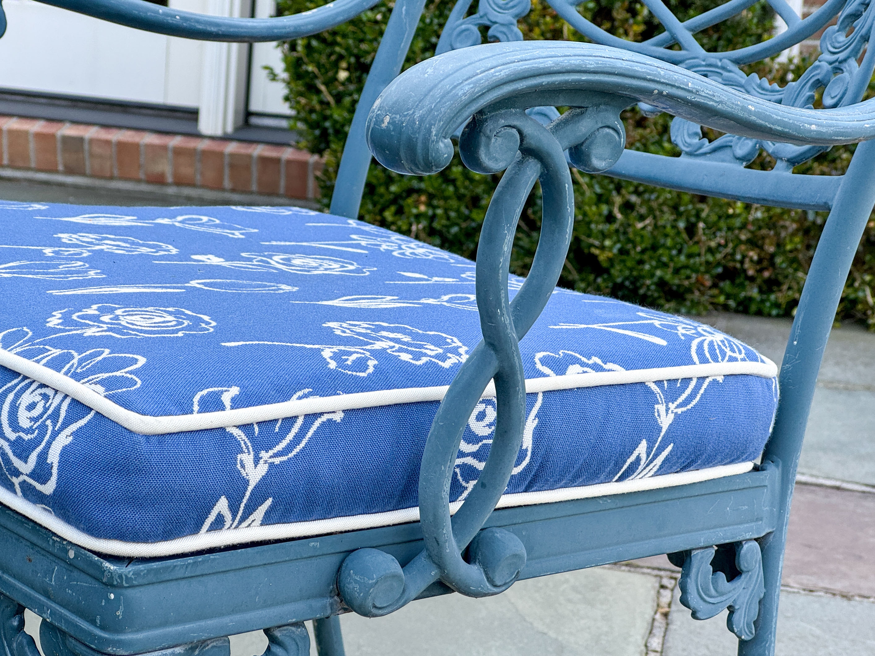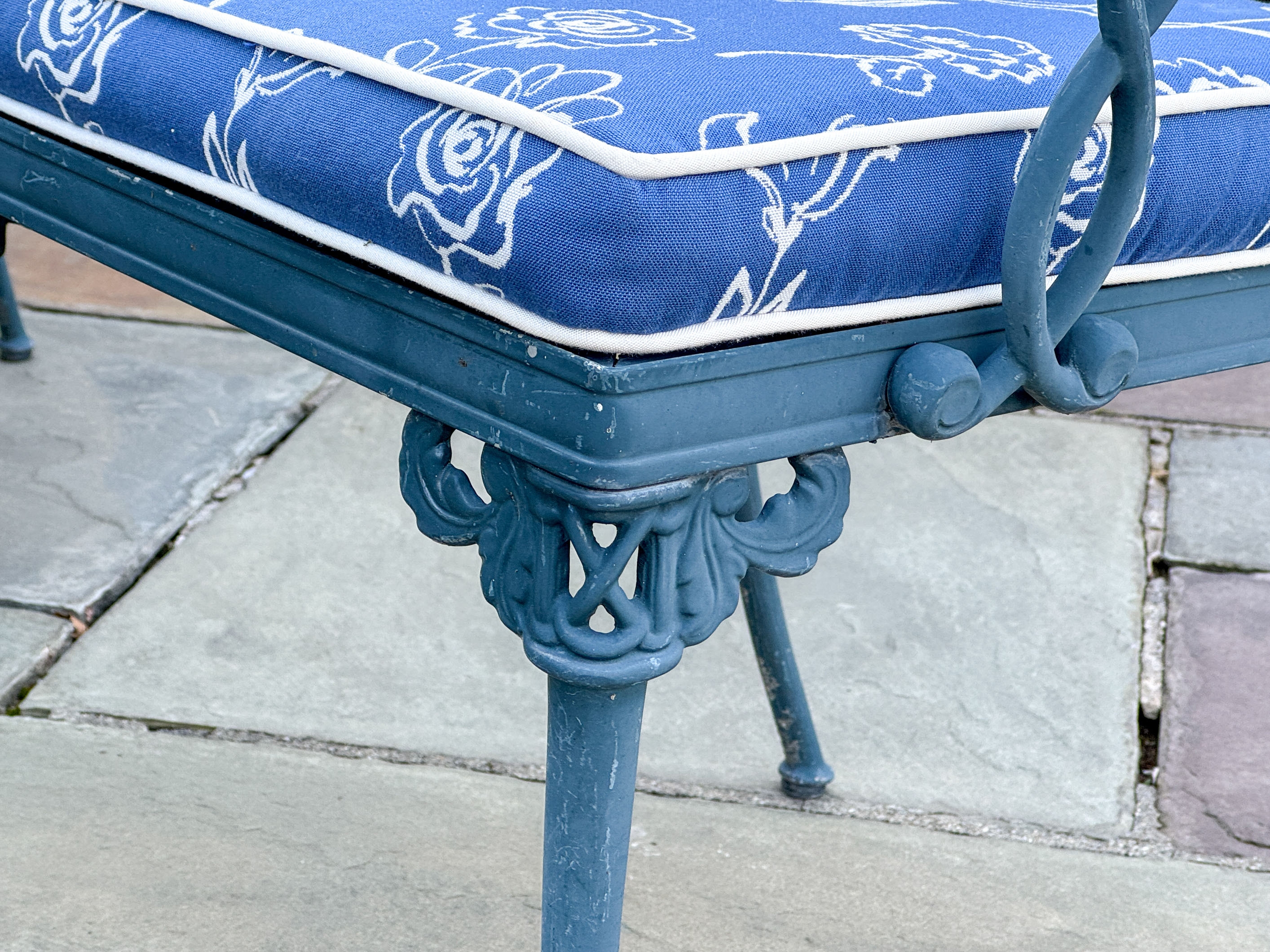 An excellent Brown Jordan "Elegance" outdoor dining suite in beautiful subtle verdigris teal powder-coated hue on cast aluminum frames. The large round dining table features a glass top over a beautiful apron of scrolled openwork, complementing four armchairs with bowed top rails over gorgeous backs with foliage around central oval lattice medallions. The scrolled arms of the chairs are raised on infinity motif vines with pretty foliate brackets around the corners and sleek klismos style legs. Chairs include beautiful royal blue cushions with flower motifs in white, finished with white piped trims.