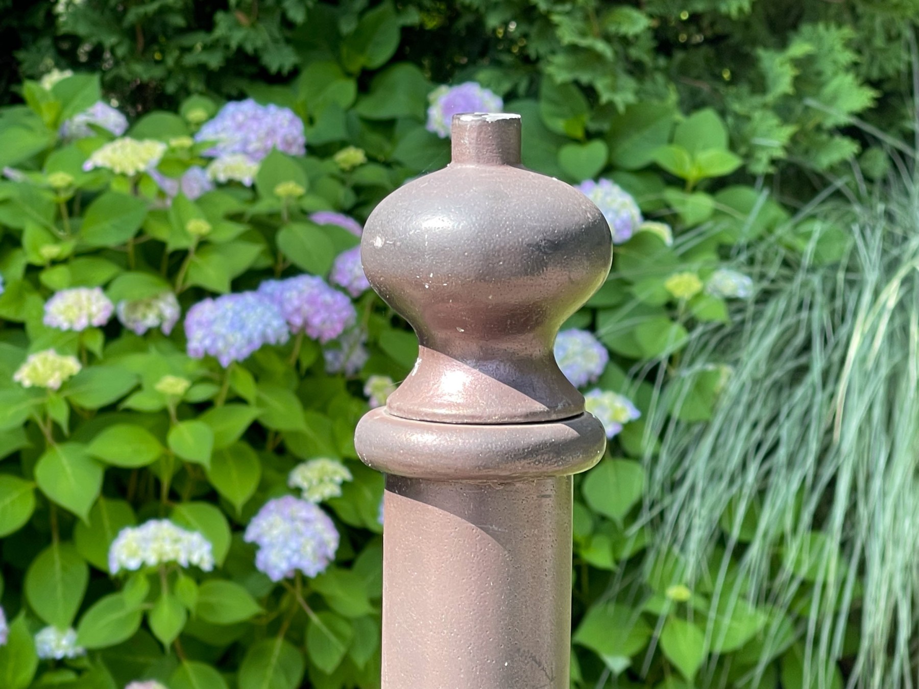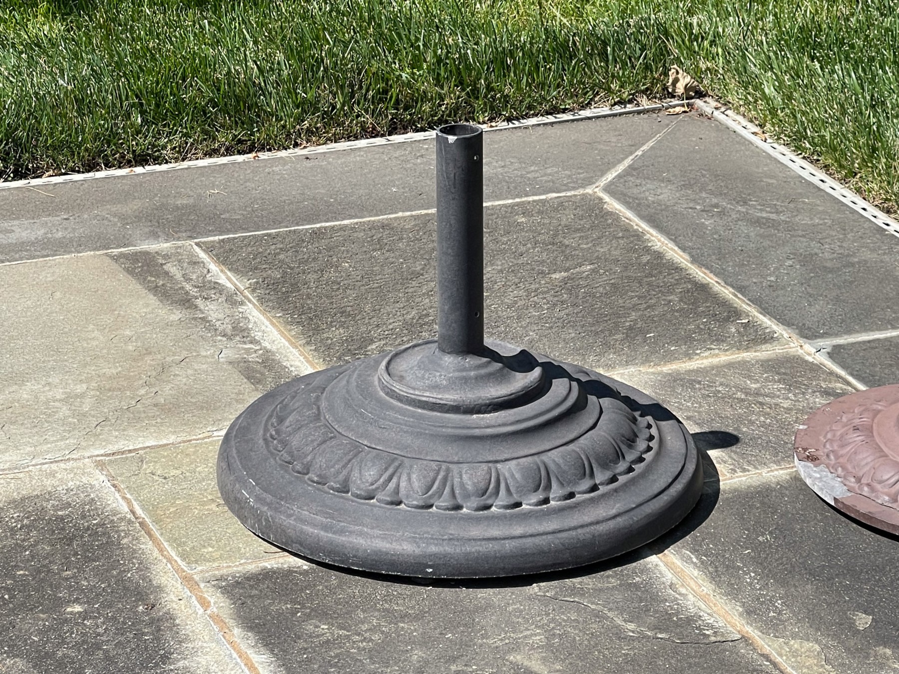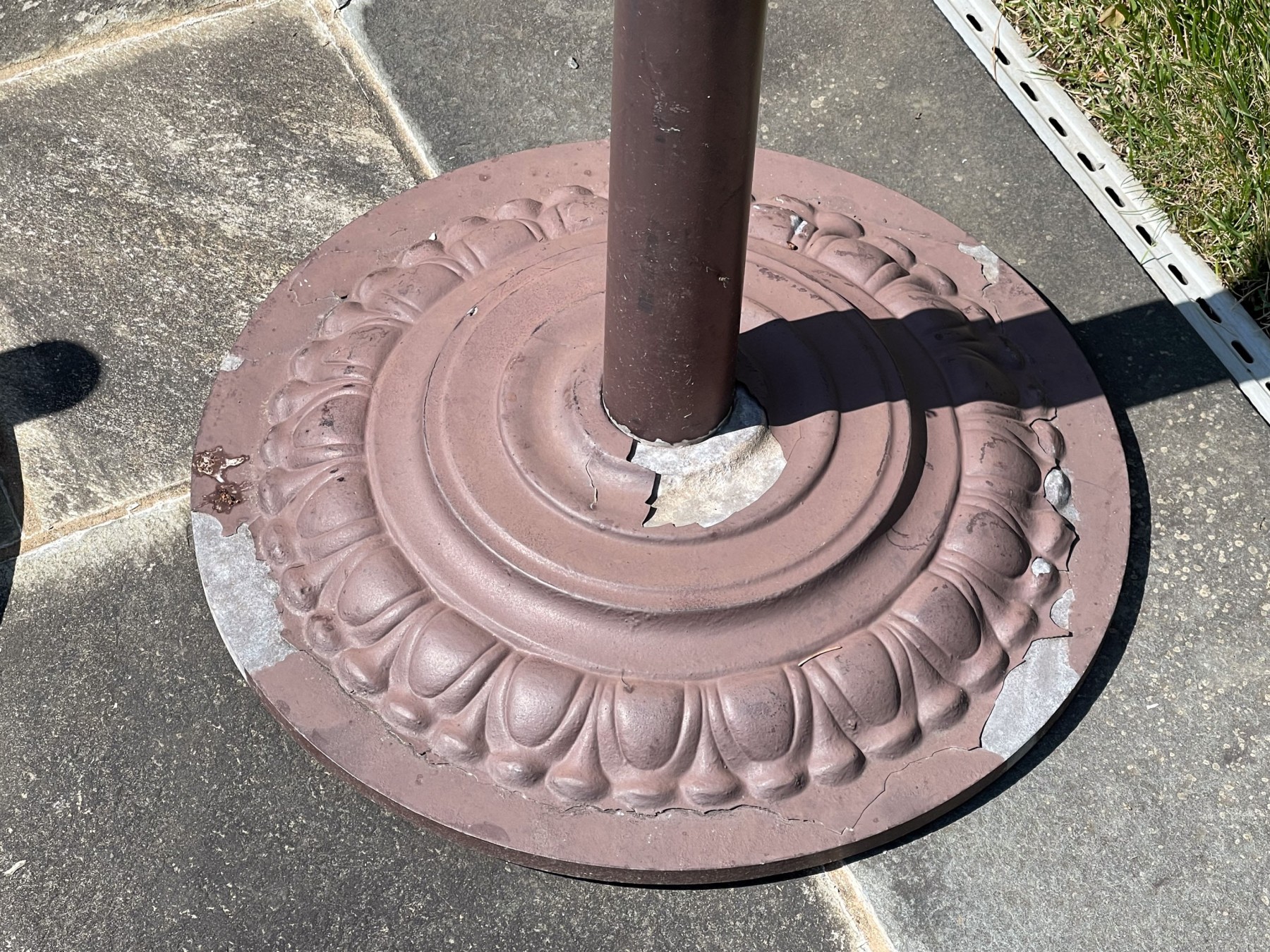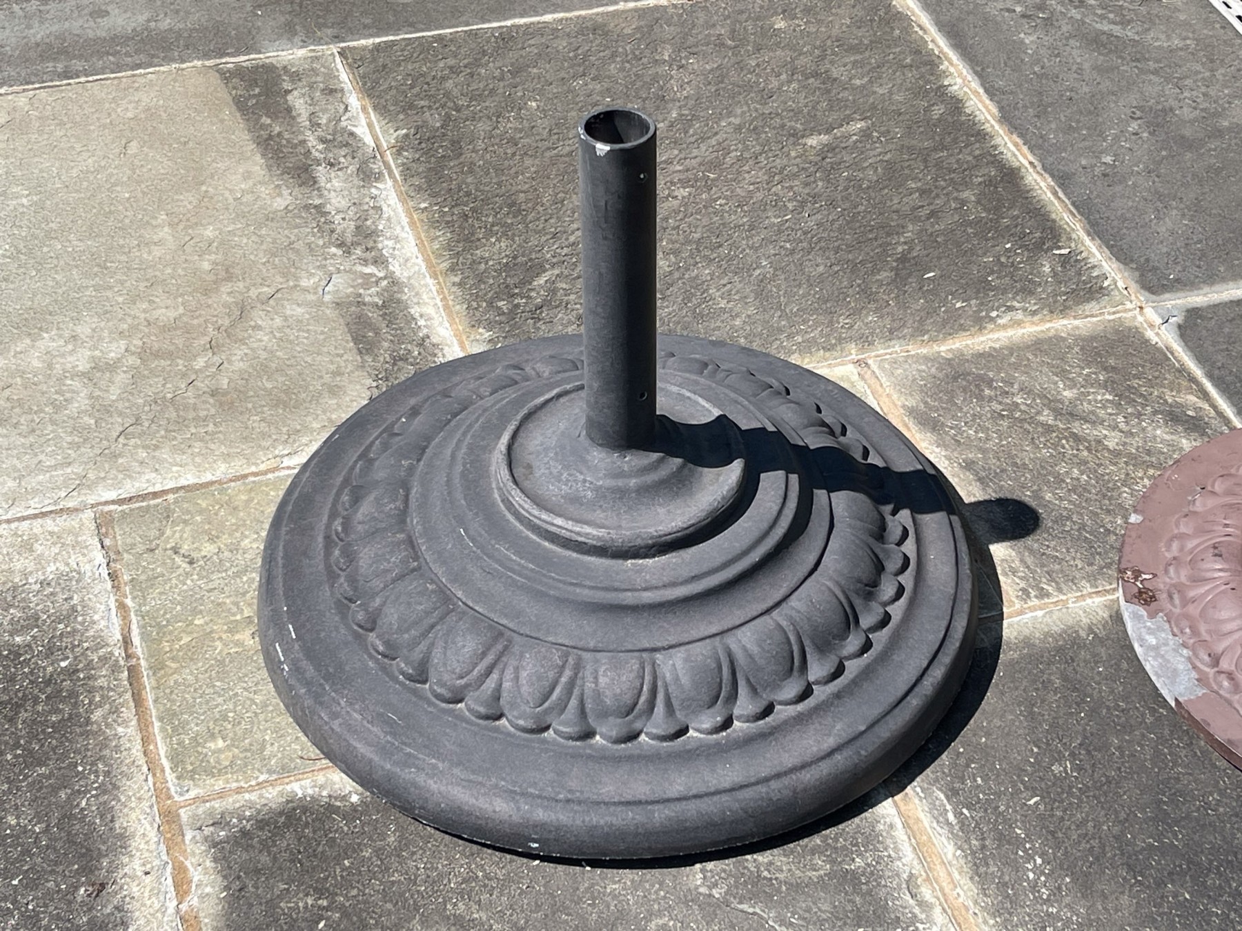 A vintage Brown Jordan towel rack and a umbrella base in a compatible design