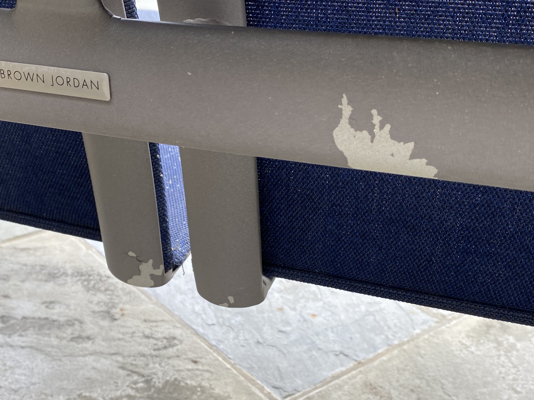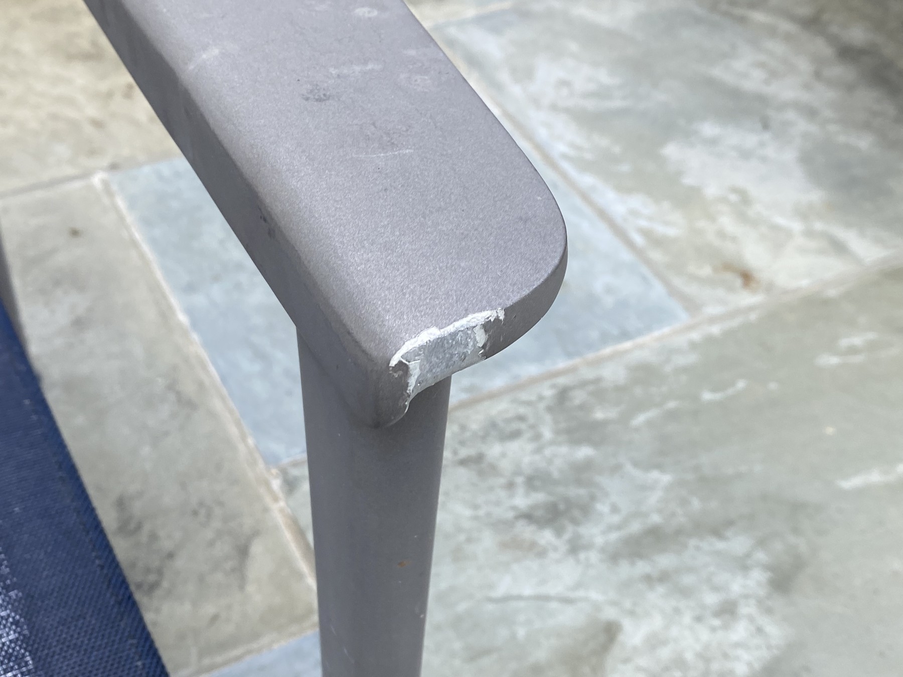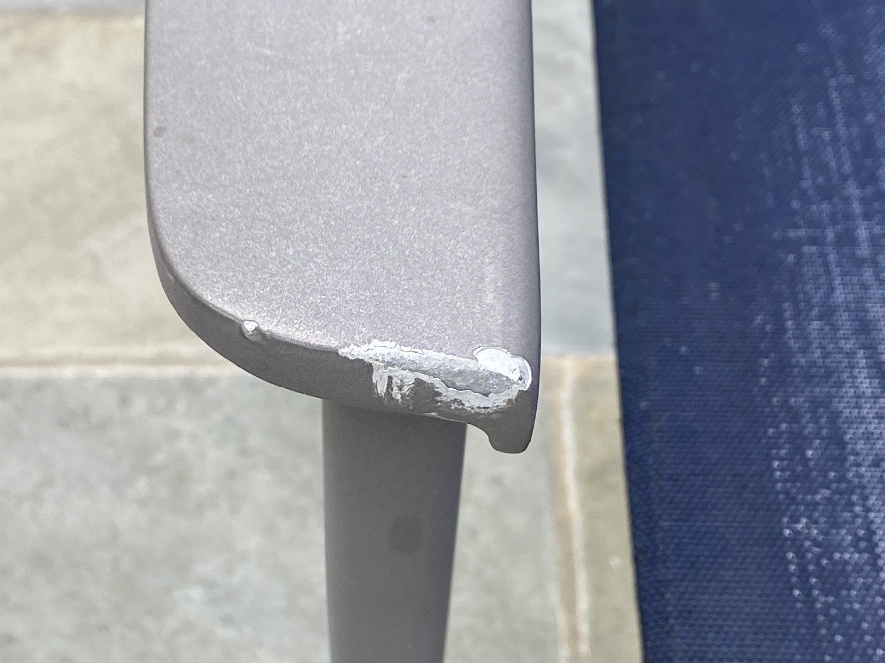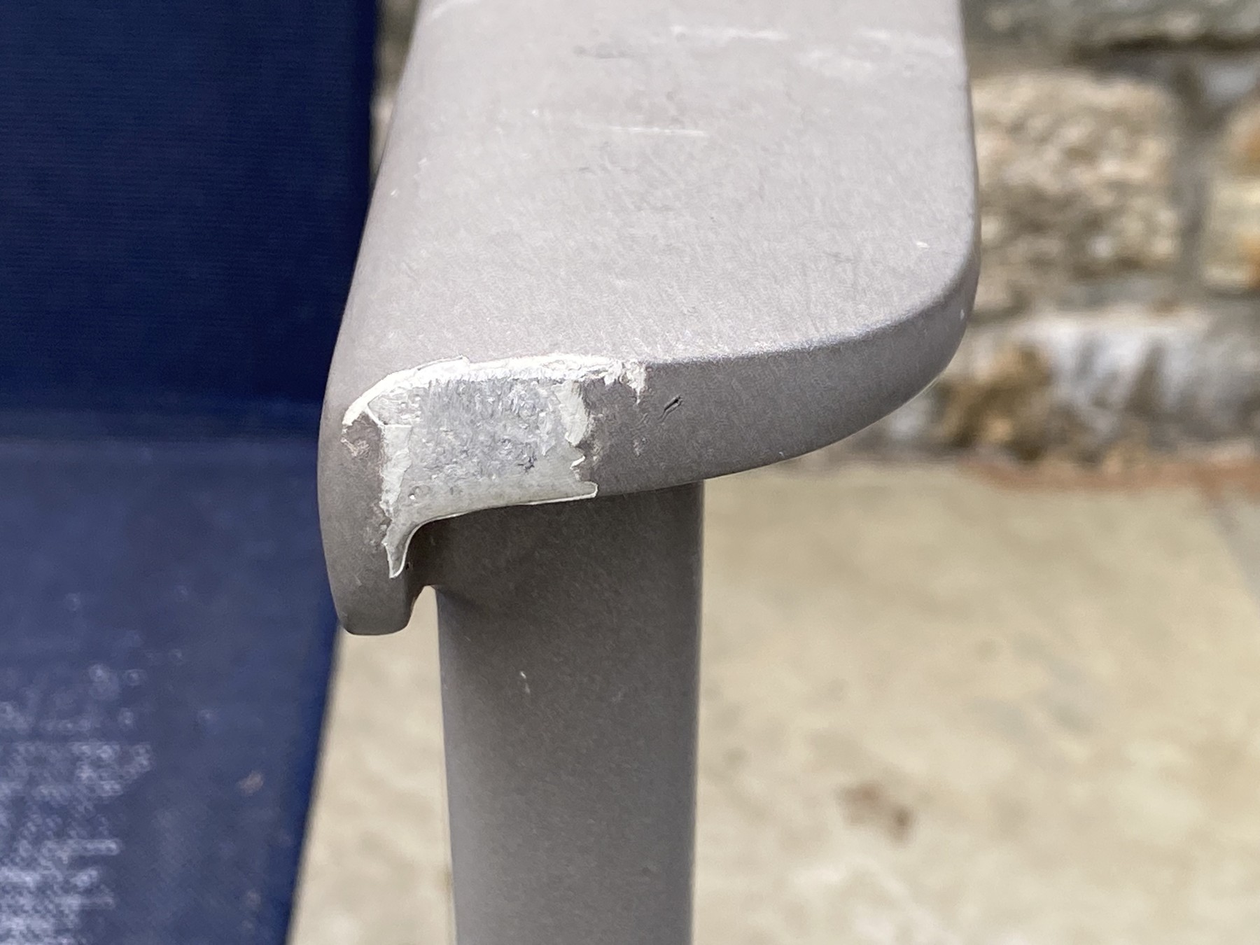 The canvas seats past their useable life, worn, color bleached, the ends of the arms have losses to powder coating along with minor dents to aluminum frames front of arms and side of arms. Please view photos.