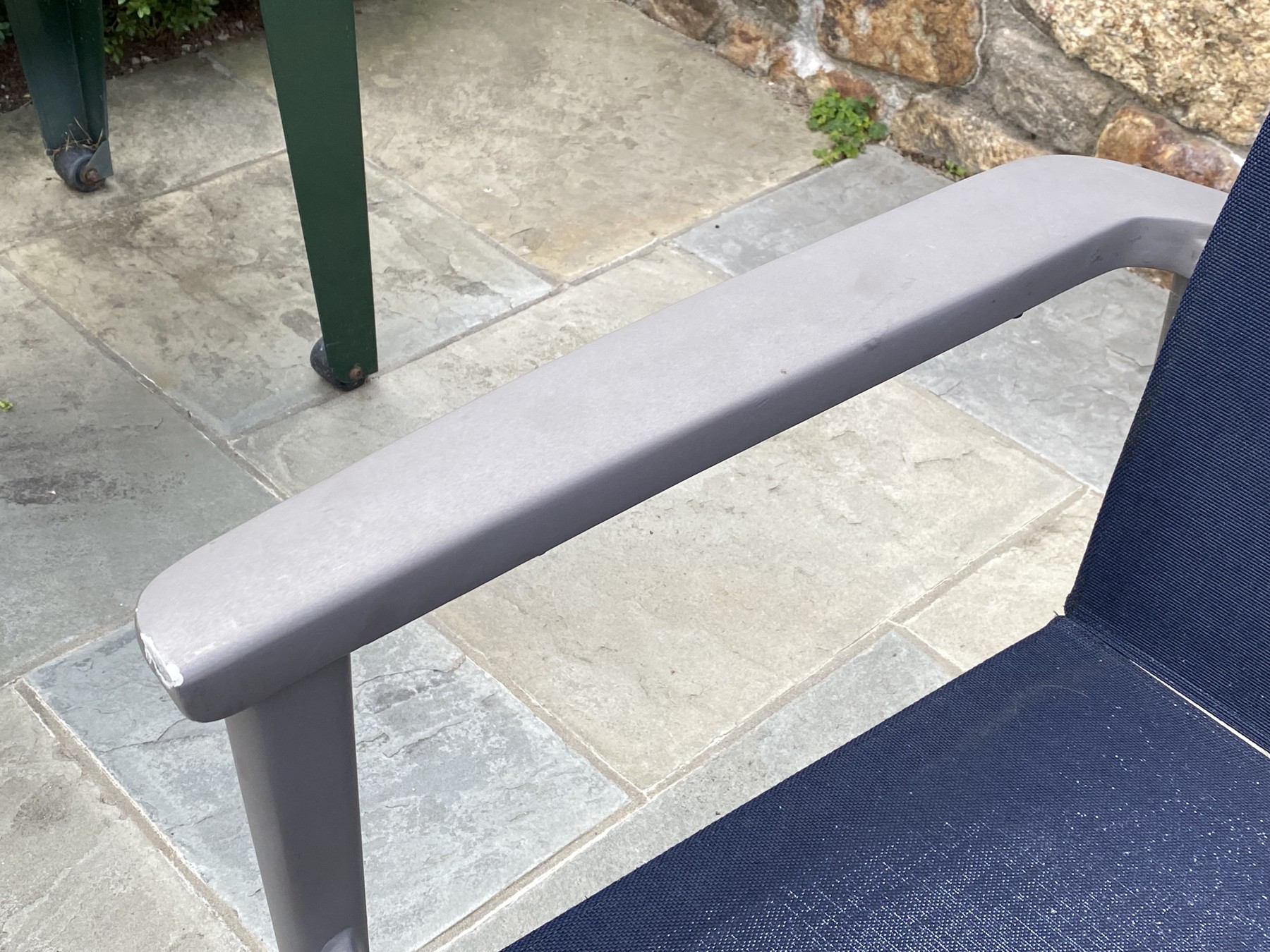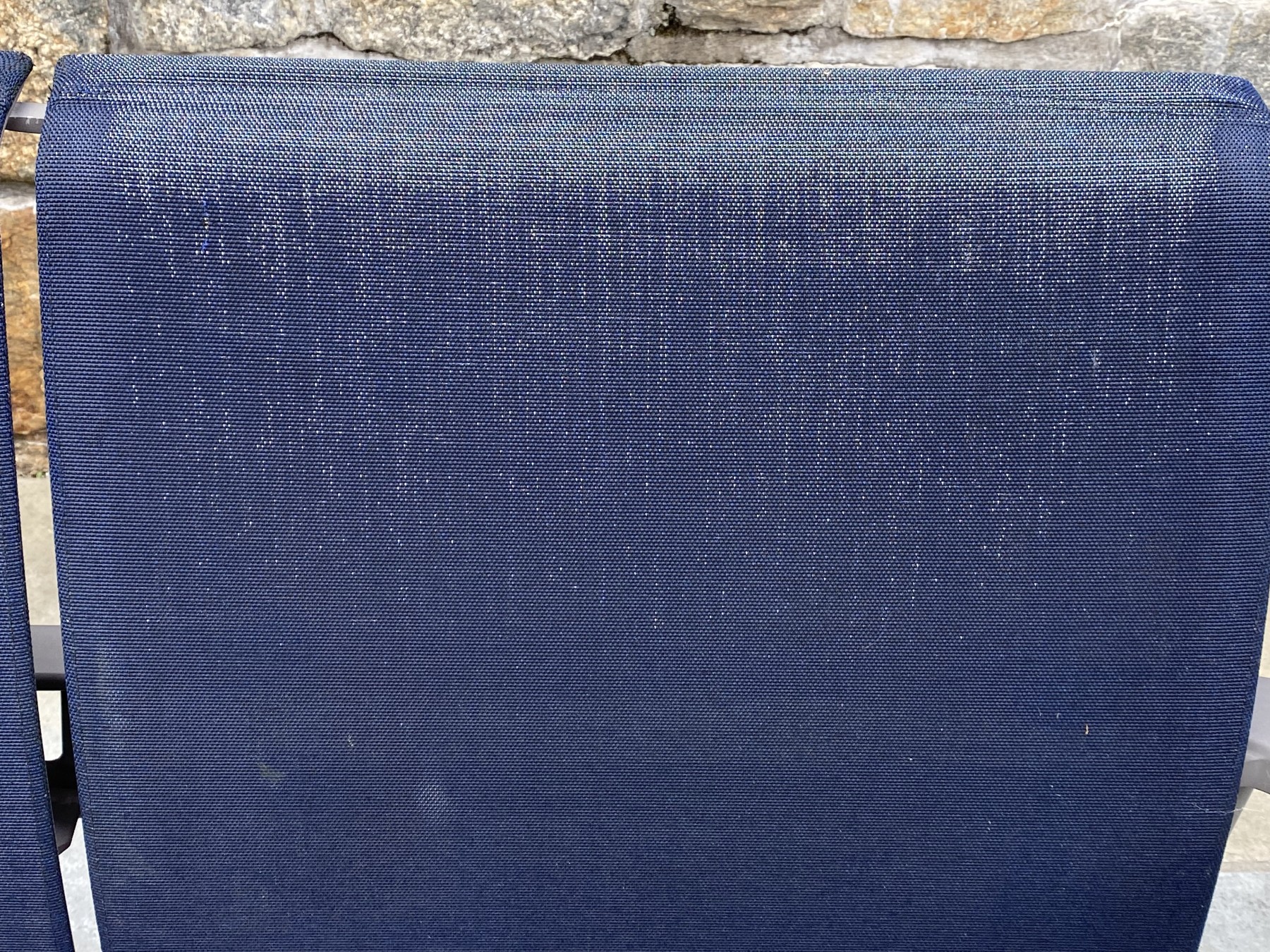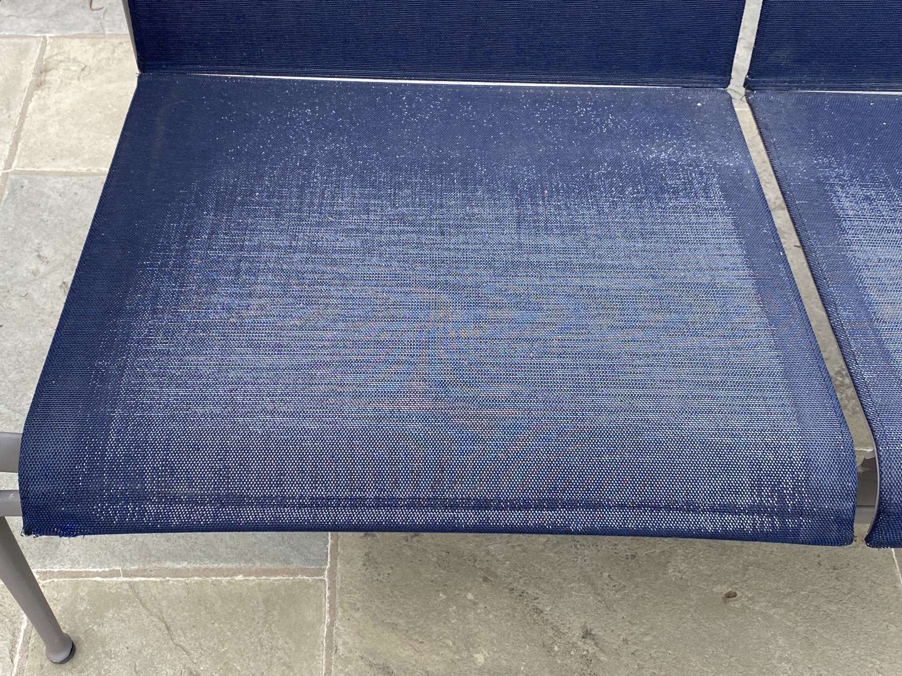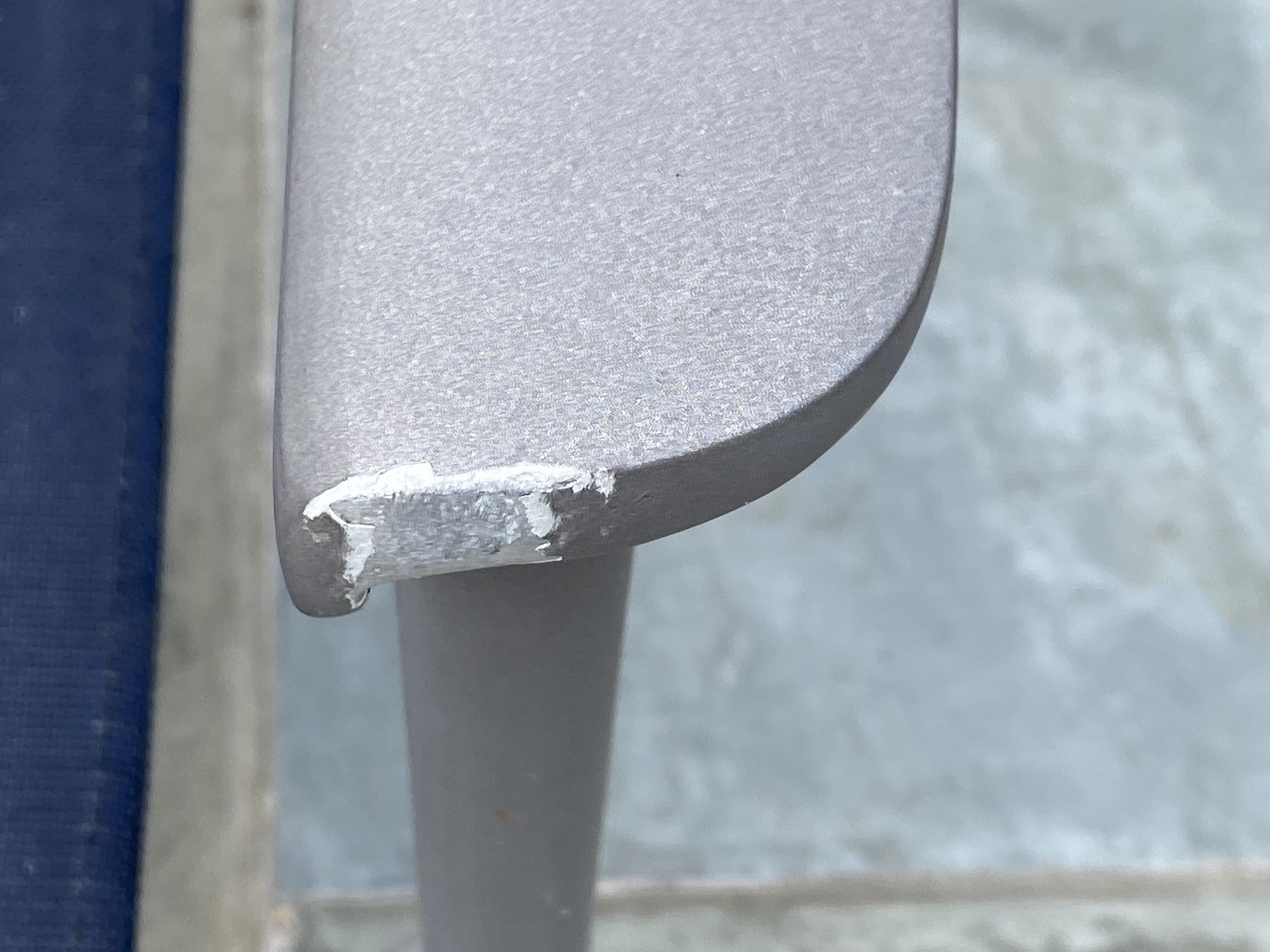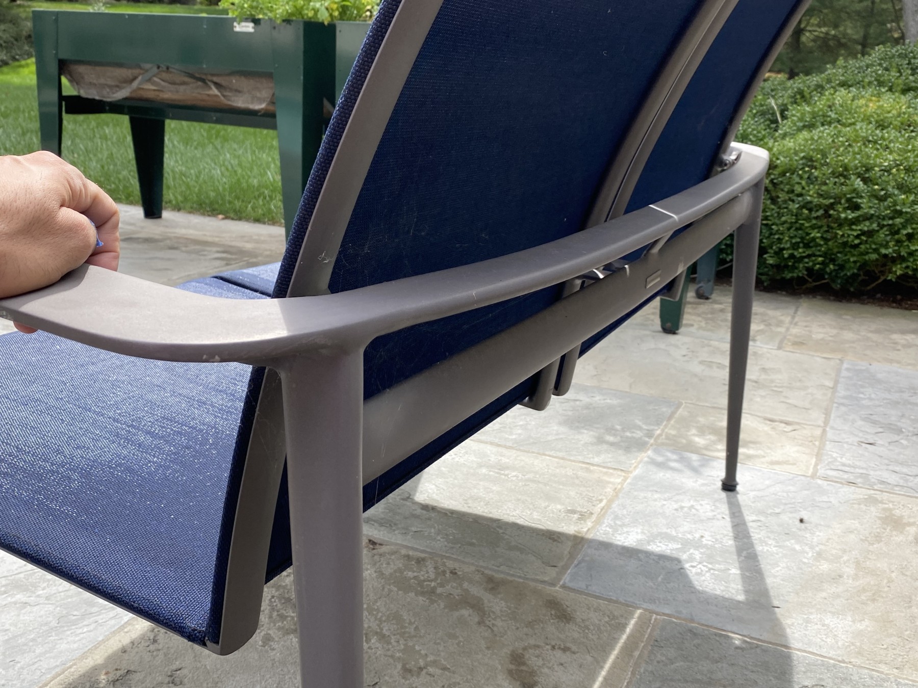 The canvas seats past their useable life, worn, color bleached, the ends of the arms have losses to powder coating along with minor dents to aluminum frames front of arms and side of arms. Please view photos.