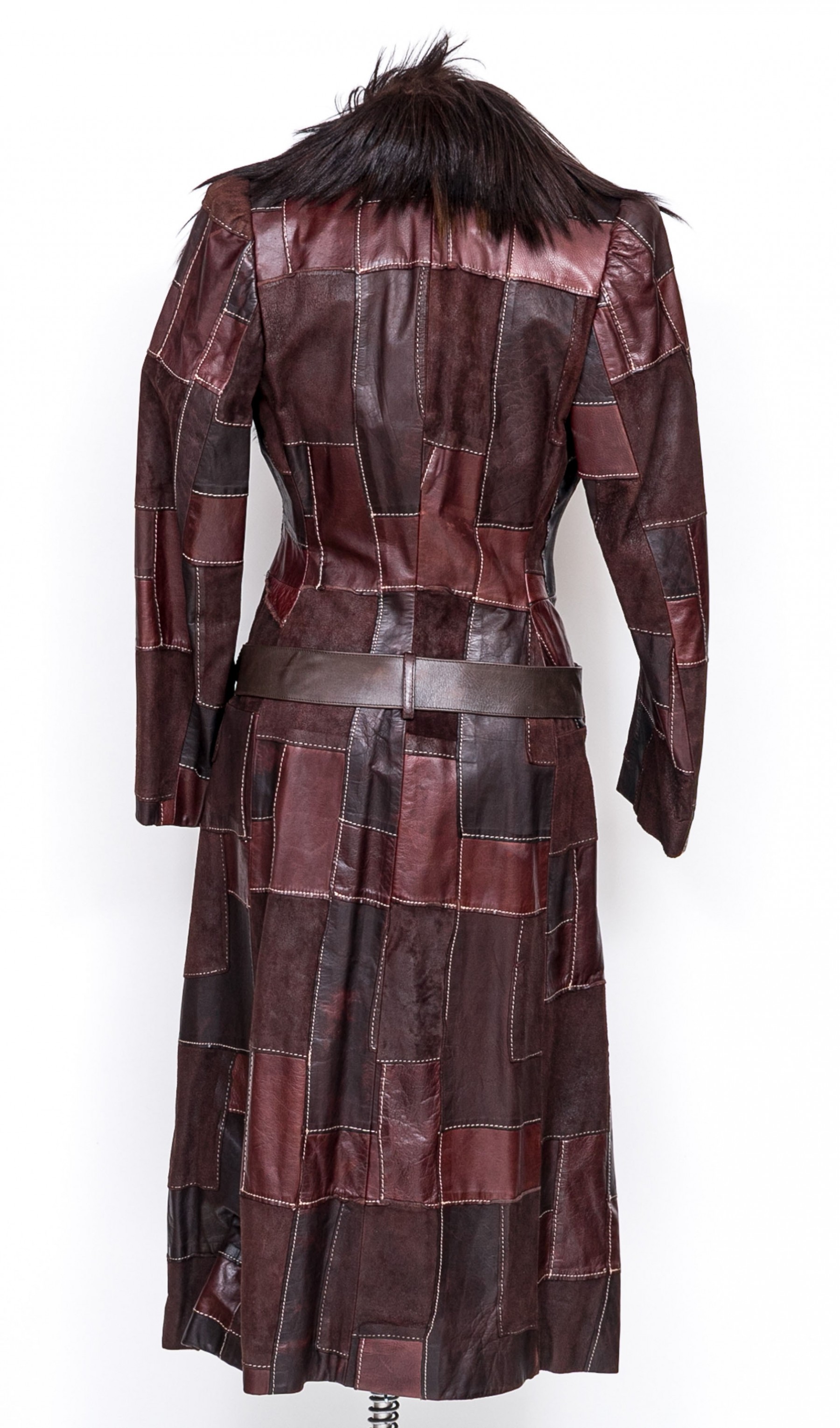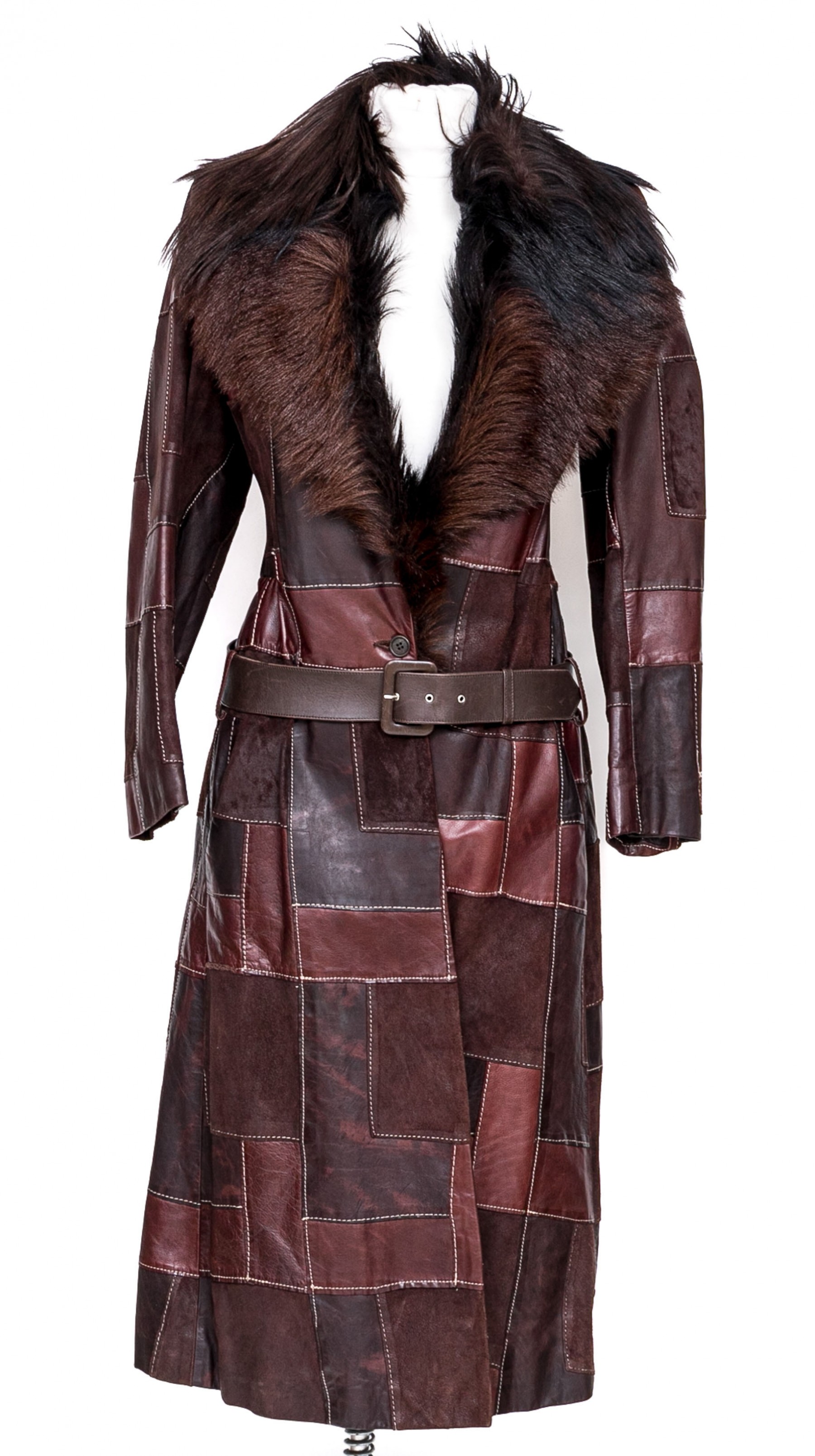An Alexander McQueen patchwork leather trench style leather coat. The coat has a single button closure with belt and two exterior pockets. The collar has a dark brown to black fur. Dark brown inner lining with yellow accent stripe.