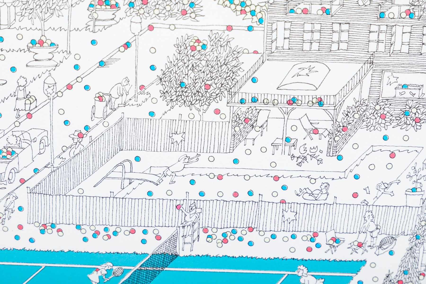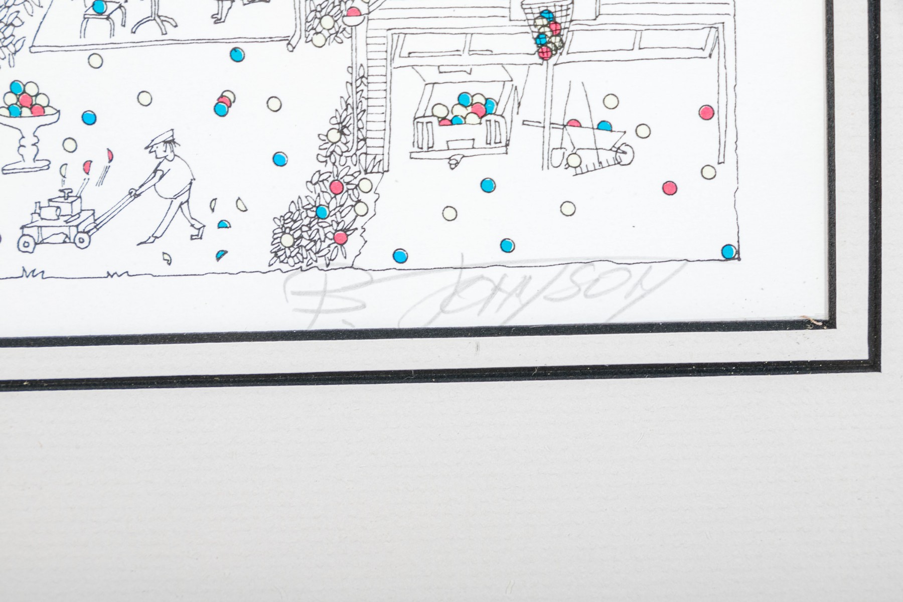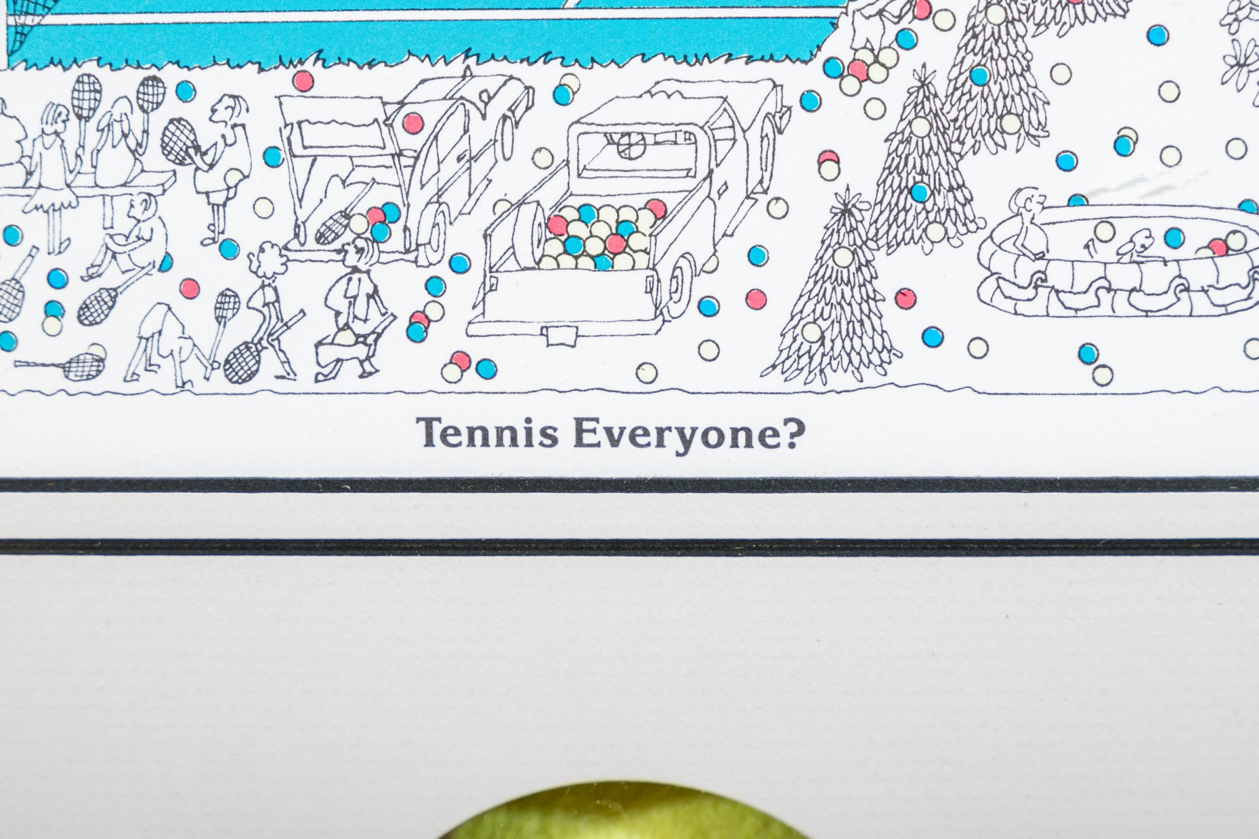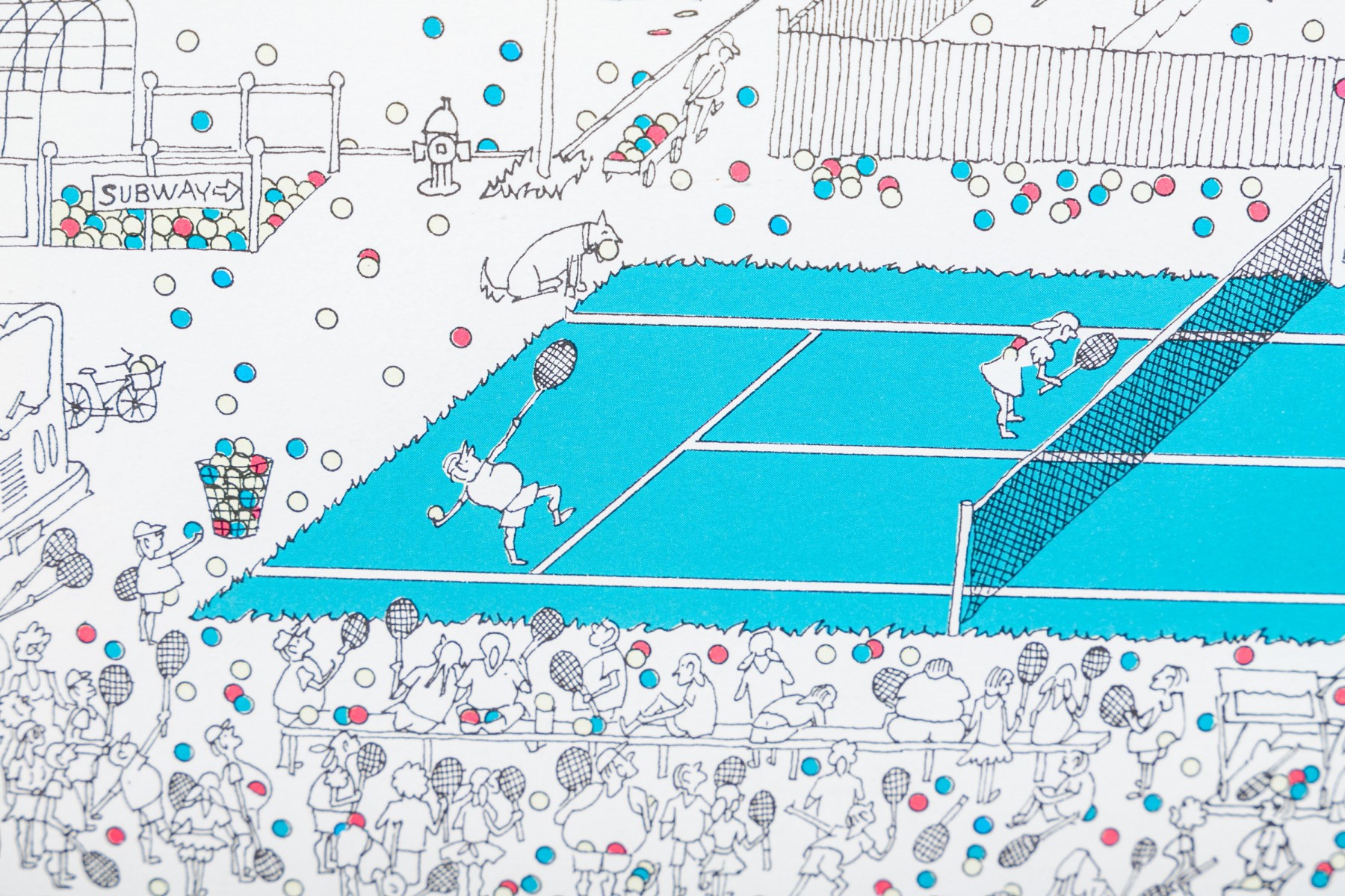 Color lithograph pencil signed lower right and framed with an actual tennis ball inset below. It features a suburban landscape with houses, figures and peppered with tiny colored balls overall. A blue tennis court with players is seen in the foreground. Presented in a metal frame with glass.