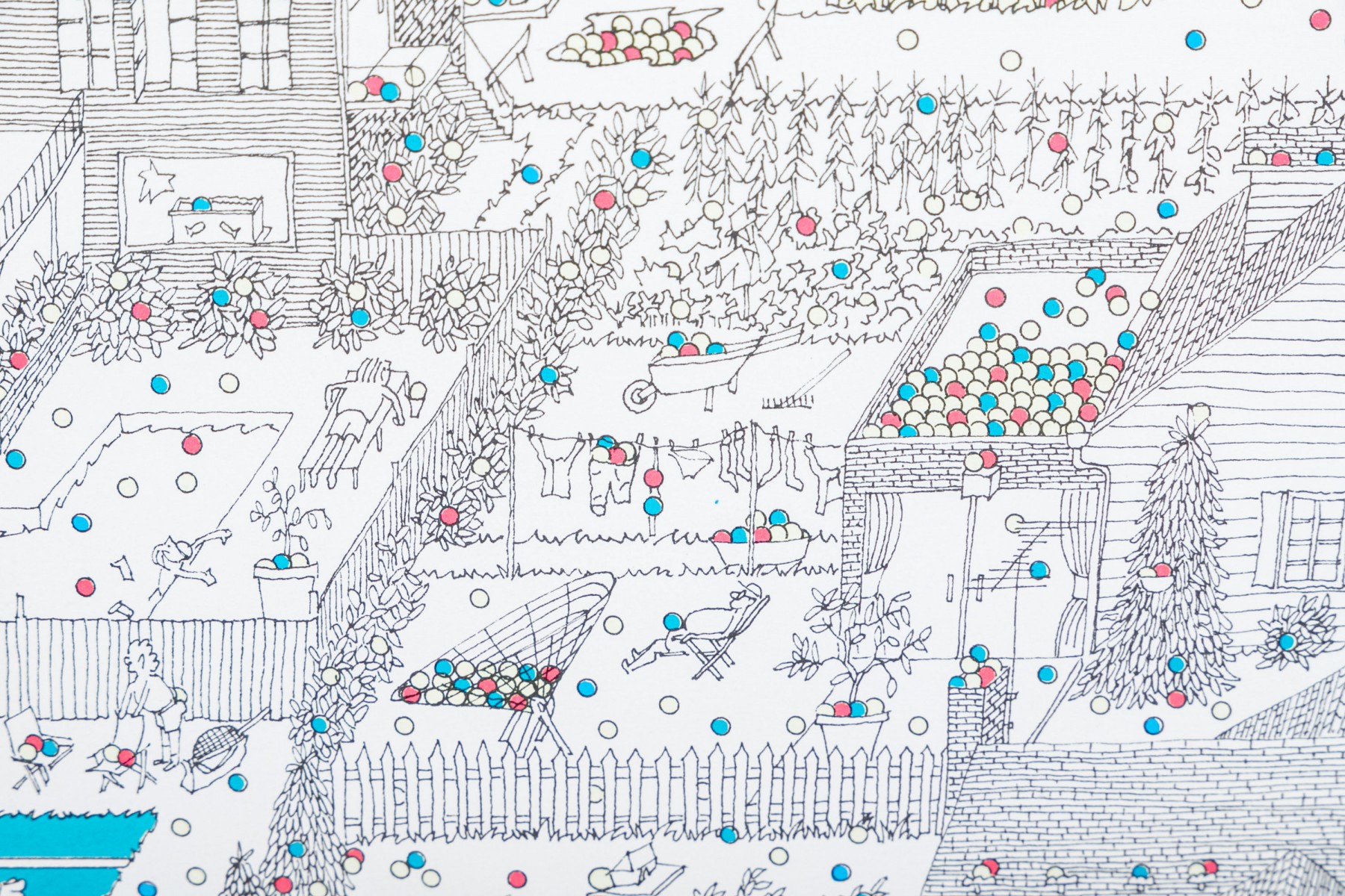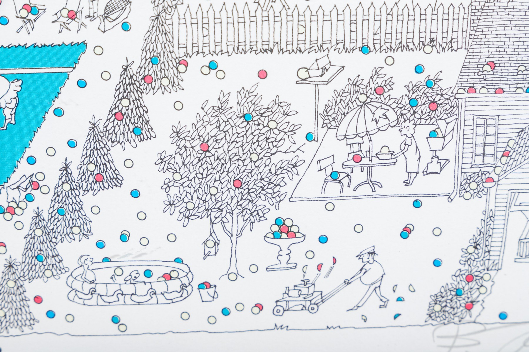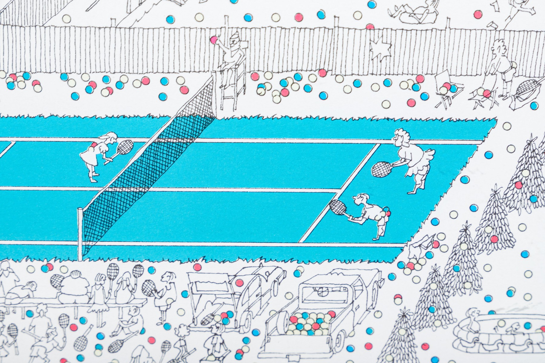 Color lithograph pencil signed lower right and framed with an actual tennis ball inset below. It features a suburban landscape with houses, figures and peppered with tiny colored balls overall. A blue tennis court with players is seen in the foreground. Presented in a metal frame with glass.
