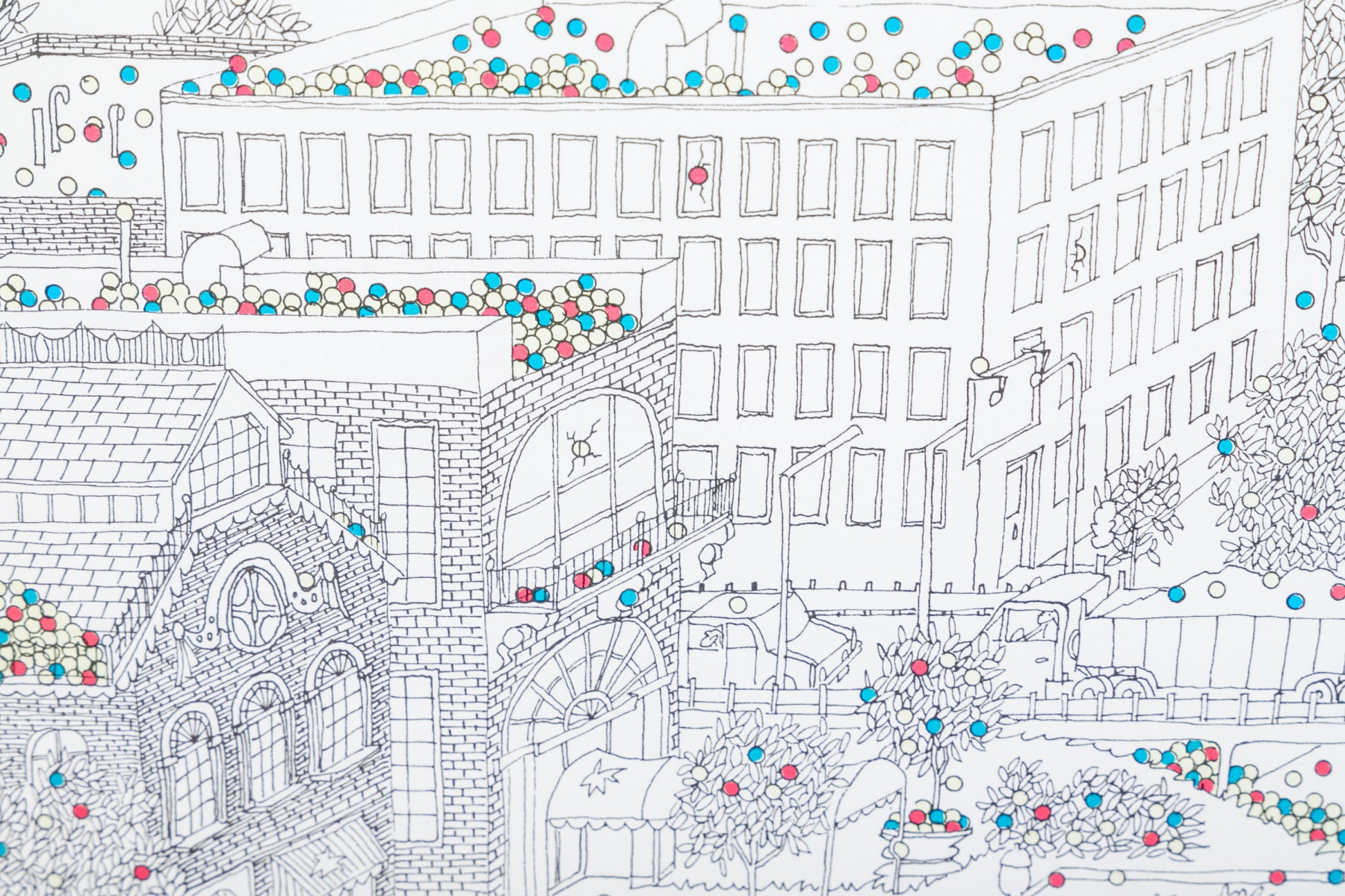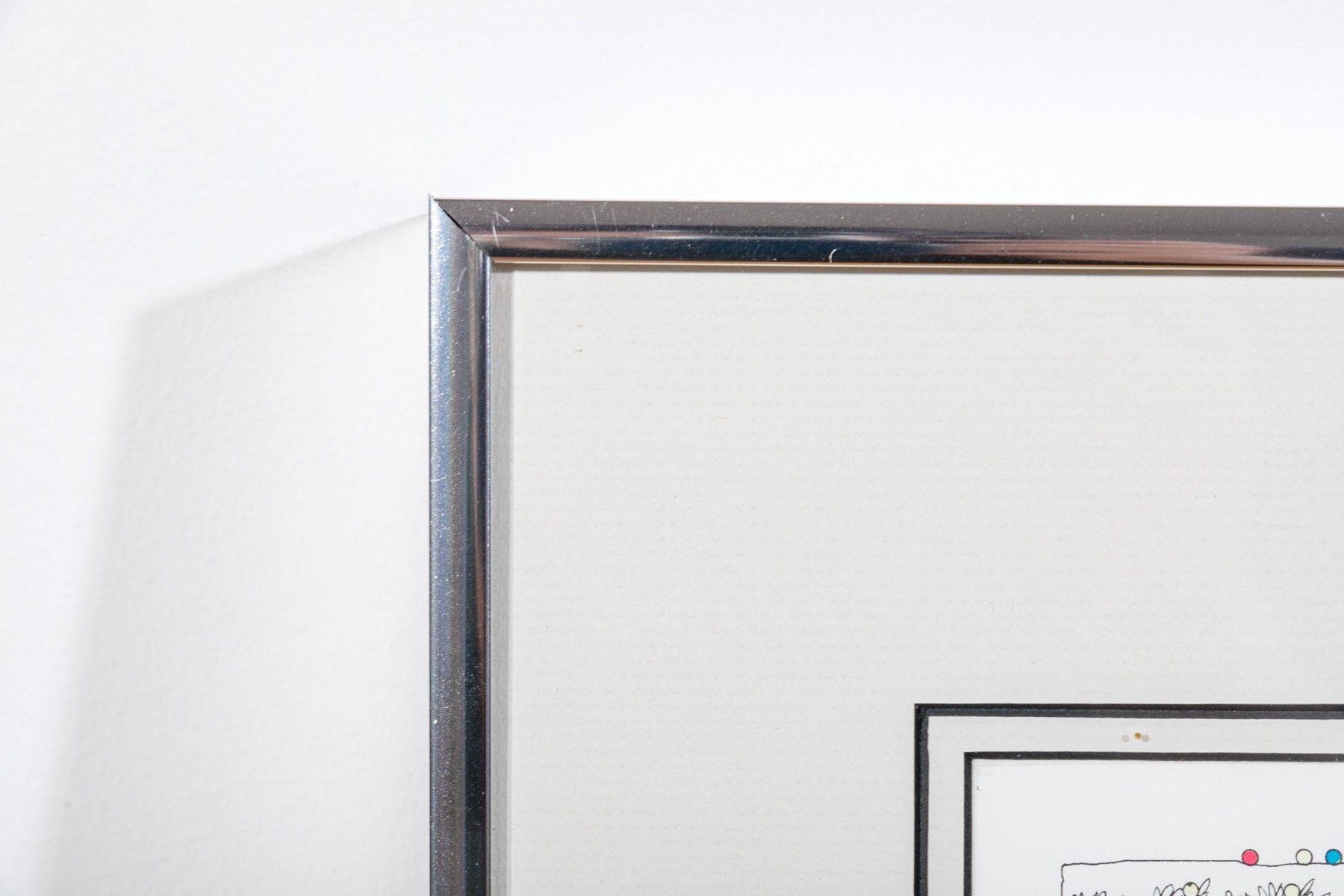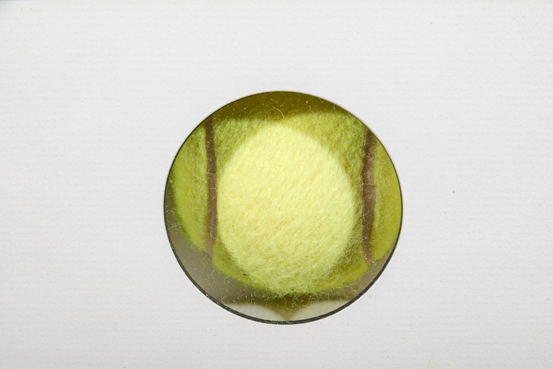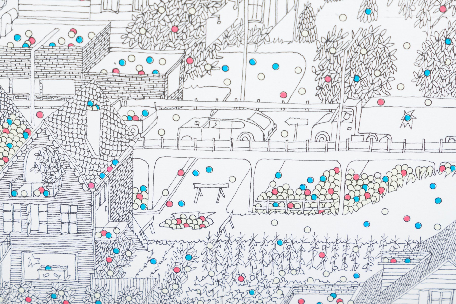 Color lithograph pencil signed lower right and framed with an actual tennis ball inset below. It features a suburban landscape with houses, figures and peppered with tiny colored balls overall. A blue tennis court with players is seen in the foreground. Presented in a metal frame with glass.