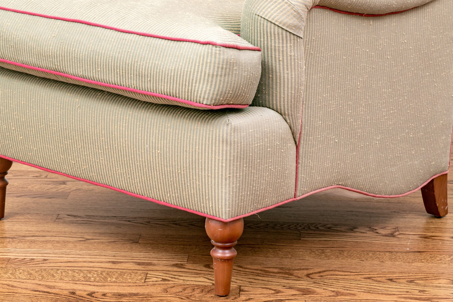 Brunschwig & Fils Saratoga Collection upholstered armchair presents an exquisite design with its turned front legs, gracefully splayed back legs, tall backrest, loose seat cushion, and tastefully tapered arms.