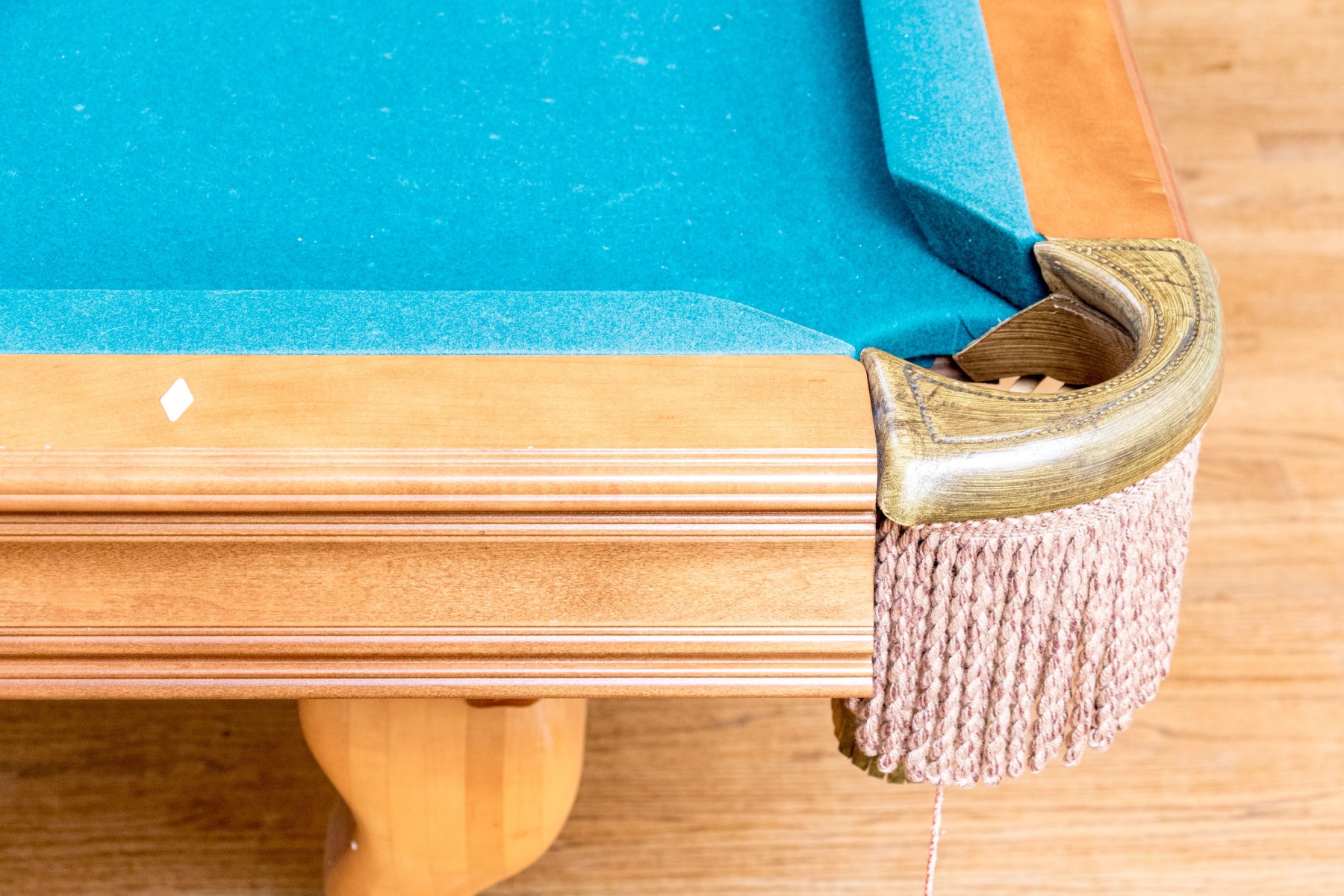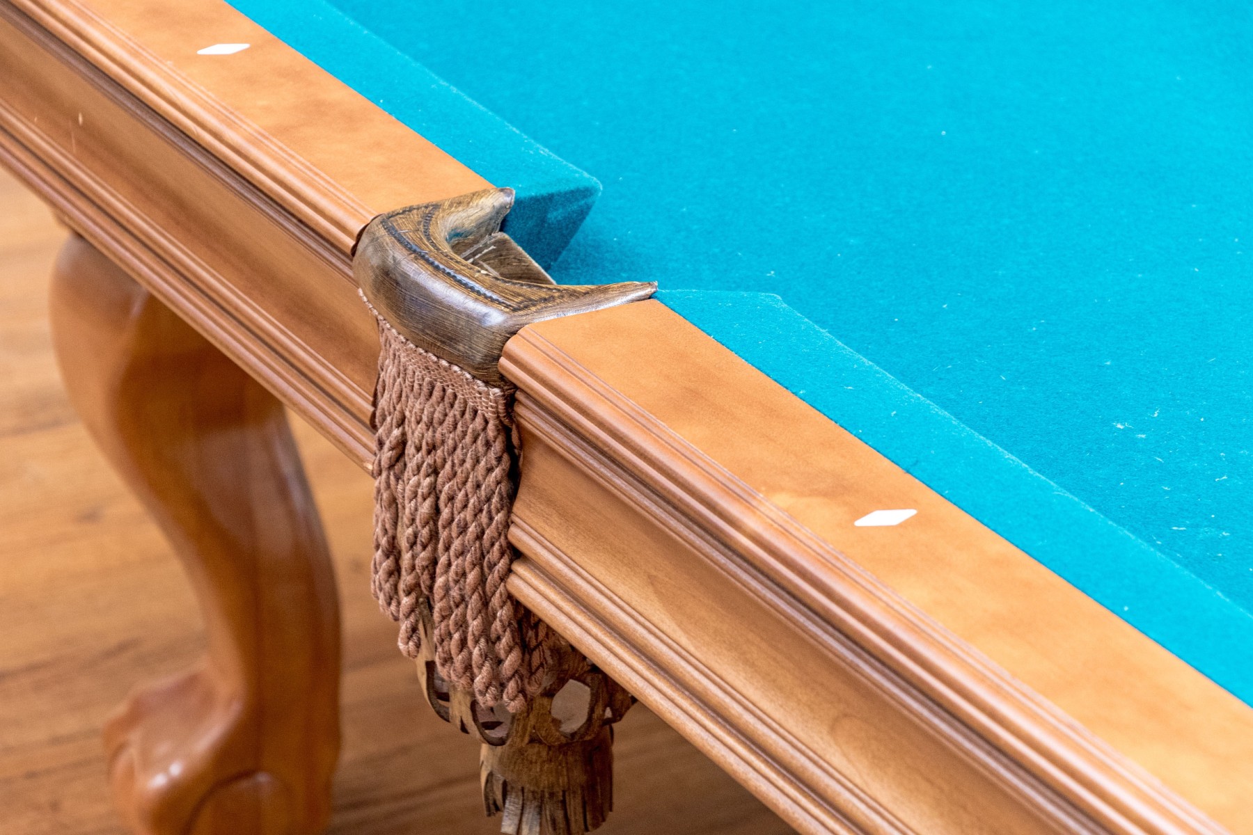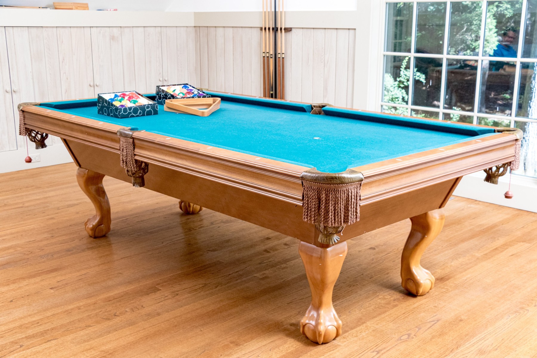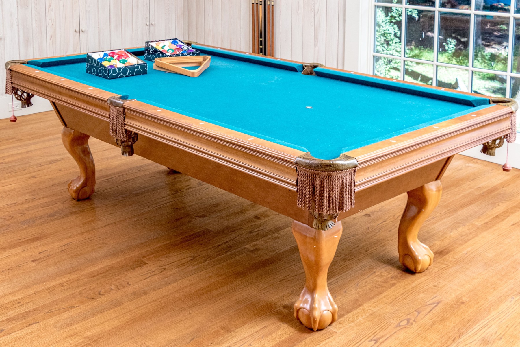A delightful Brunswick pool table with great traditional appeal, crafted in honeyed light brown wood with aqua teal felt and six tassel trimmed pockets. Raised on thick cabriole legs with statement ball and claw carved feet. Includes cues, triangle, and balls.