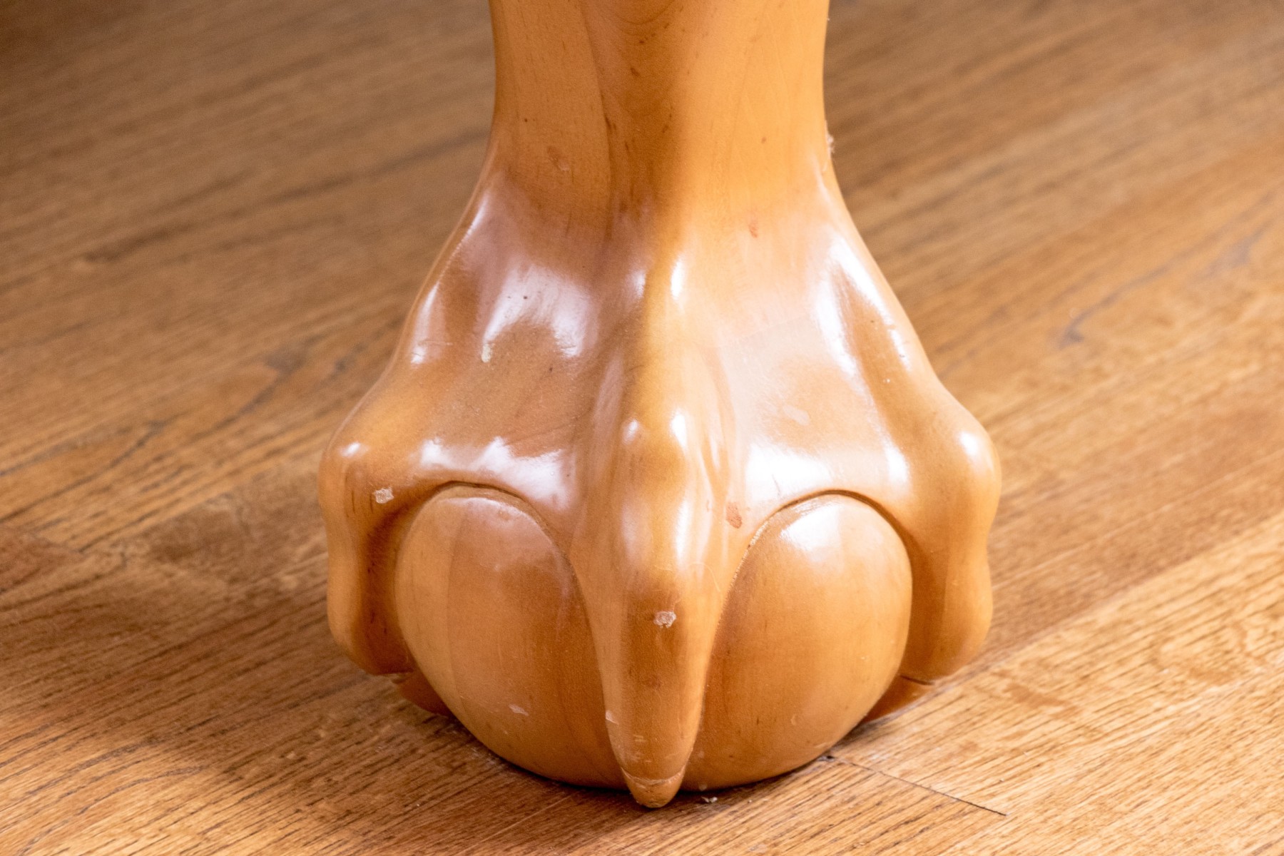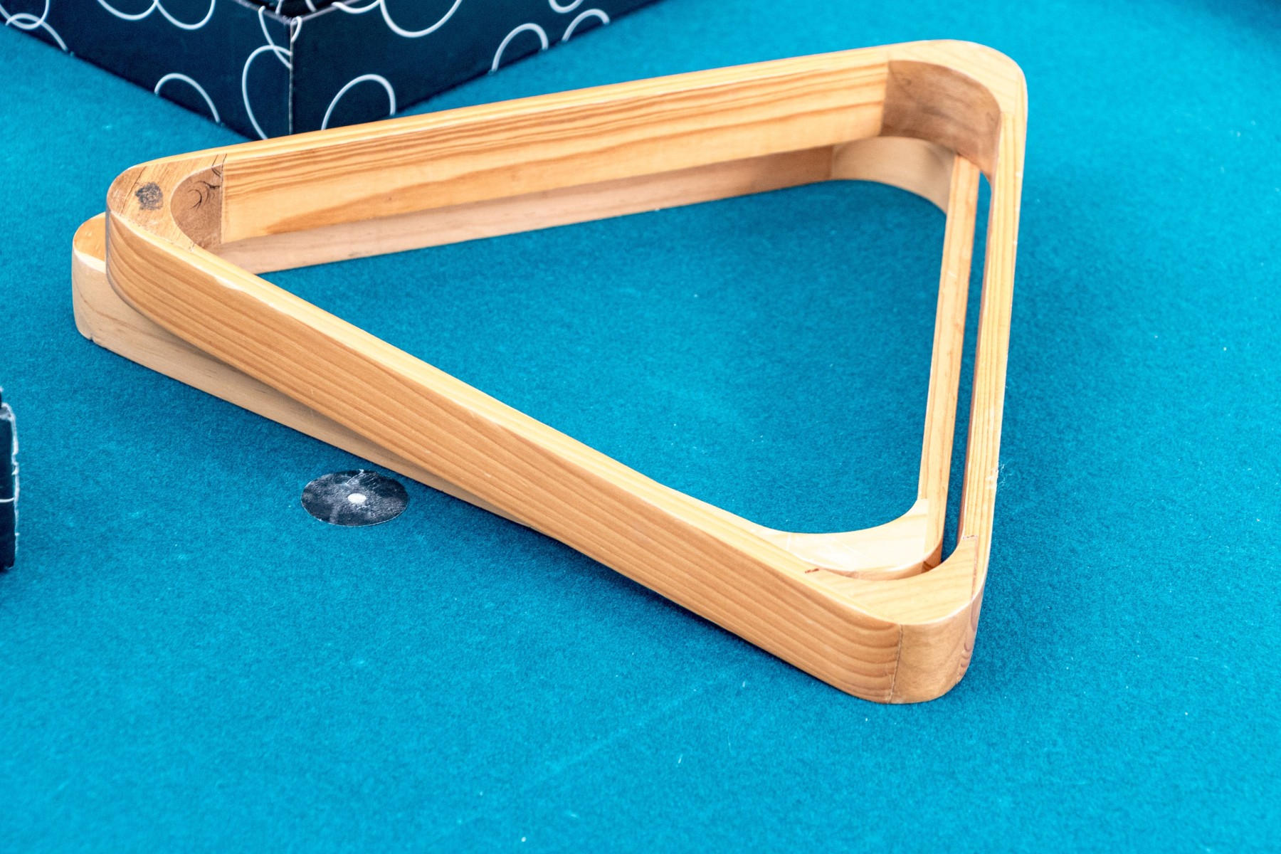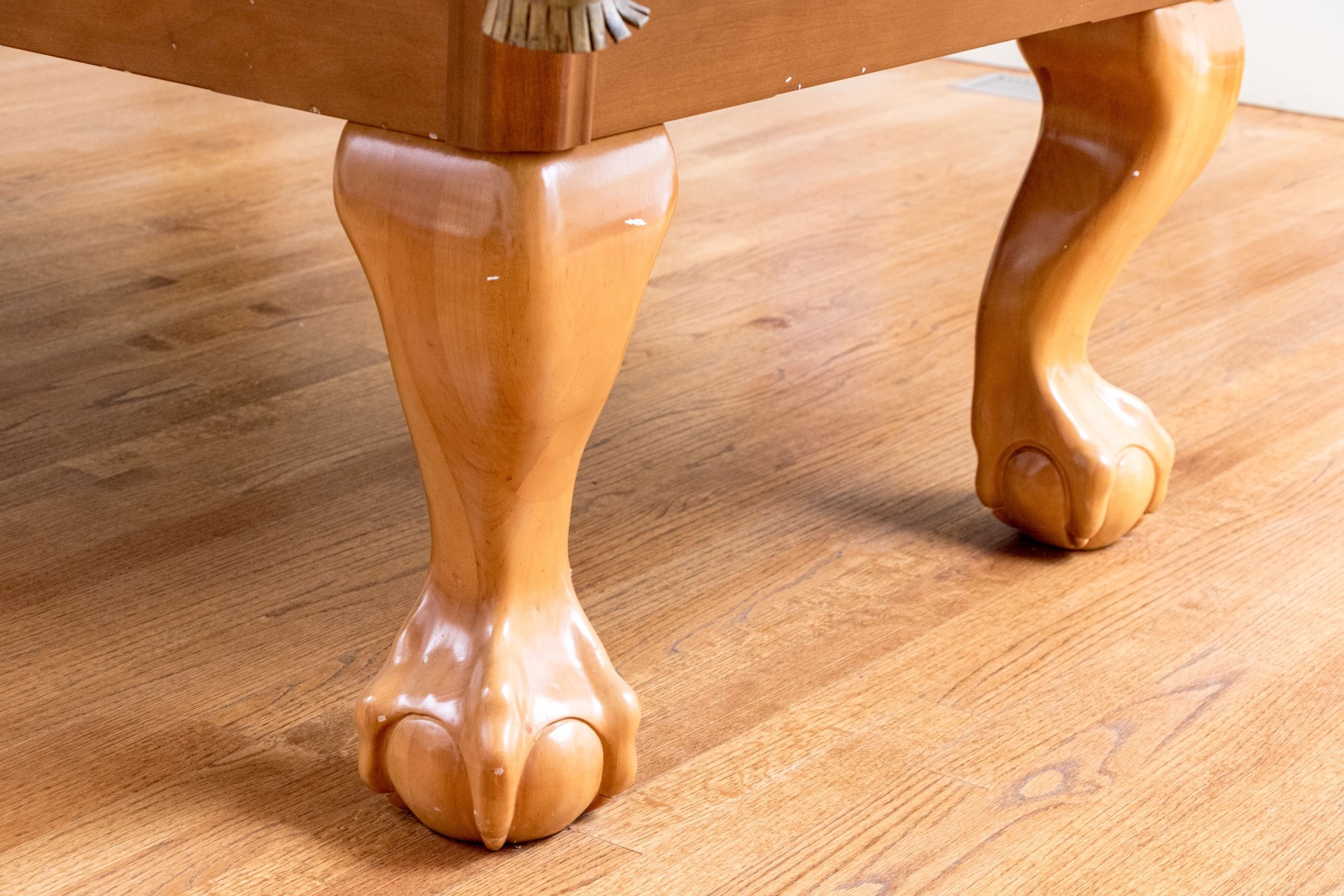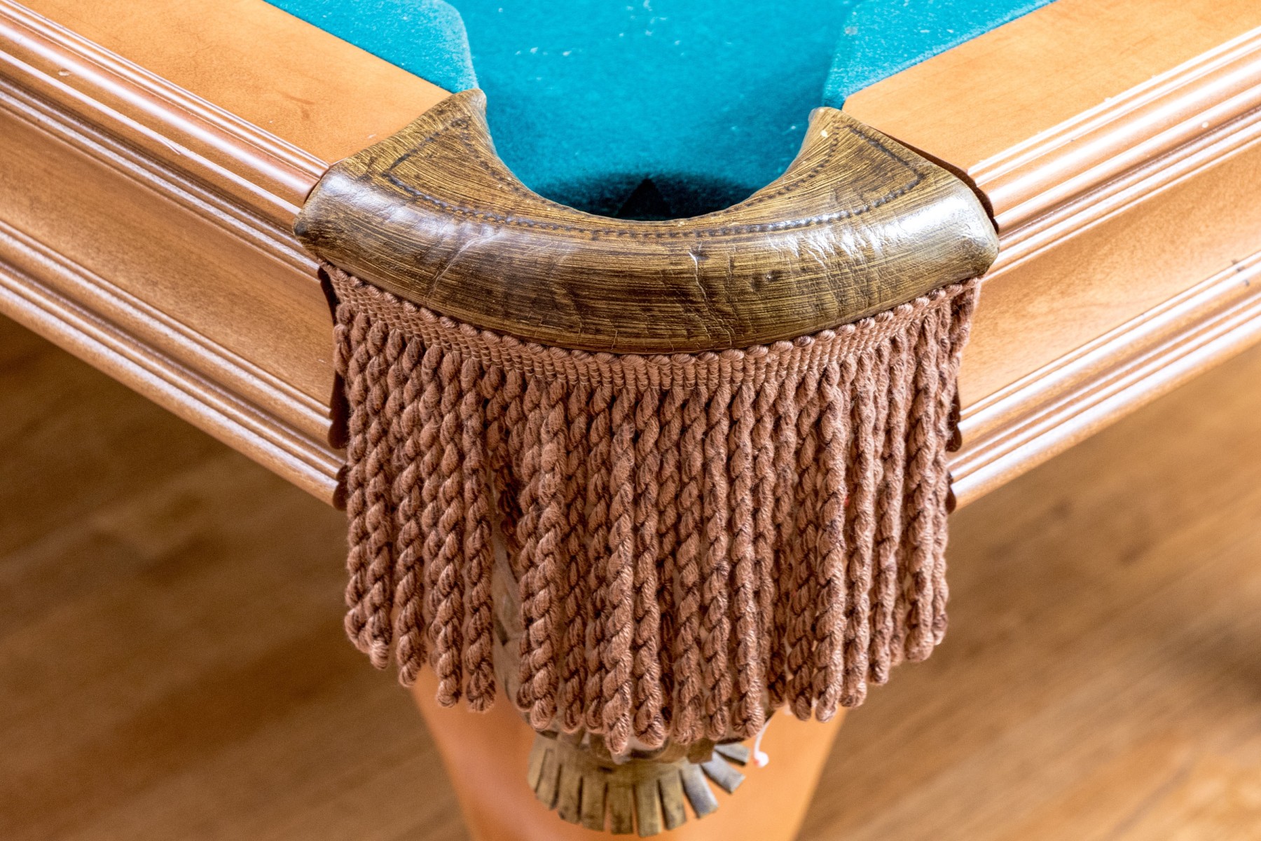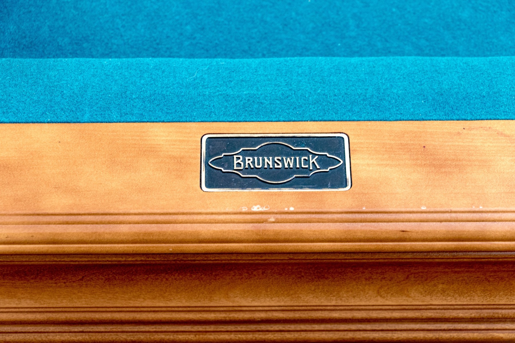 A delightful Brunswick pool table with great traditional appeal, crafted in honeyed light brown wood with aqua teal felt and six tassel trimmed pockets. Raised on thick cabriole legs with statement ball and claw carved feet. Includes cues, triangle, and balls.