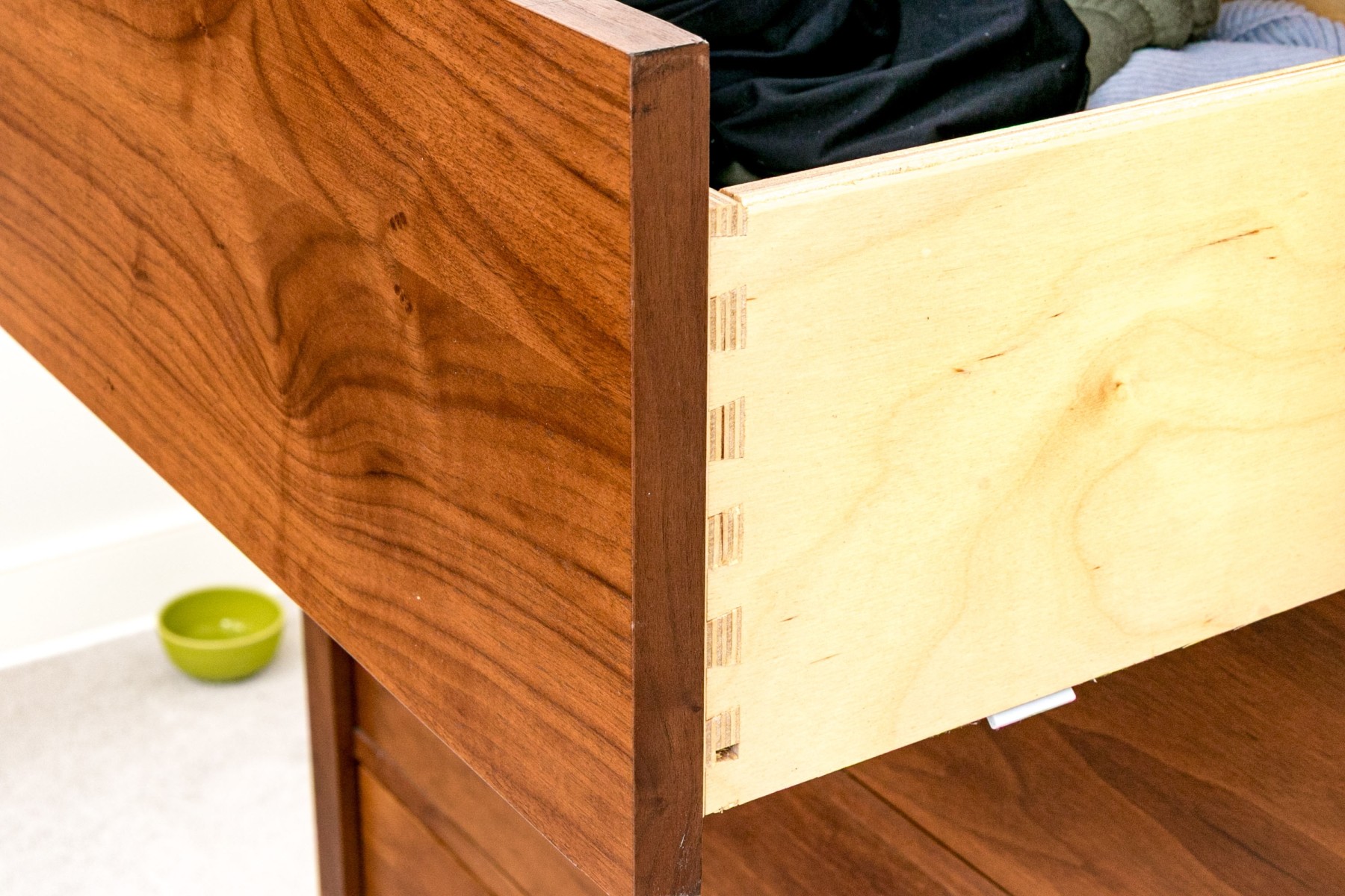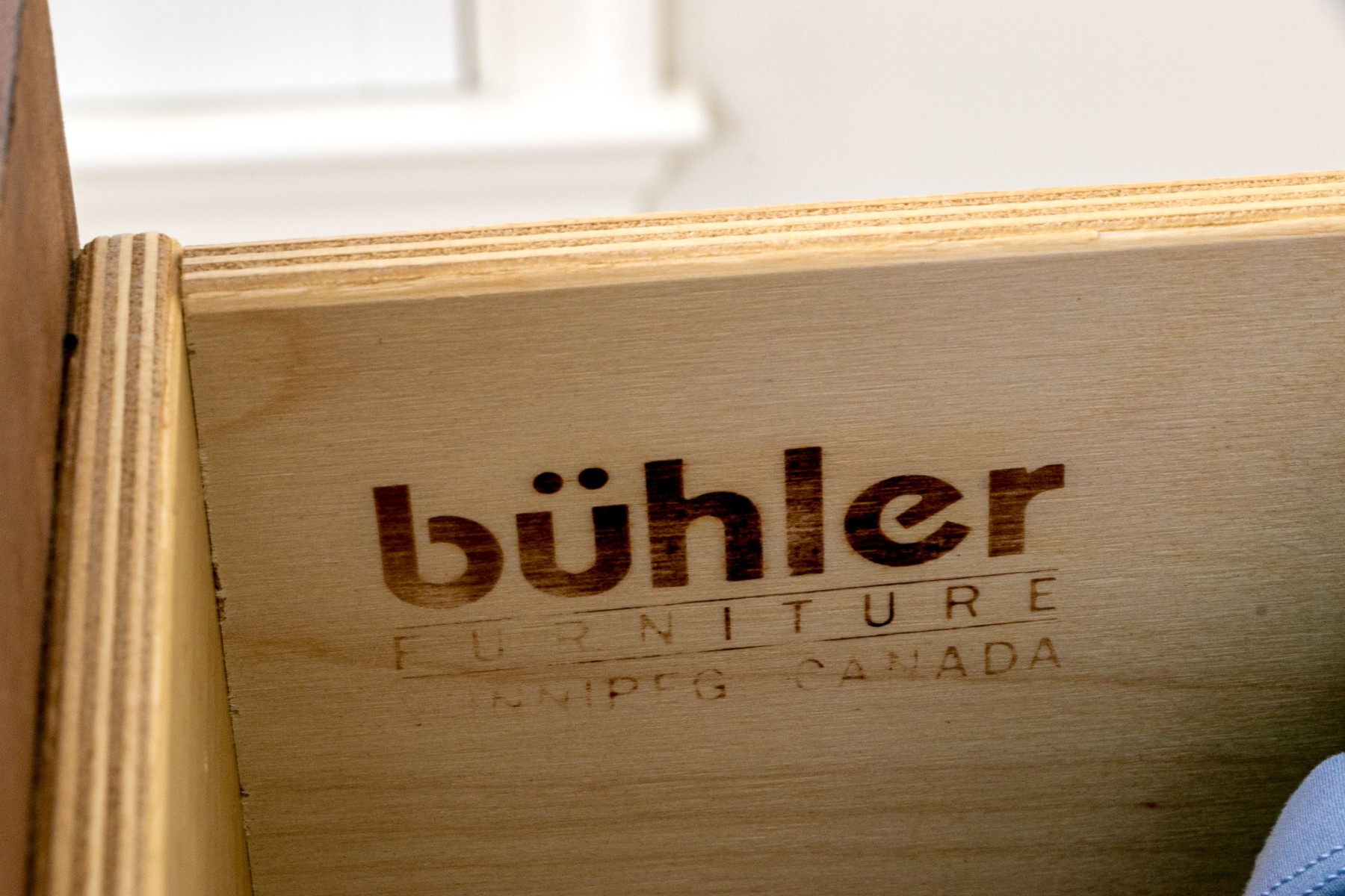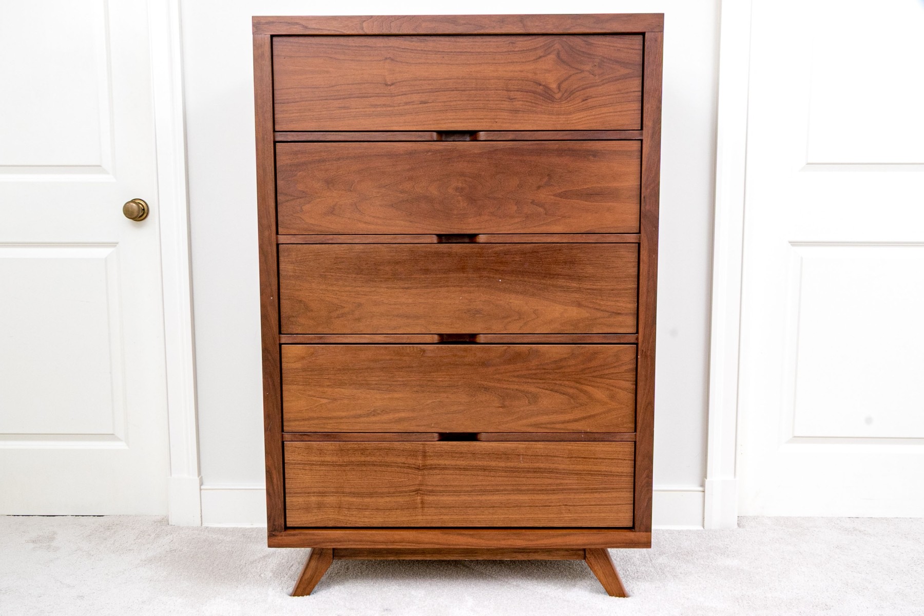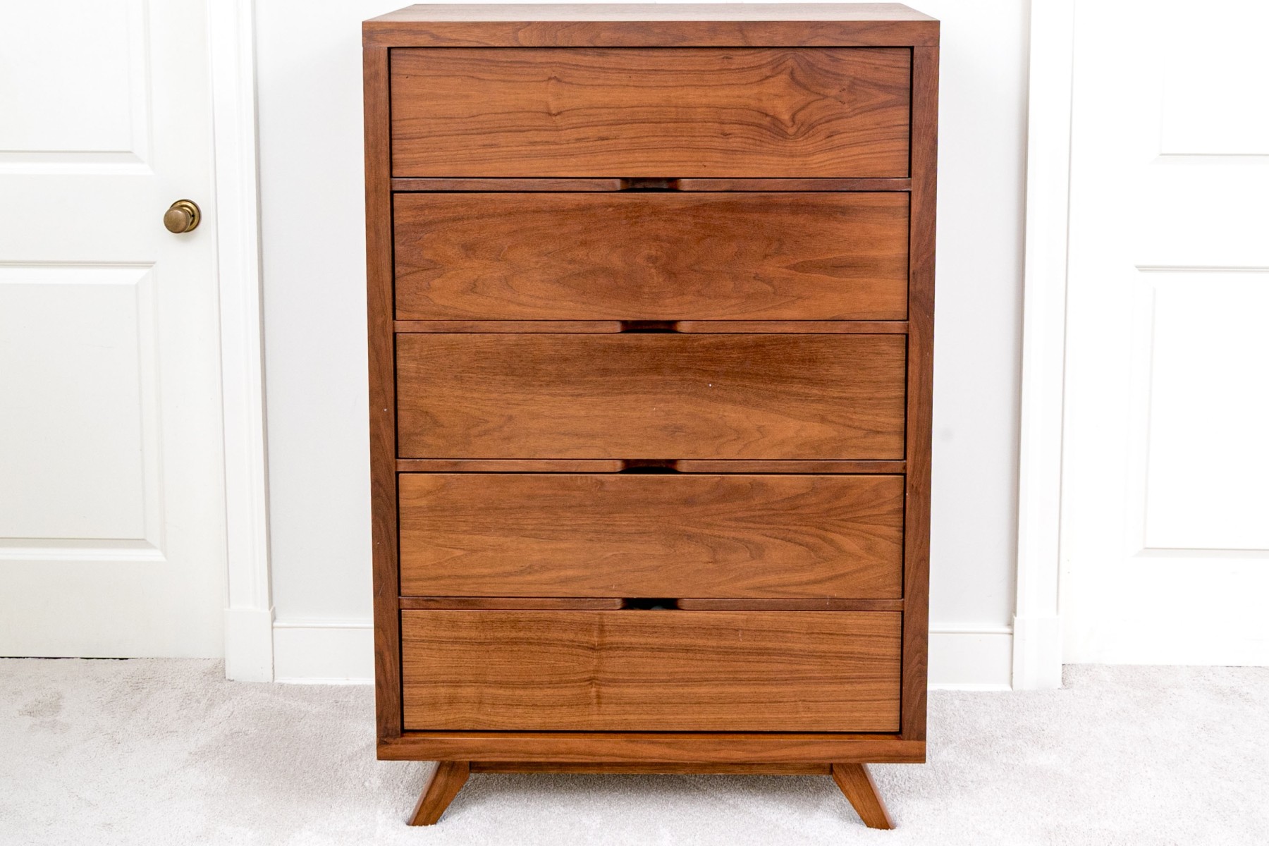 A stylish Bühler tallboy dresser with great mid-century modern appeal, well crafted in warm-toned medium brown wood with a rectangular case fitted with five drawers. The drawers are flush without hardware for a sleek and minimalist finish, detailed with recessions between them to aid in opening while also providing a touch of eye-catching detail. Raised on straight aprons with classic tapered and angled legs.