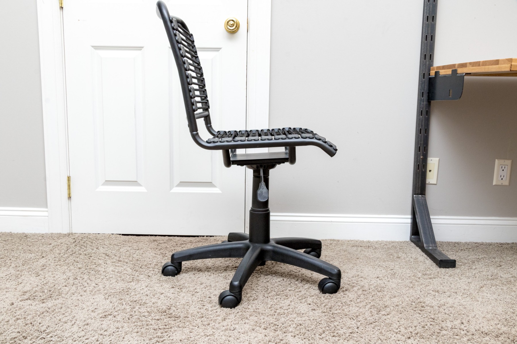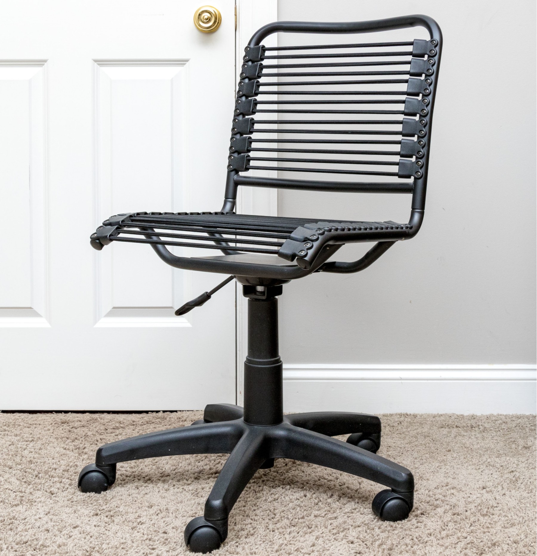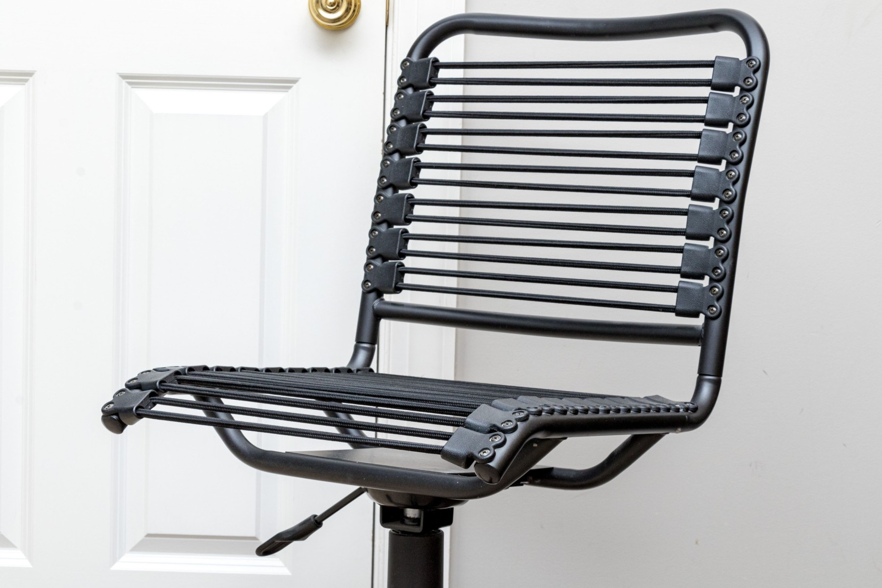 A lovely office swivel chair with a bungee cord design over a spoked base on caster feet.
