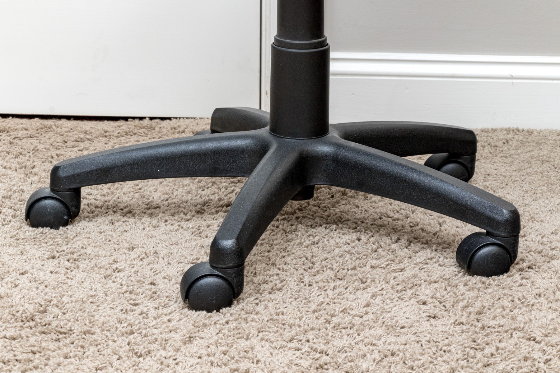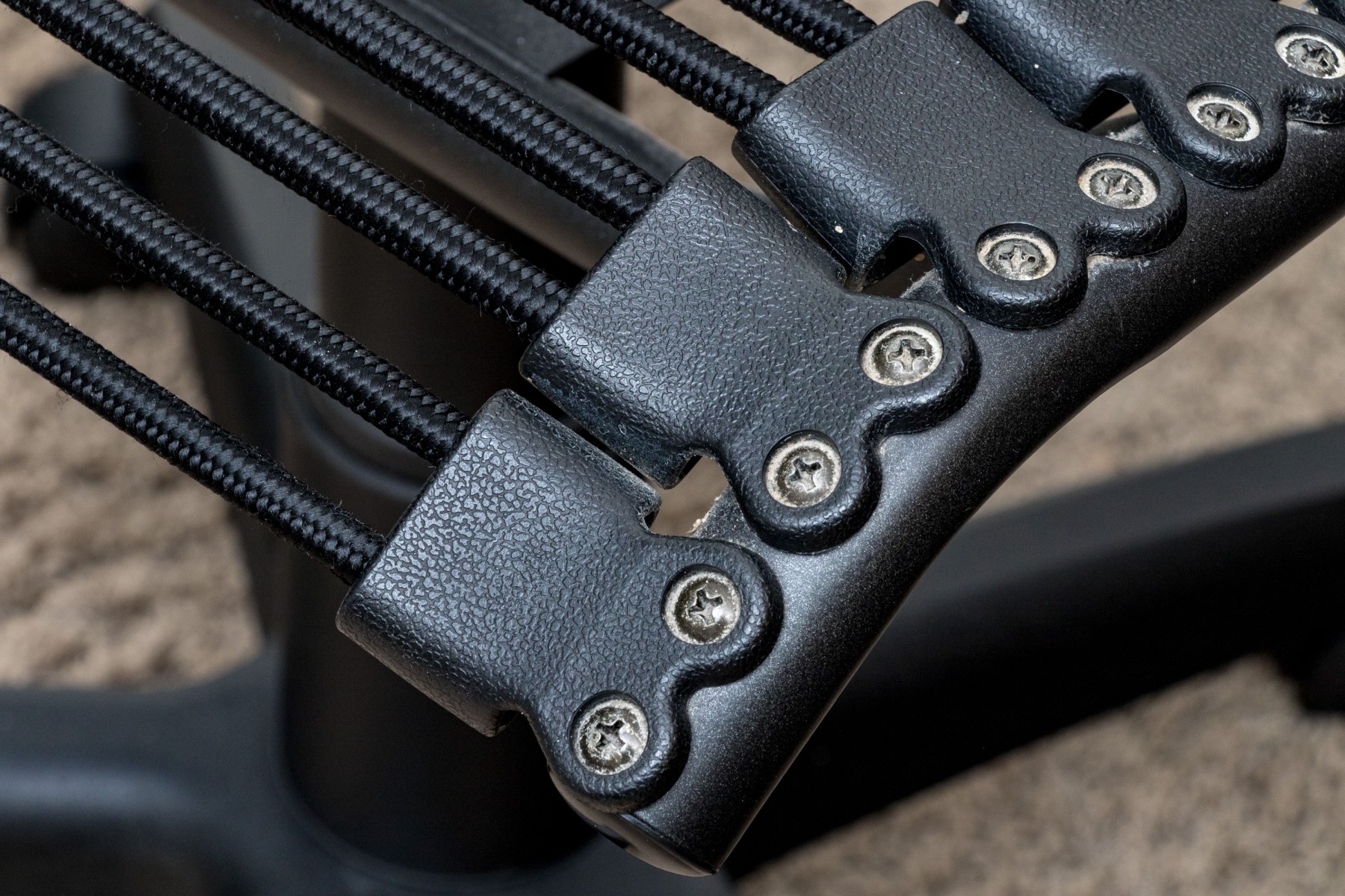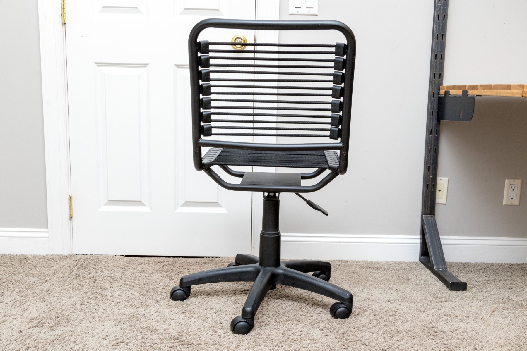 A lovely office swivel chair with a bungee cord design over a spoked base on caster feet.
