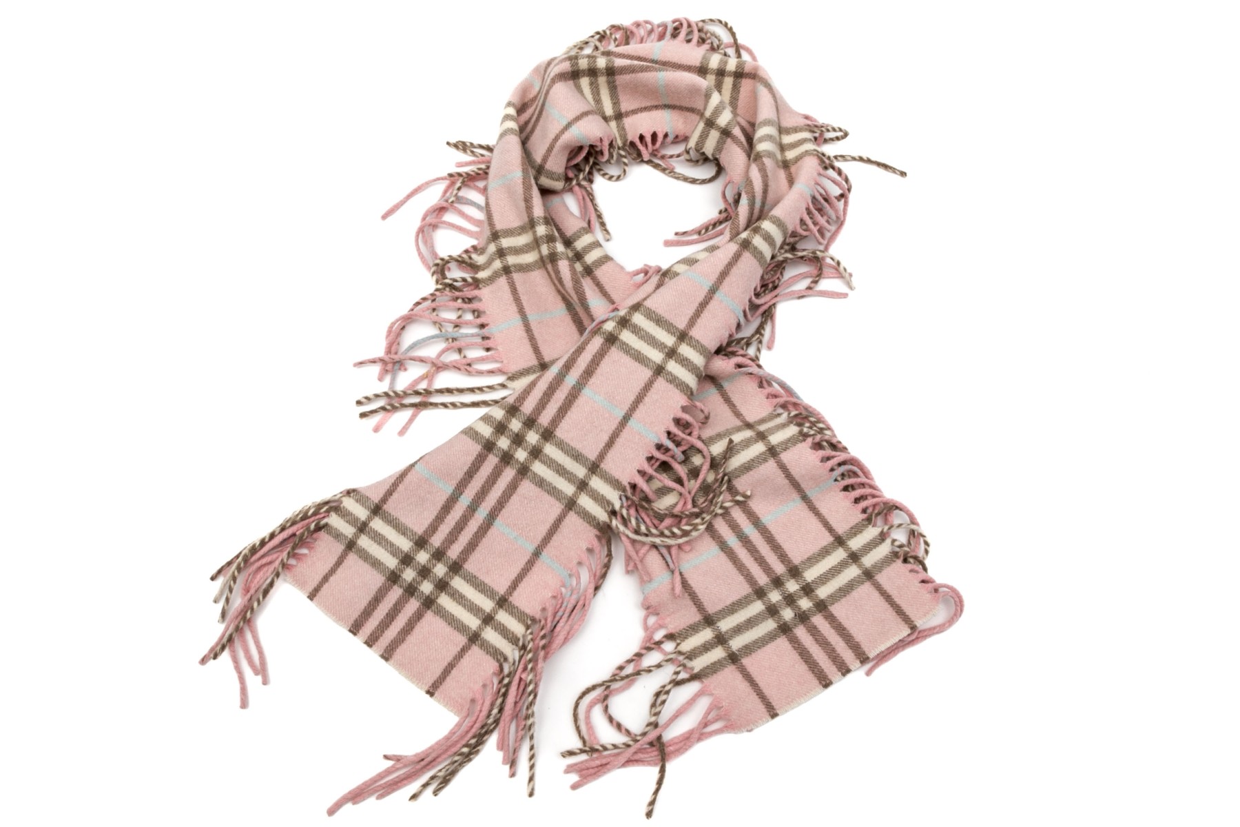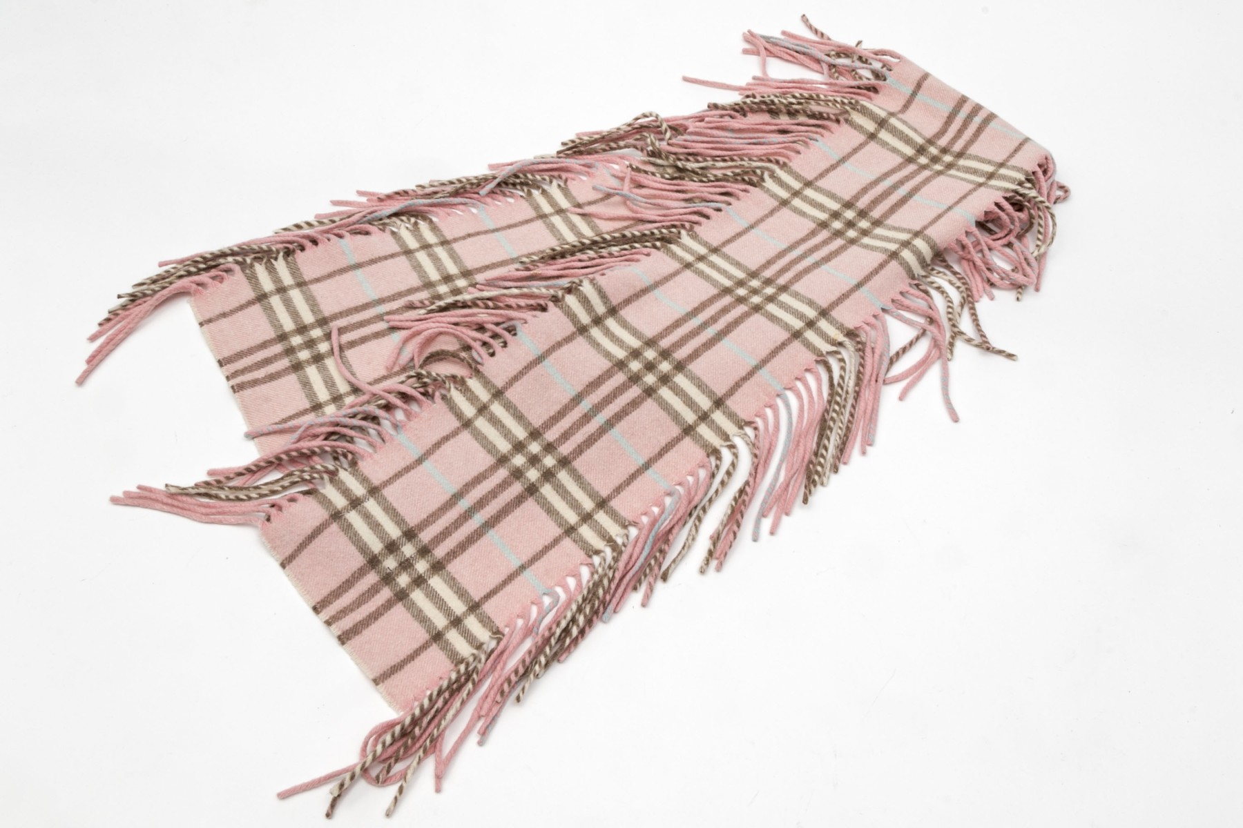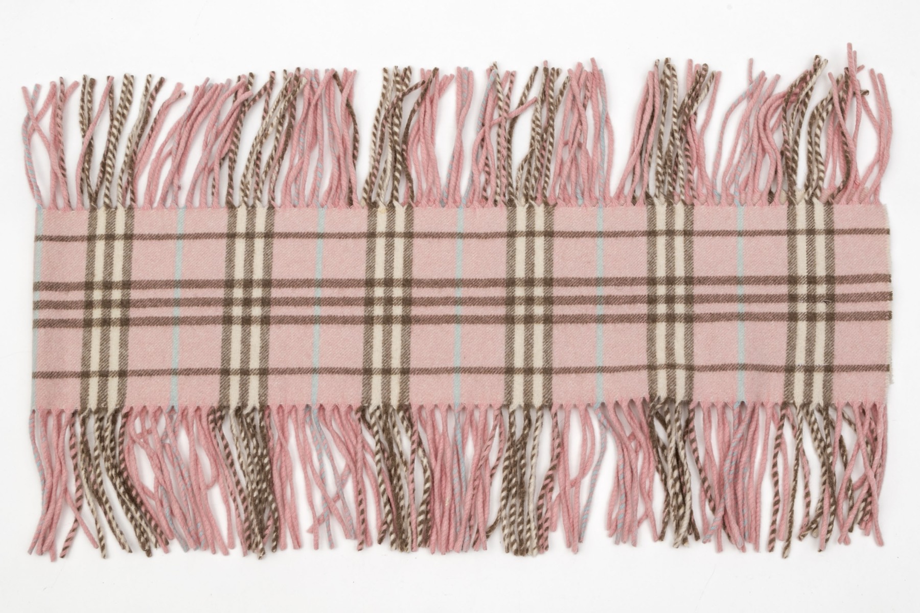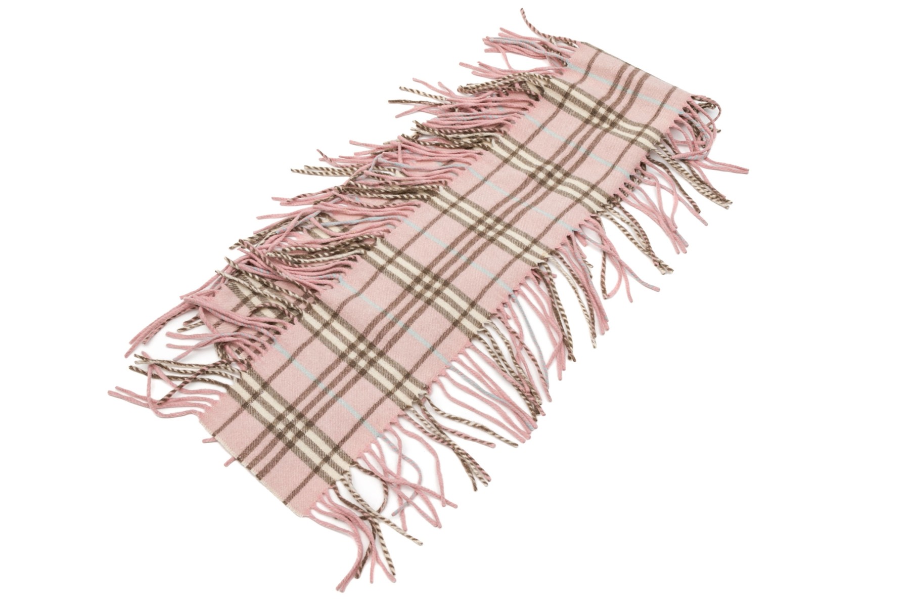 Burberry cheerful pink, blue and brown plaid 53" cashmere scarf, fringed sides