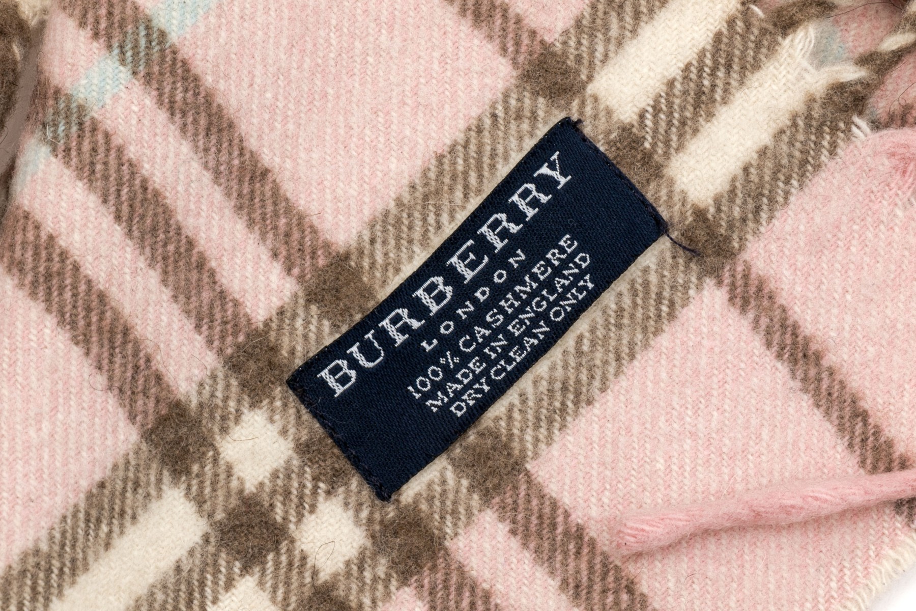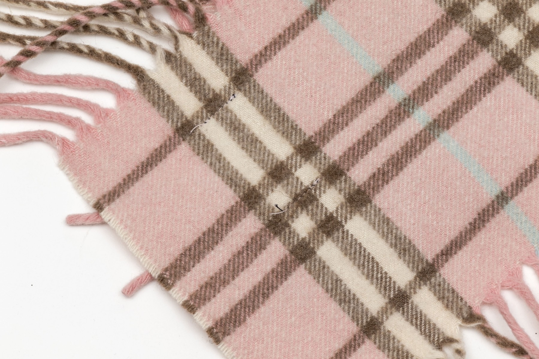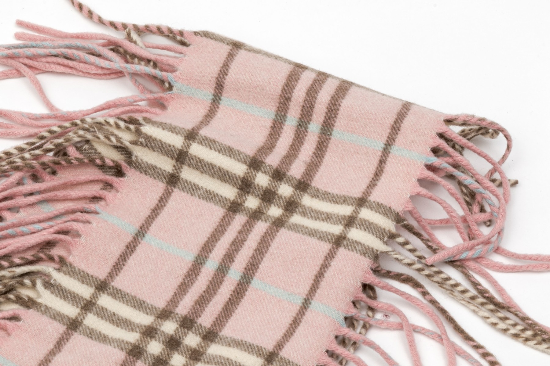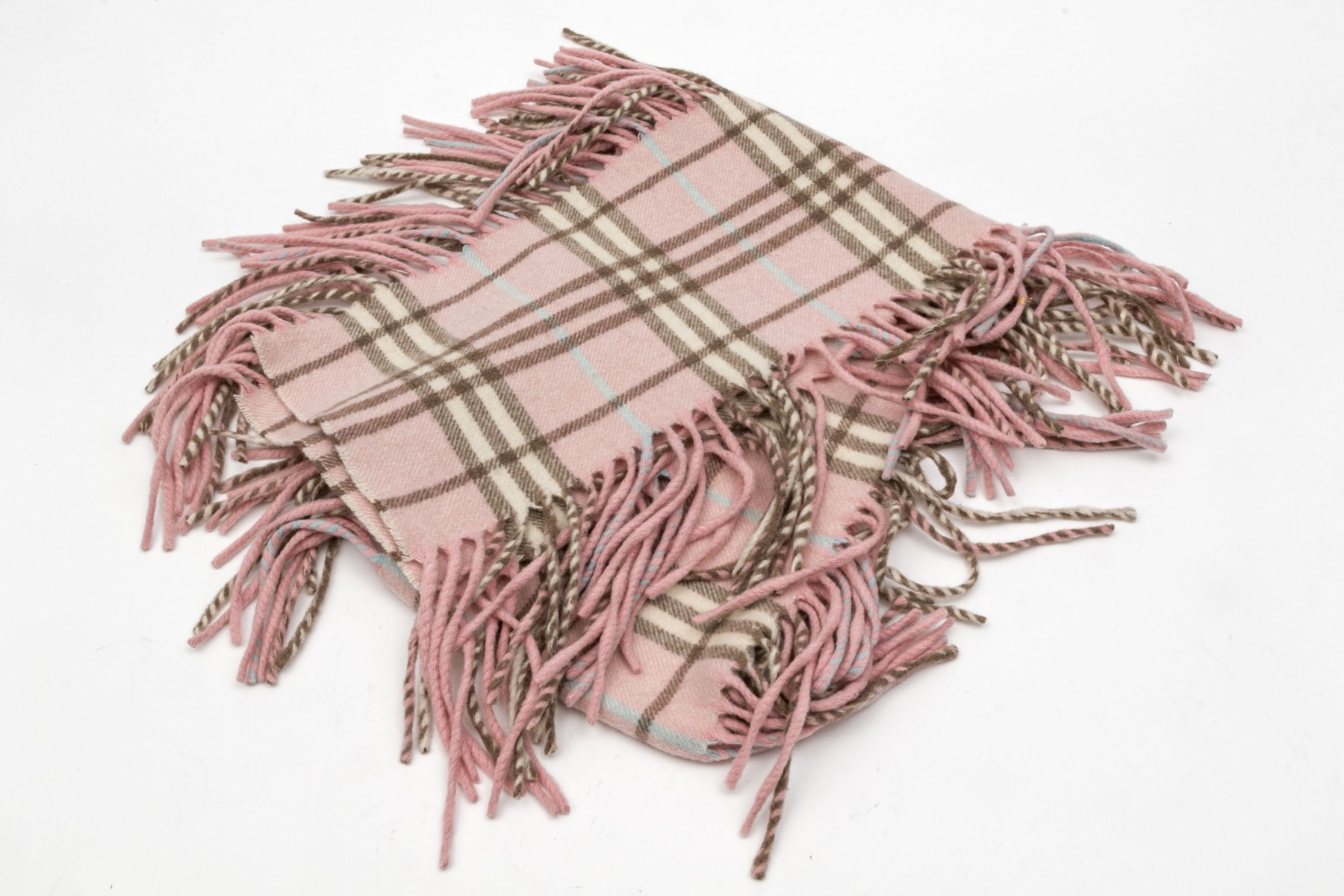 Burberry cheerful pink, blue and brown plaid 53" cashmere scarf, fringed sides