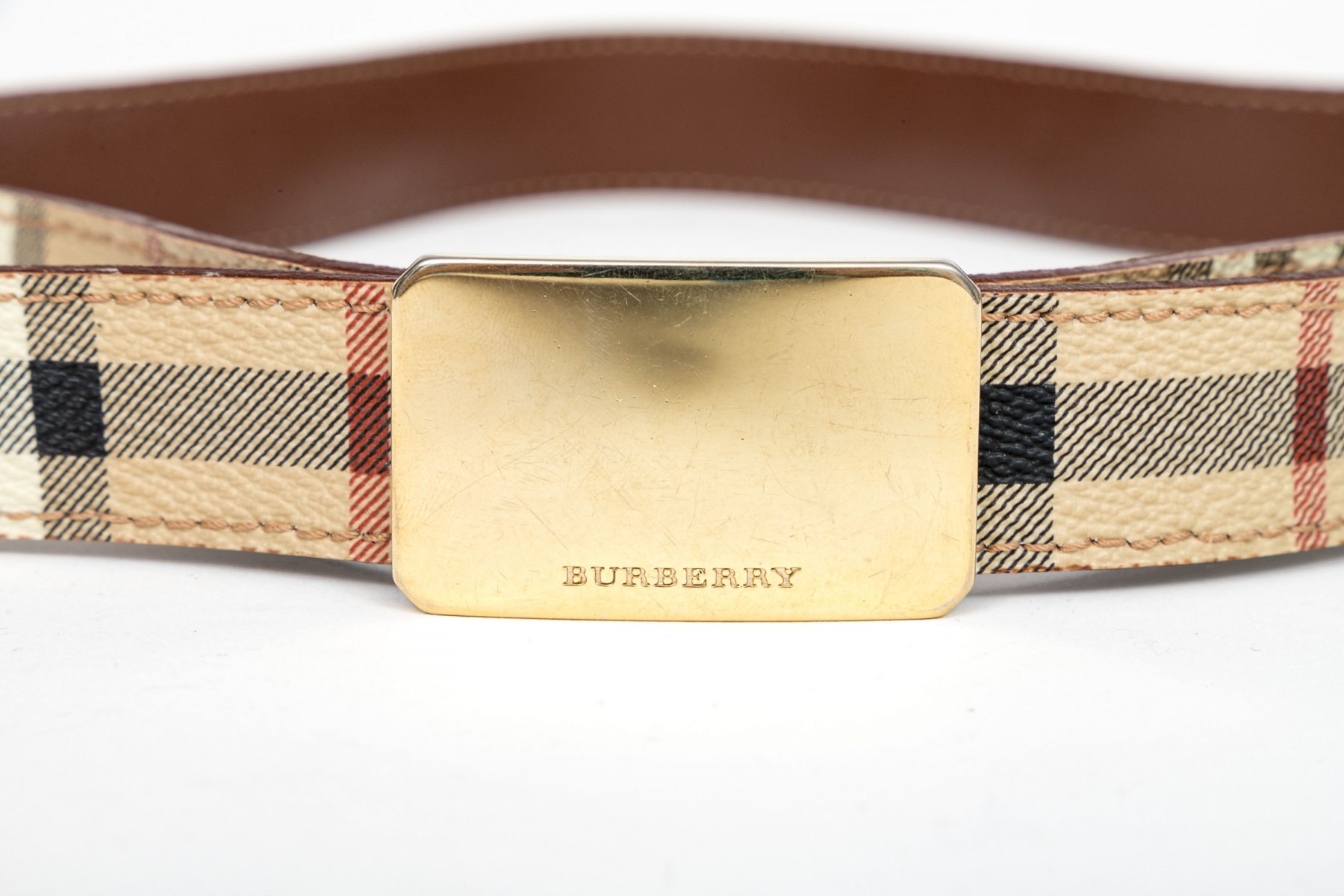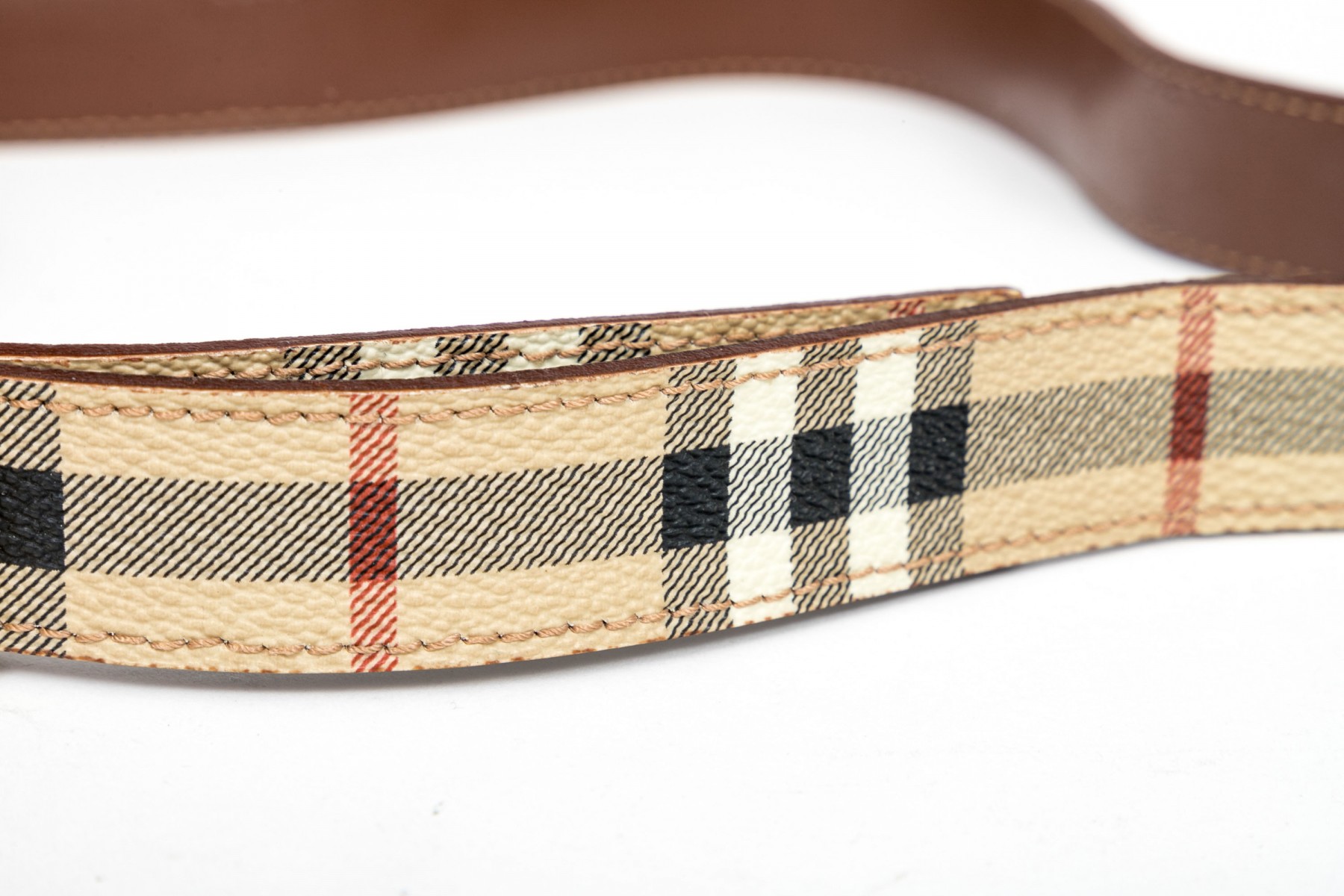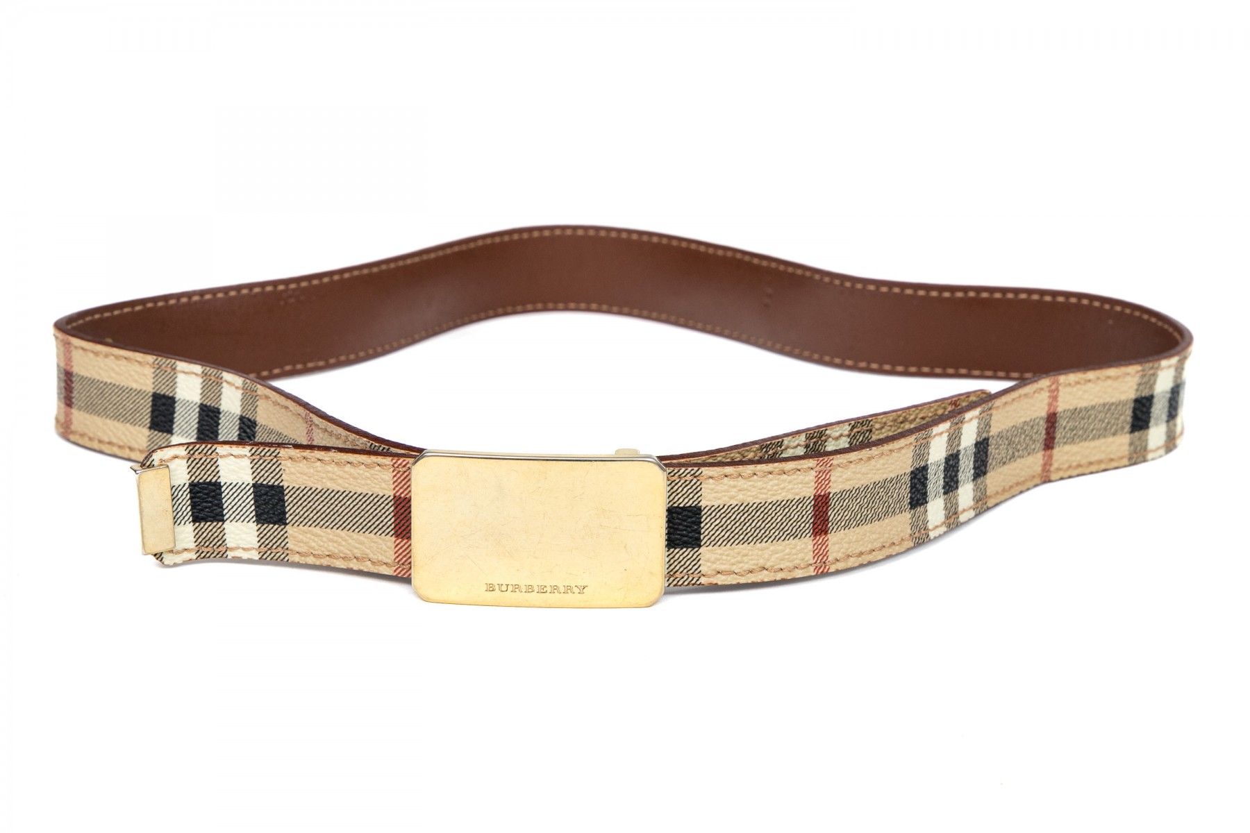 Burberry classic plaid leather belt with clamp buckle closure, 30/75, gold tone hardware