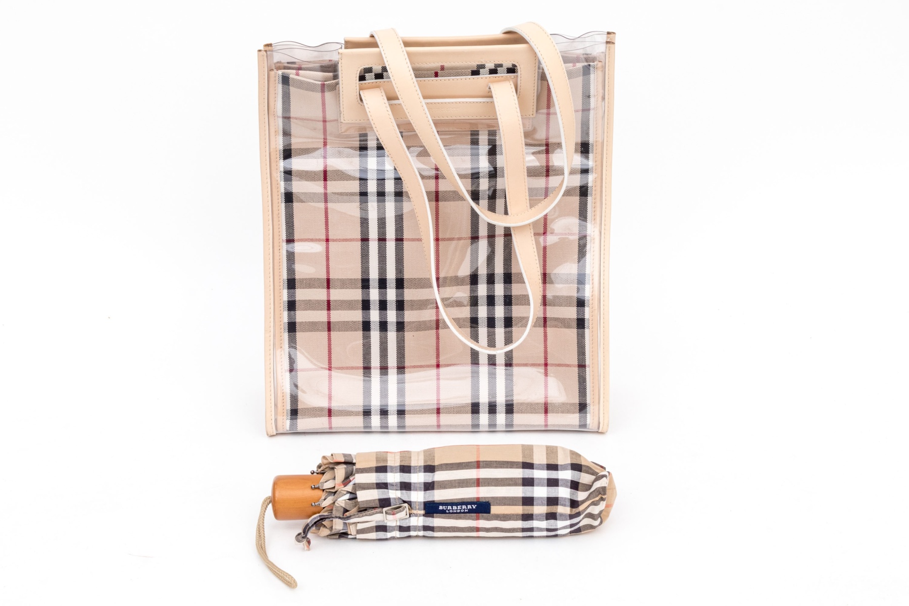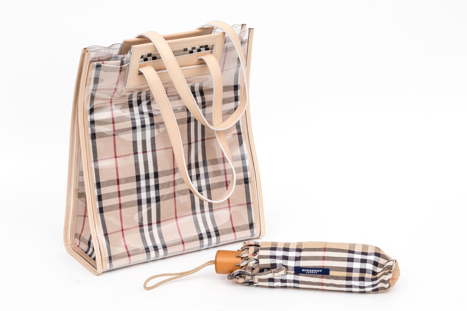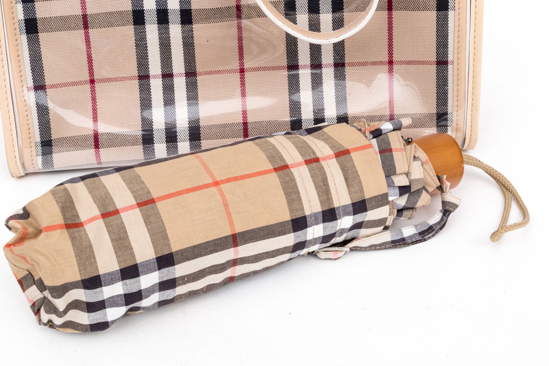 The bag is available in the classic tan black and burgundy red patterning. With matching umbrella.