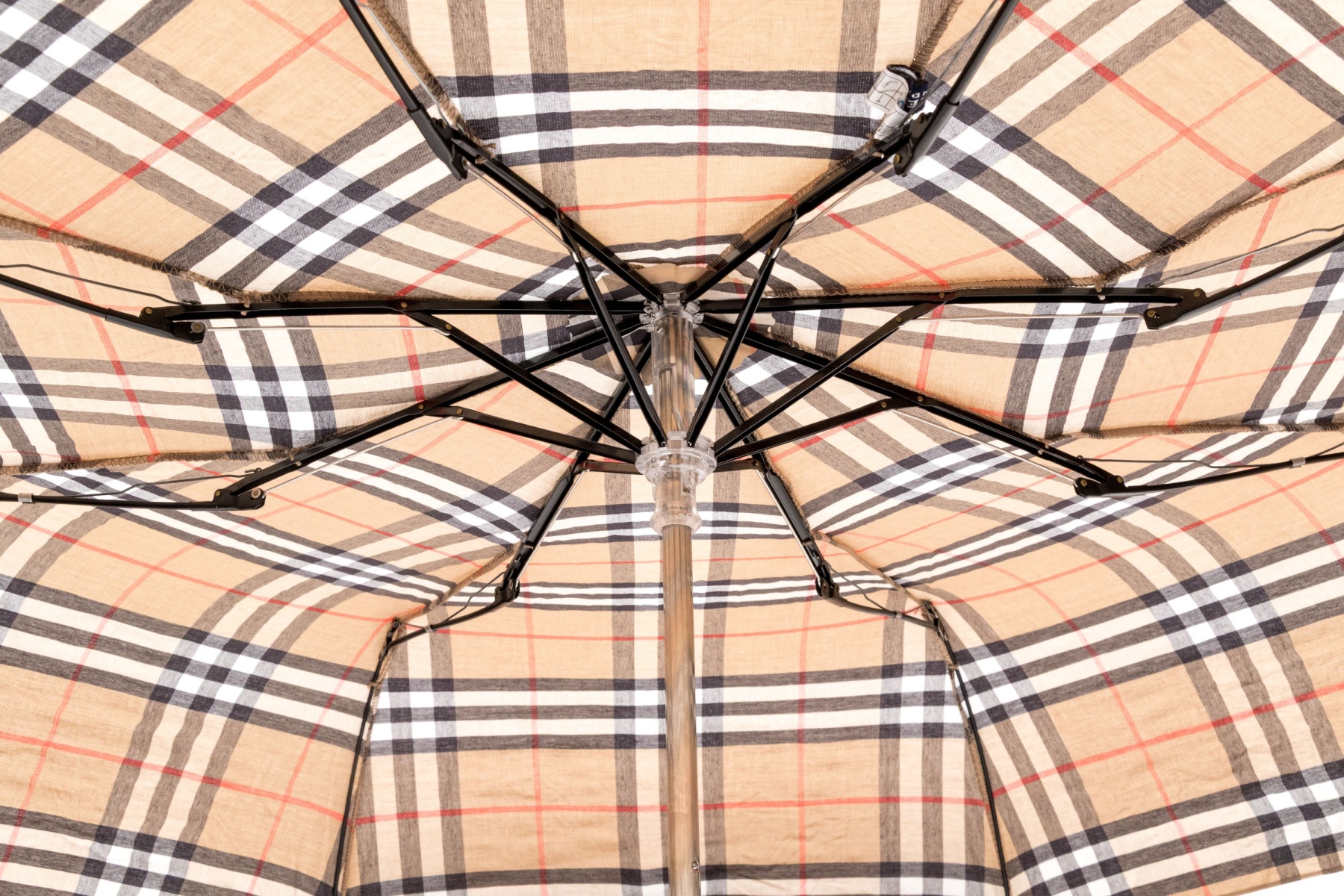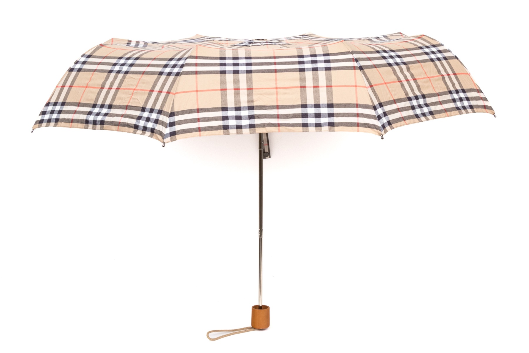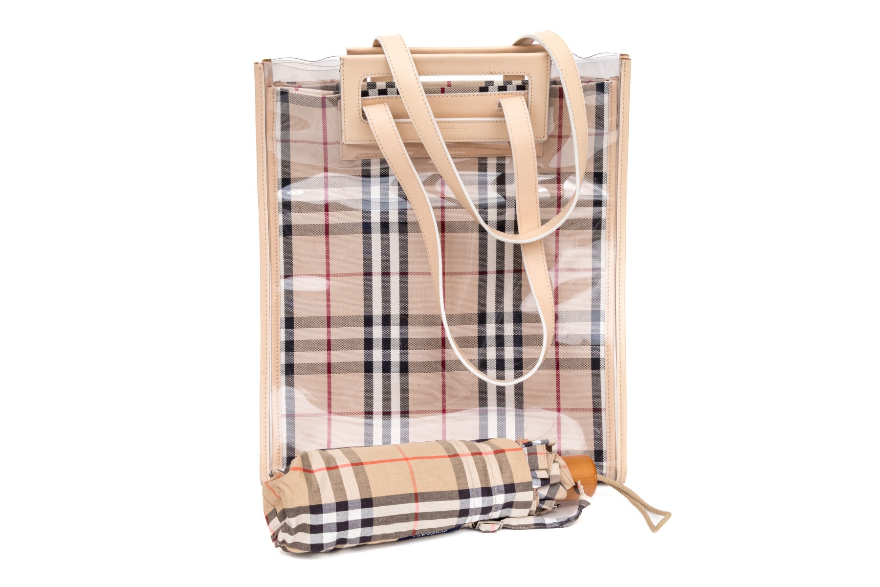 The bag is available in the classic tan black and burgundy red patterning. With matching umbrella.