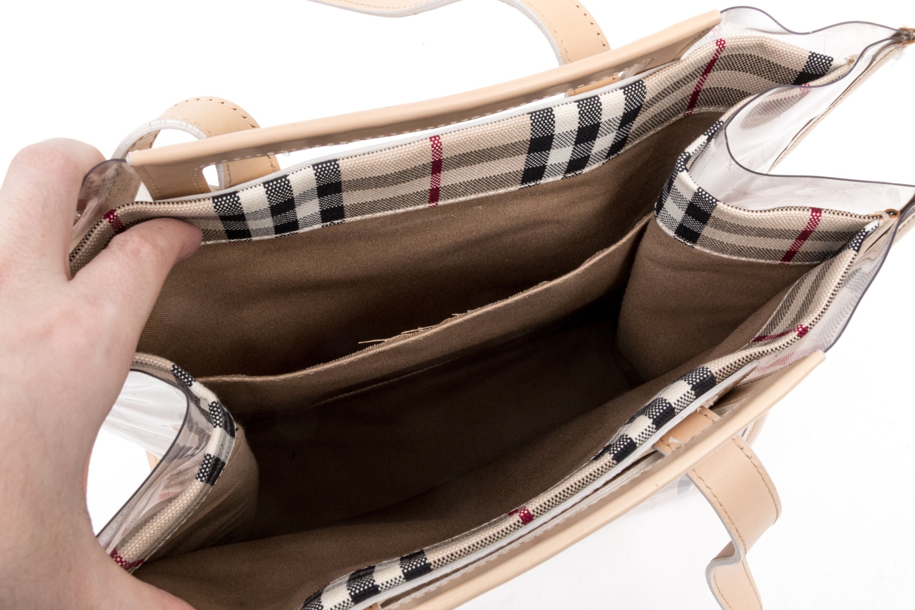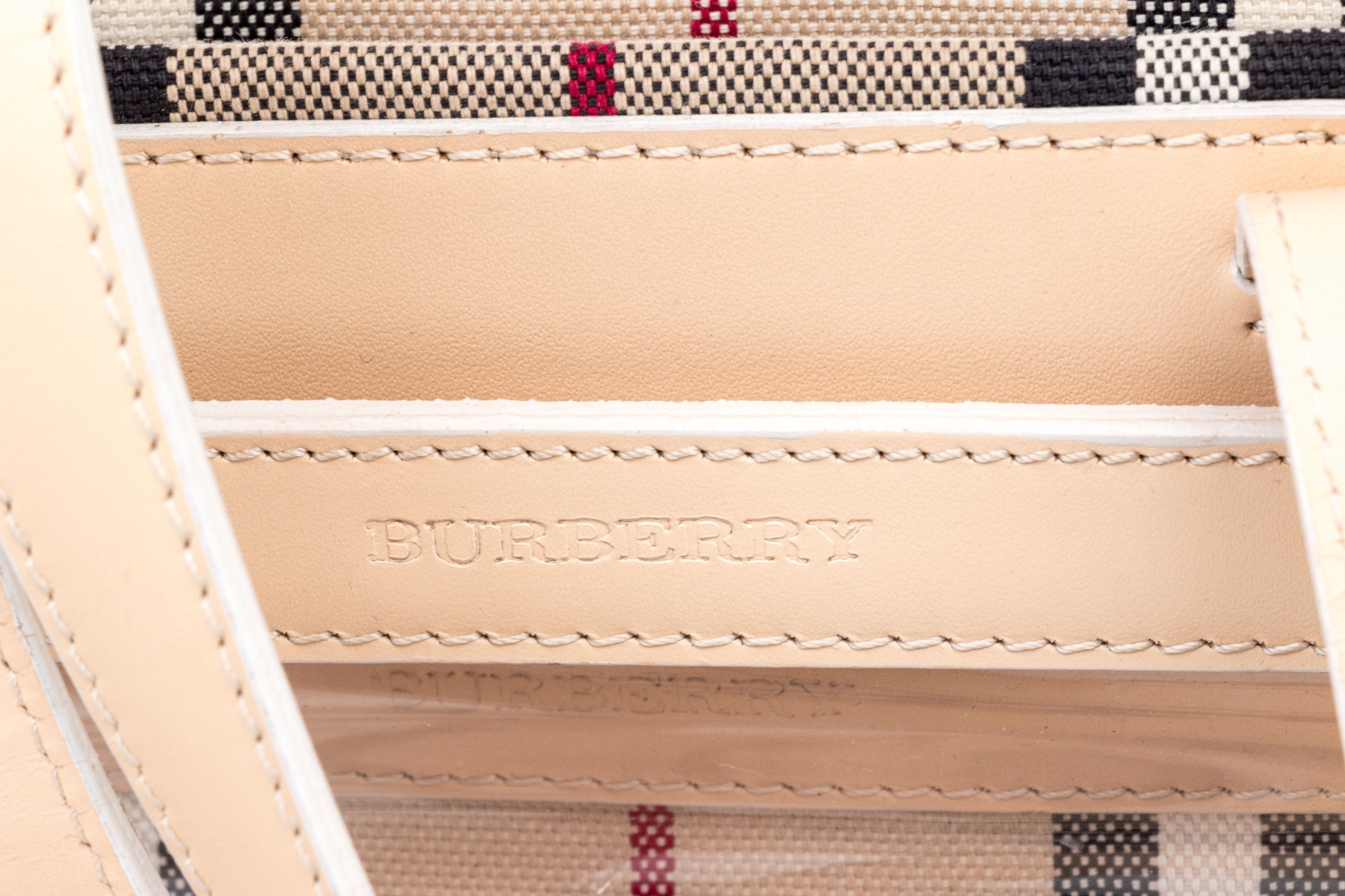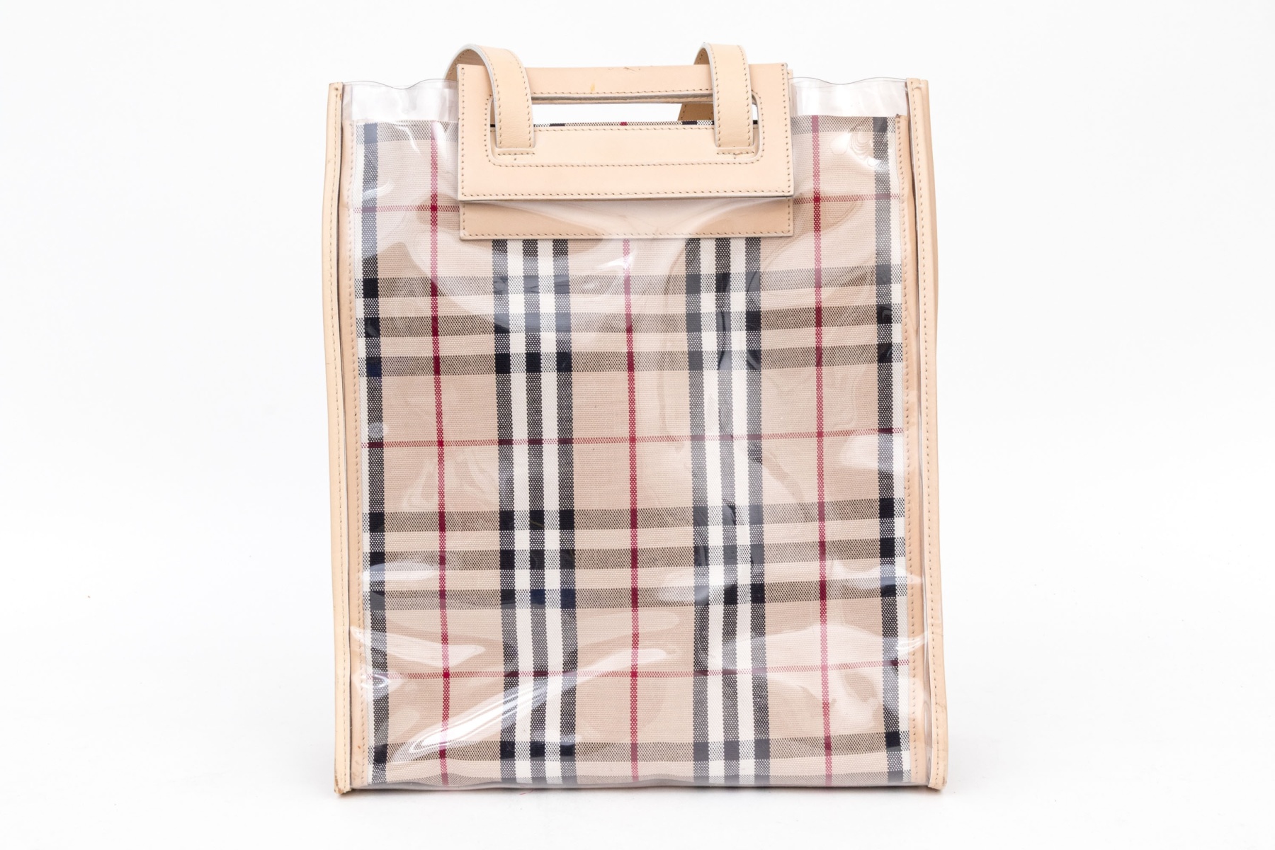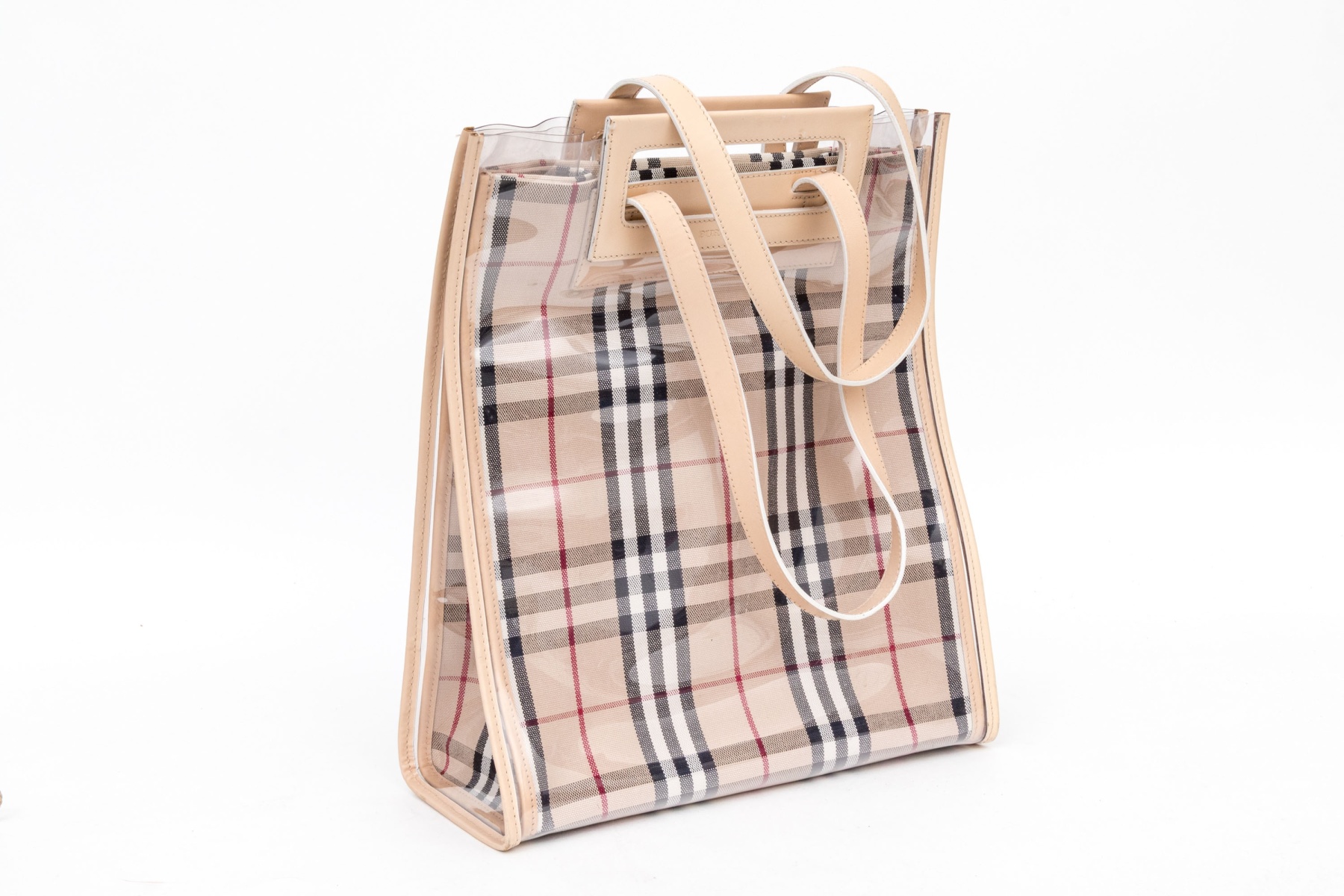 The product is a Burberry Nova Check Tote Bag, made from a blend of canvas, leather, and vinyl with the iconic Burberry Nova Check pattern and it features dual leather top handle straps and a spacious main compartment.