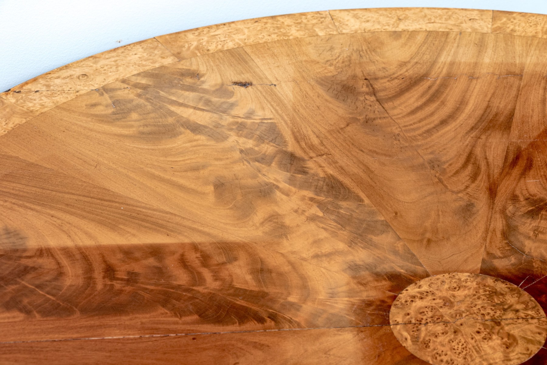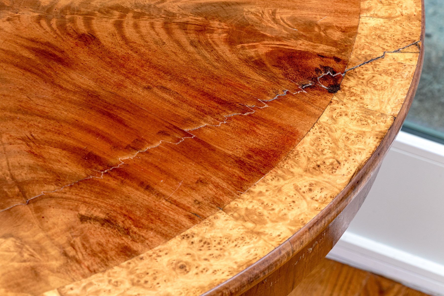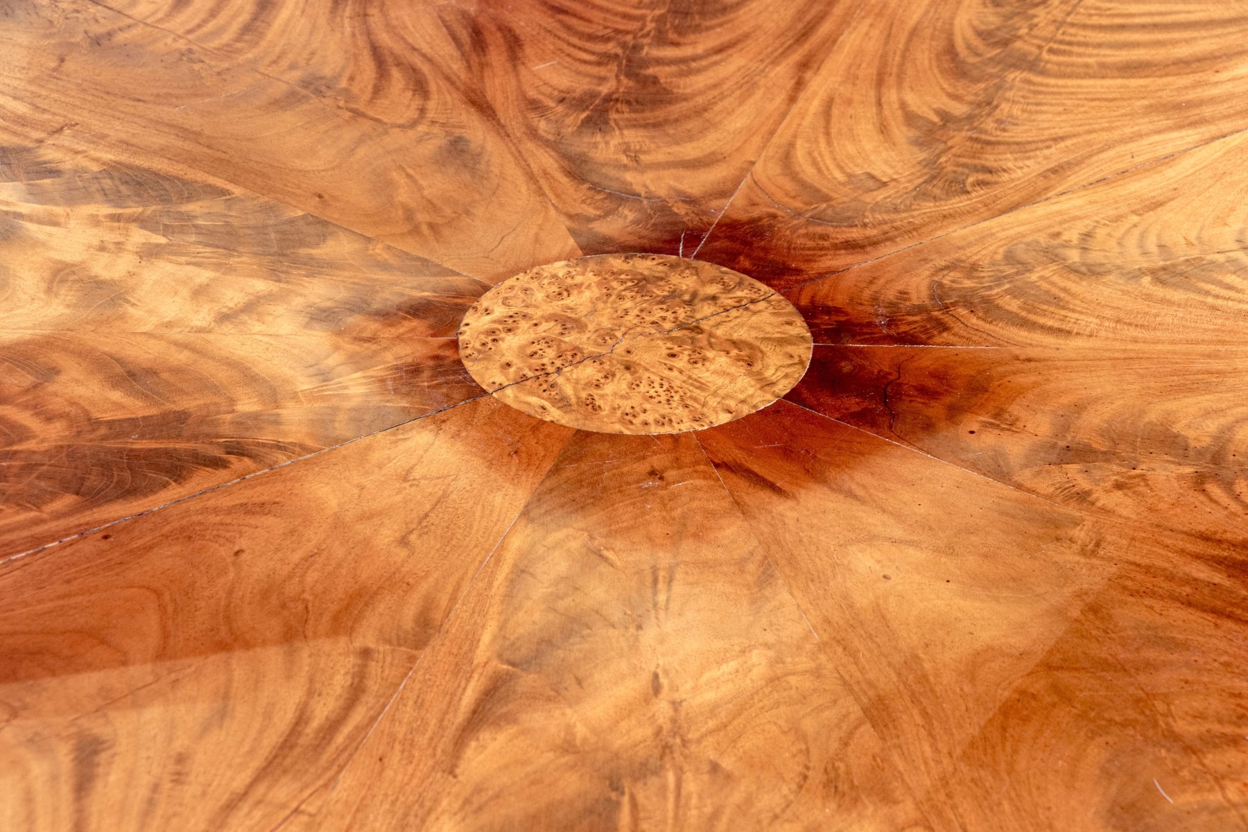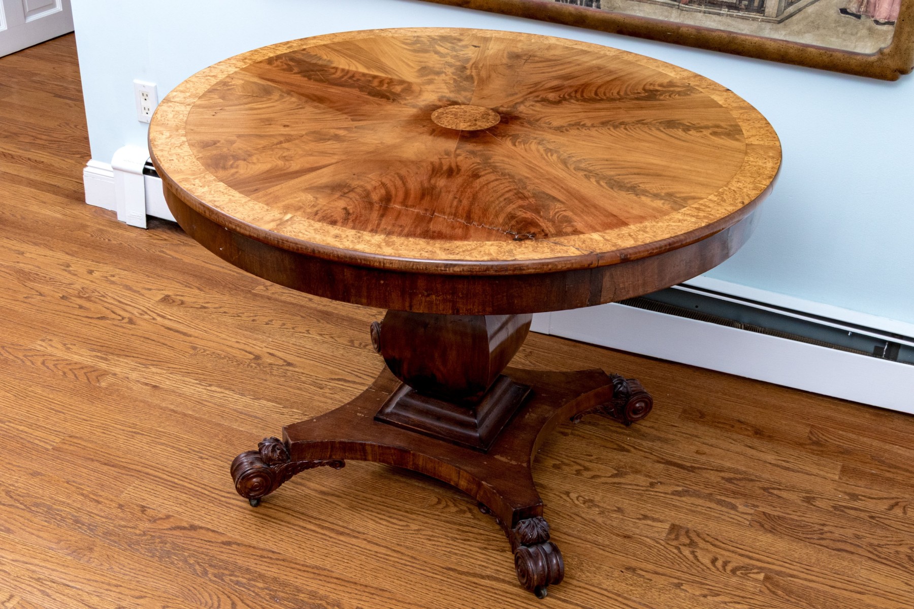 An elegant occasional table designed with stately Empire and Biedermeier influence in gorgeous figured burlwood veneers. The table sports a handsome circular top over a shapely squared pear form pedestal with a beveled square knop over a concave curved base. Finished with elegantly carved feet over casters for easy mobility.