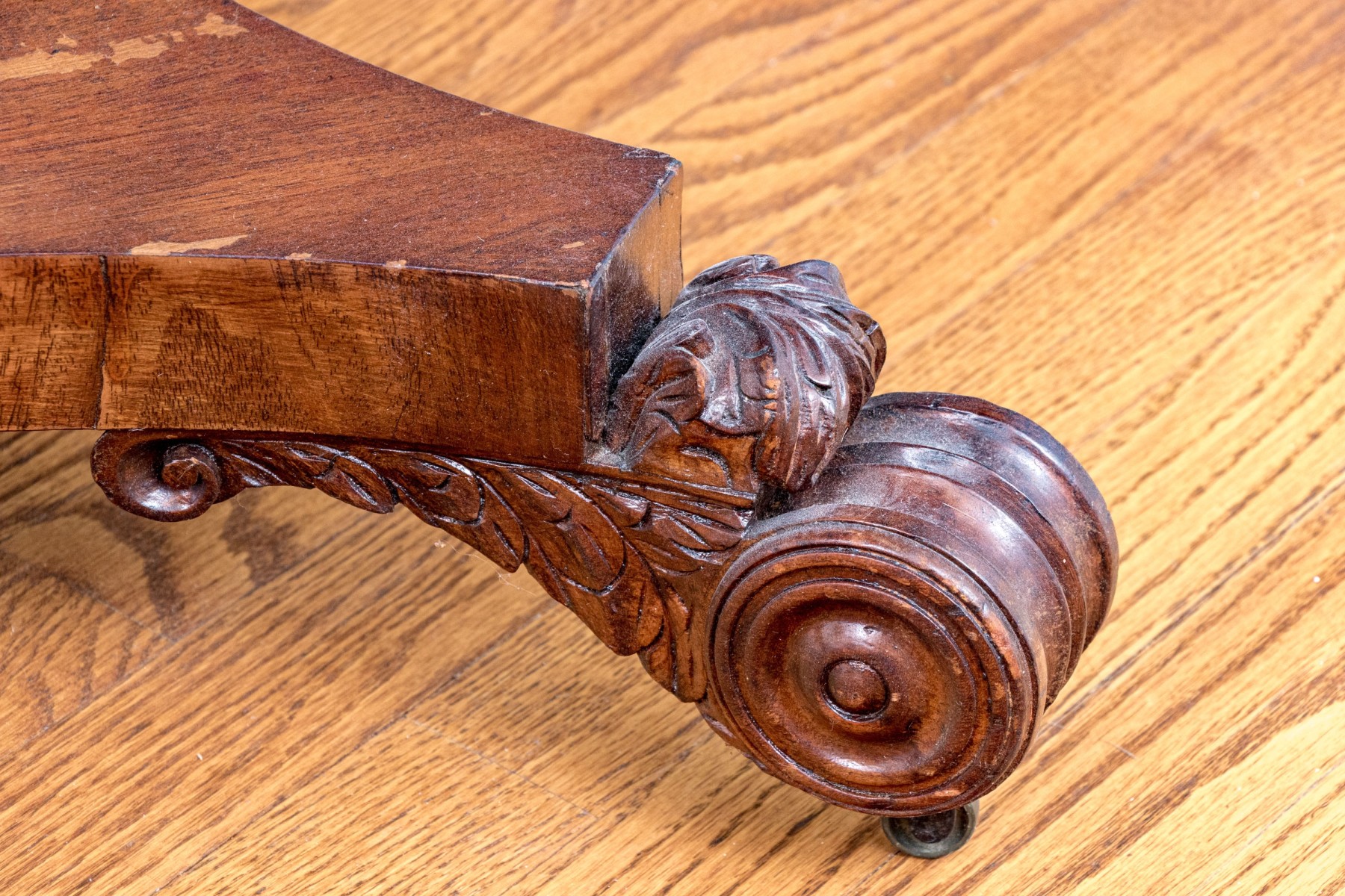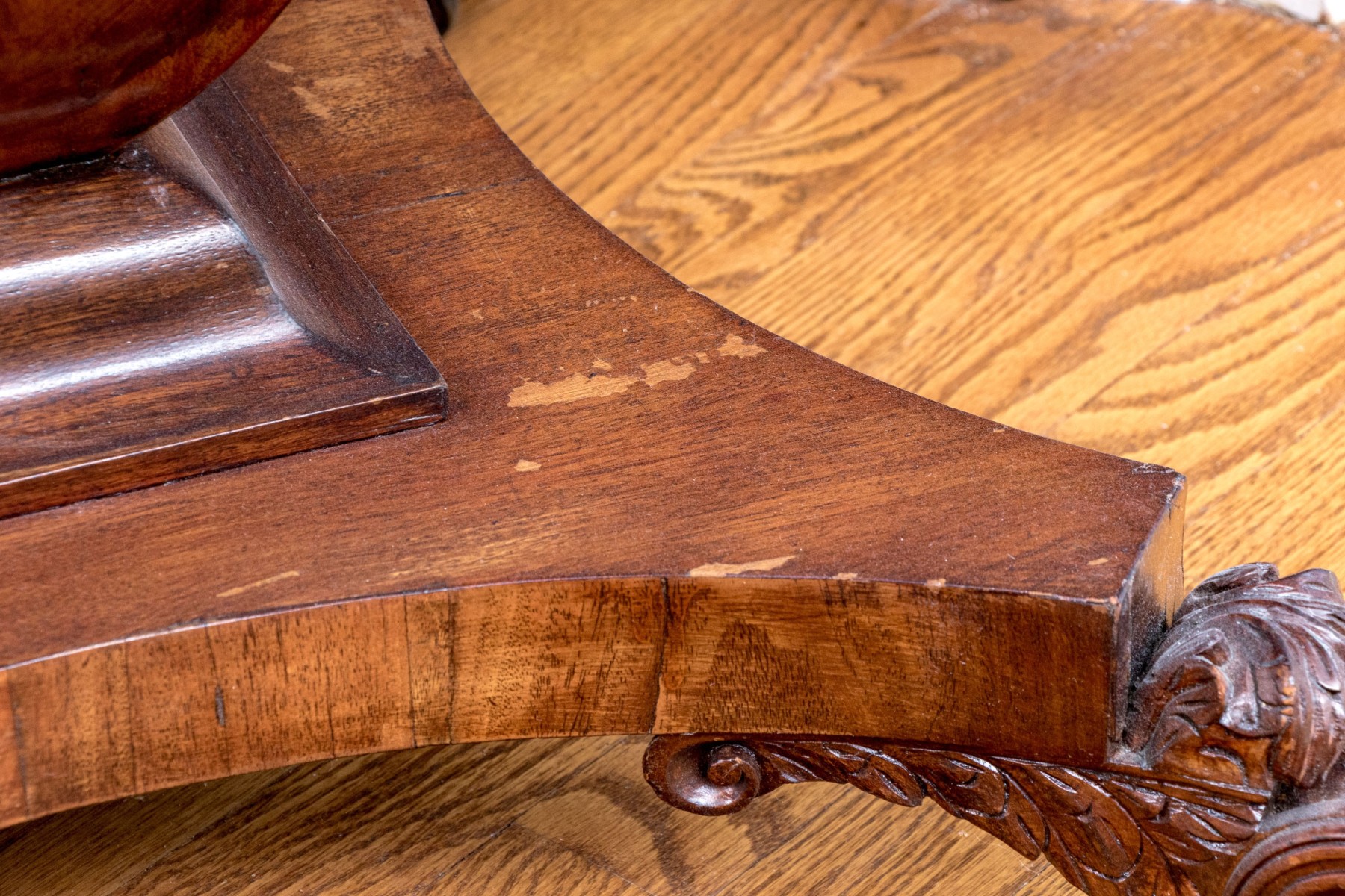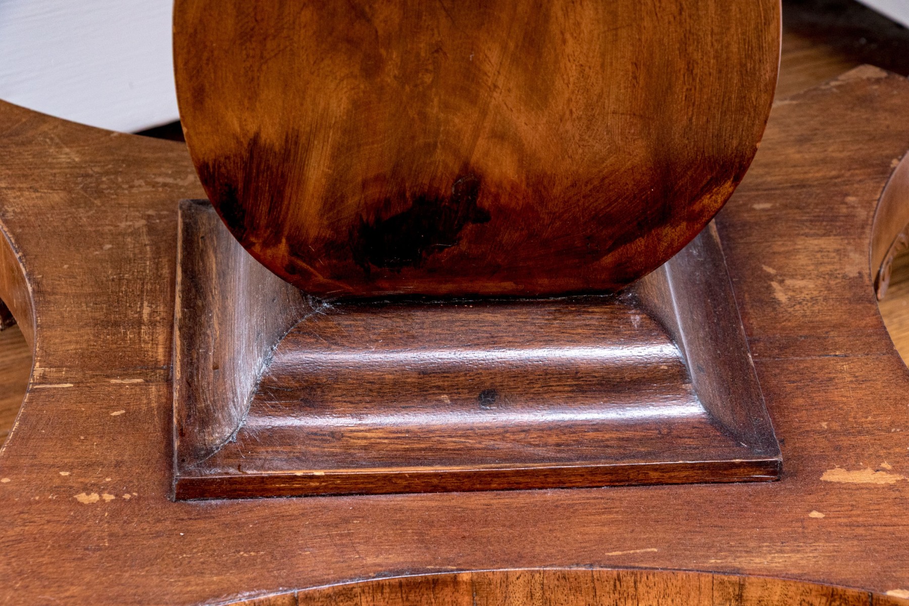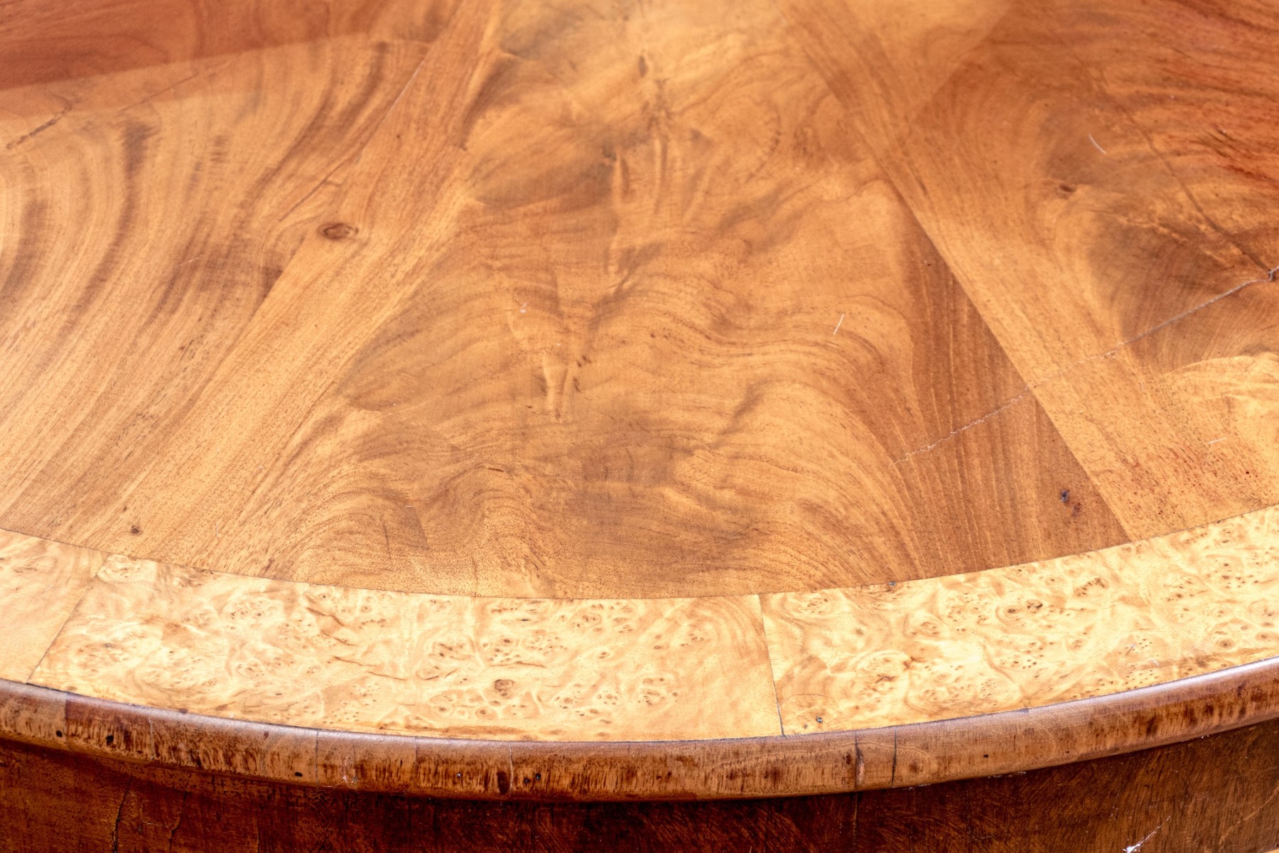 An elegant occasional table designed with stately Empire and Biedermeier influence in gorgeous figured burlwood veneers. The table sports a handsome circular top over a shapely squared pear form pedestal with a beveled square knop over a concave curved base. Finished with elegantly carved feet over casters for easy mobility.