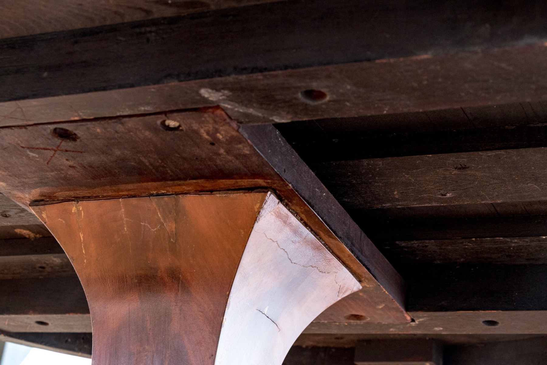 With wear commensurate with age and use but still presents well nonetheless. Checking to the table top, lifting and chipping veneers and one side is heavily sunned.