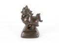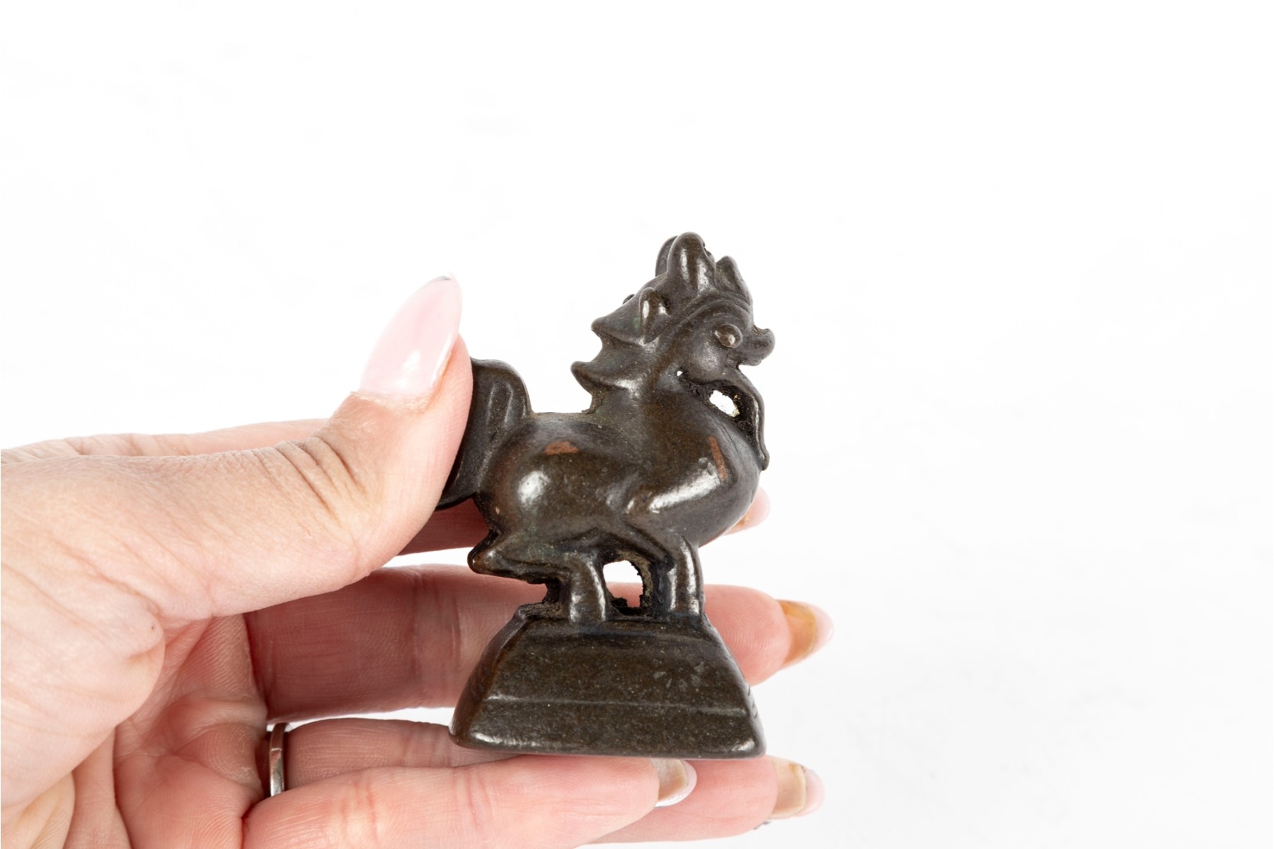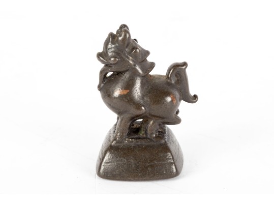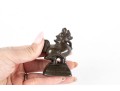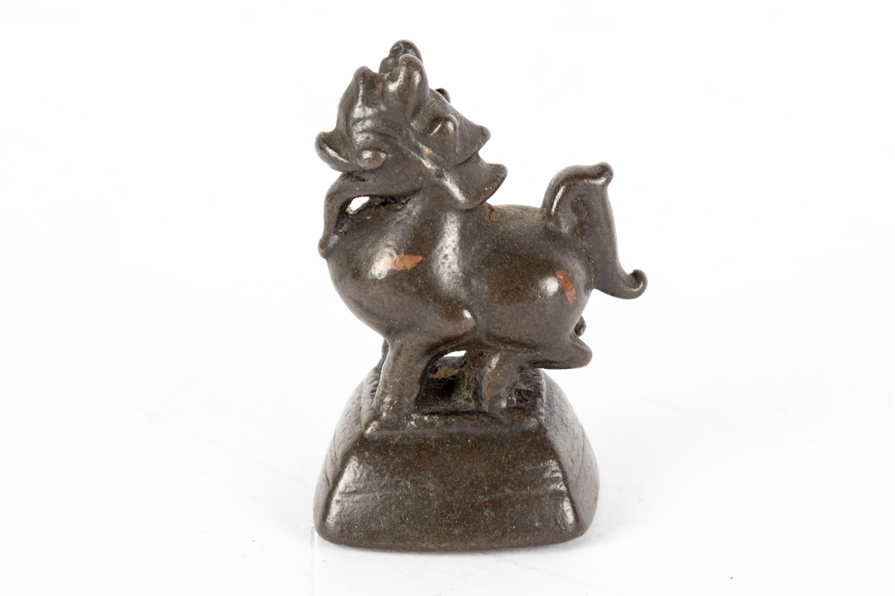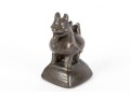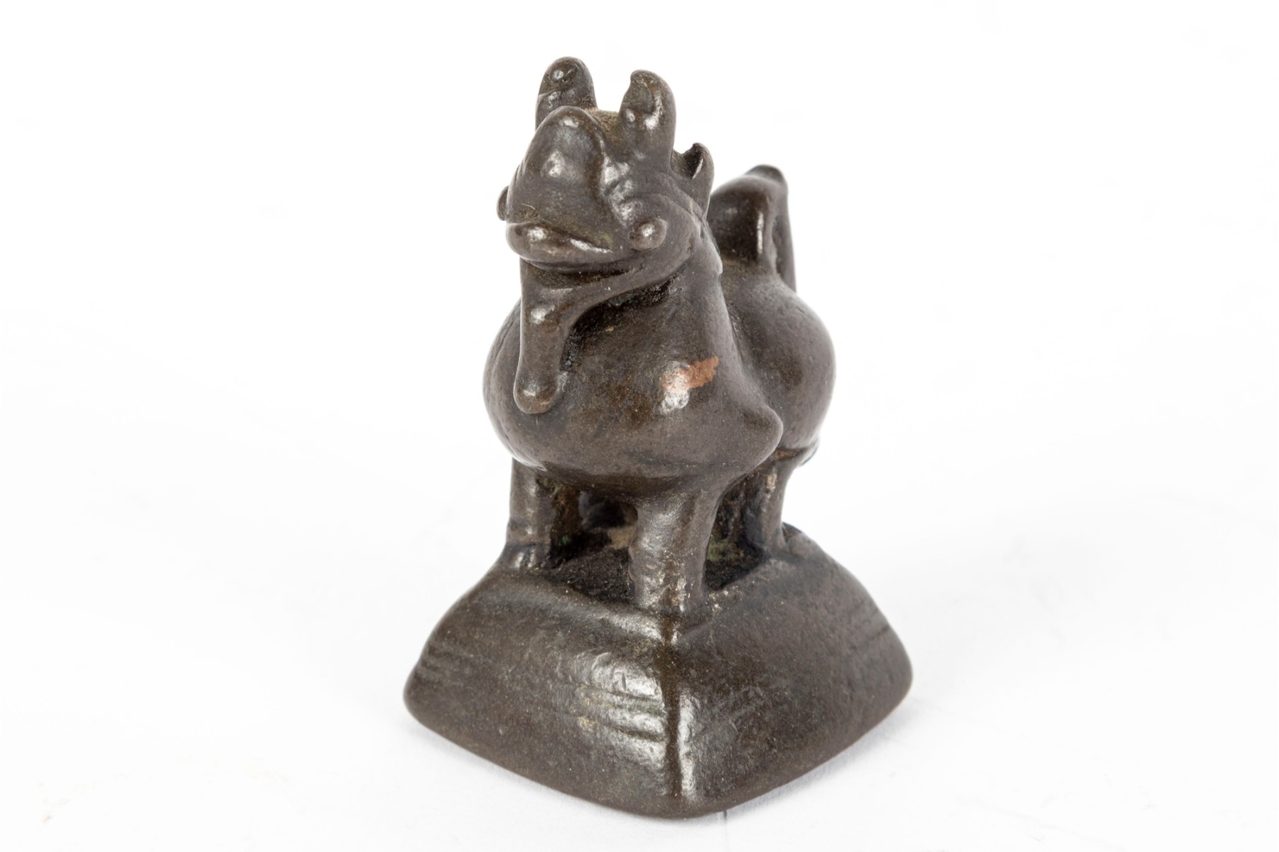 A lovely Burmese bronze opium weight in the form of a chinthe lion with a flared mane and high-arched tail seated over a pyramidal square base. With a nicely aged dark brown patina.