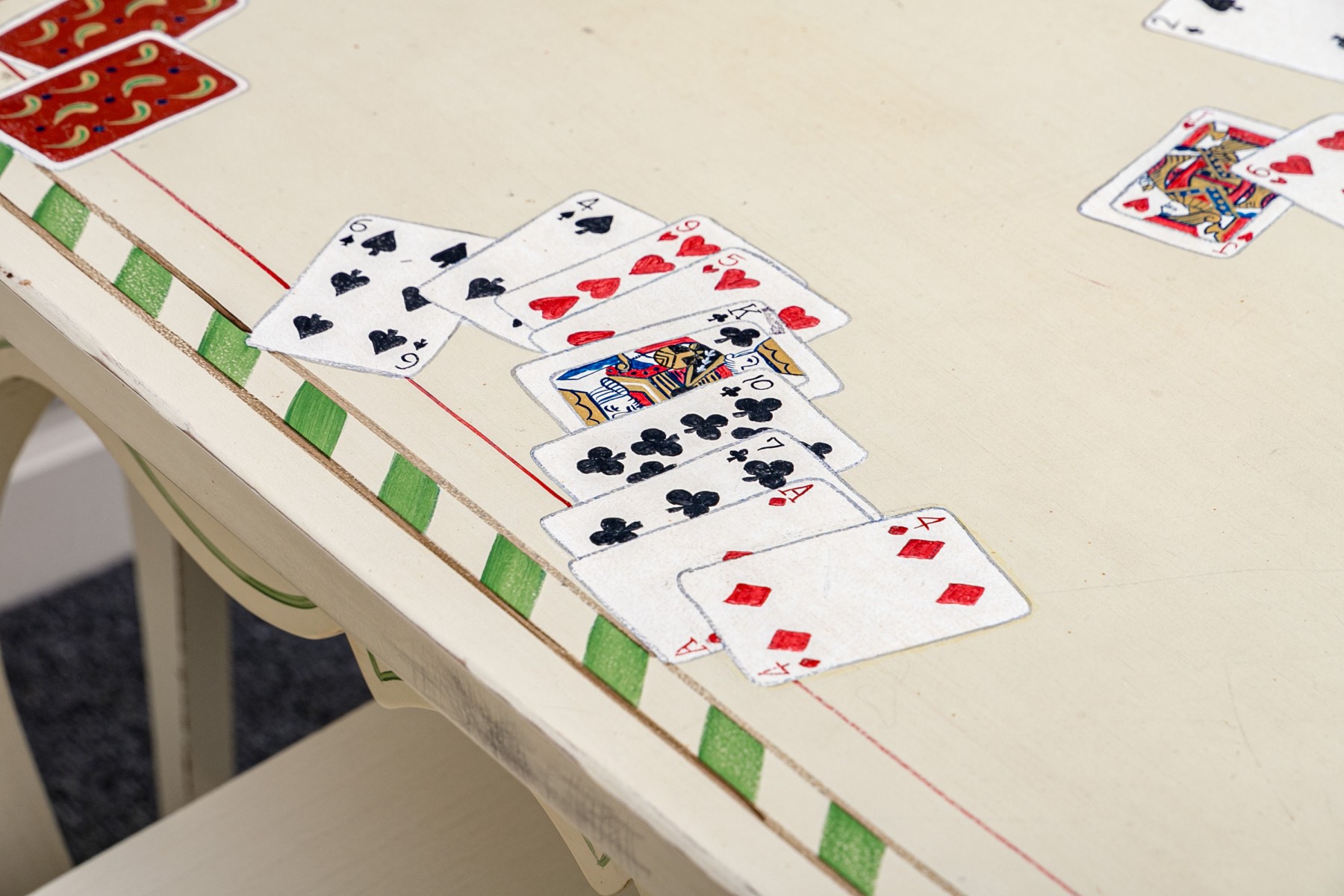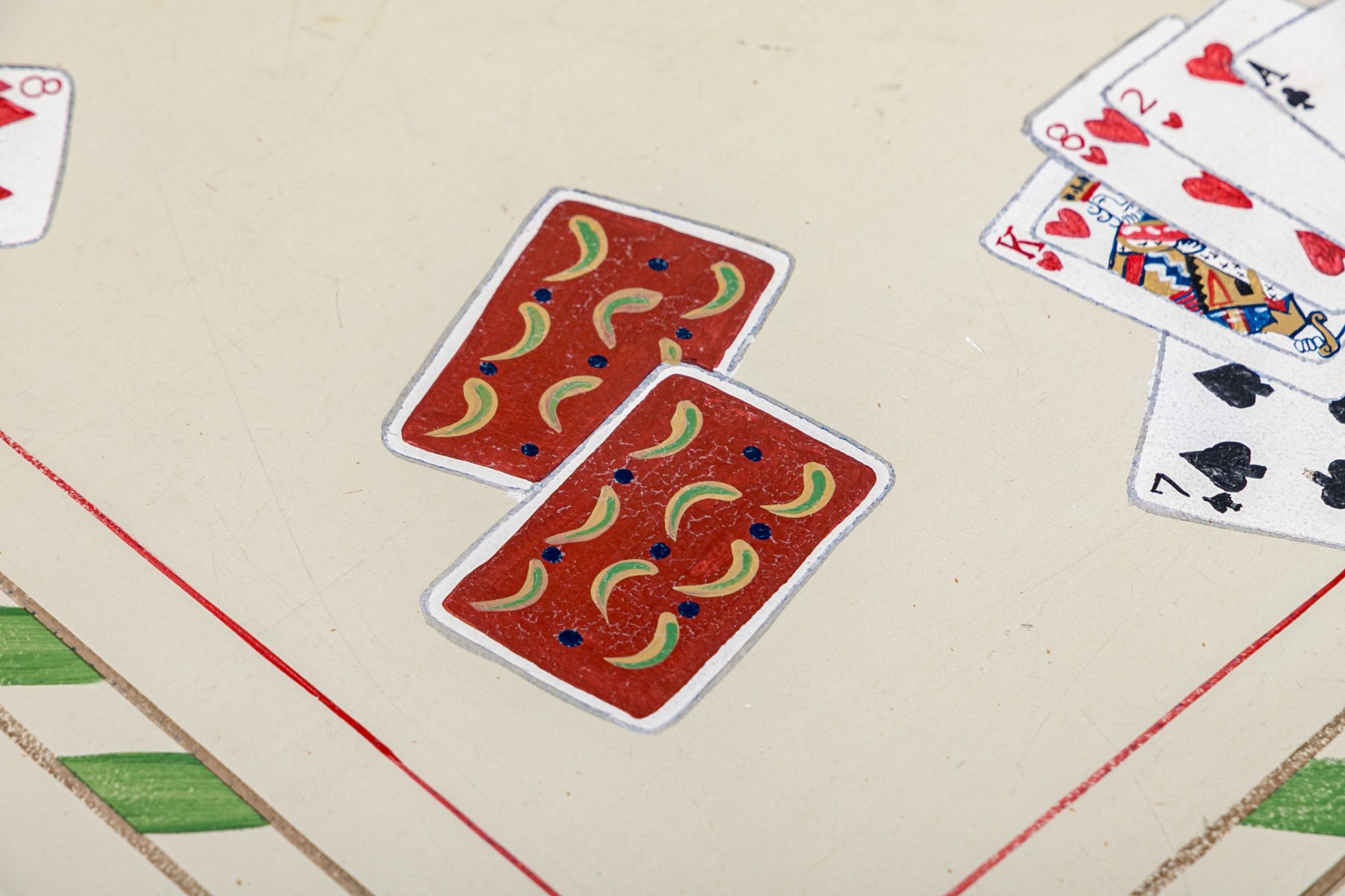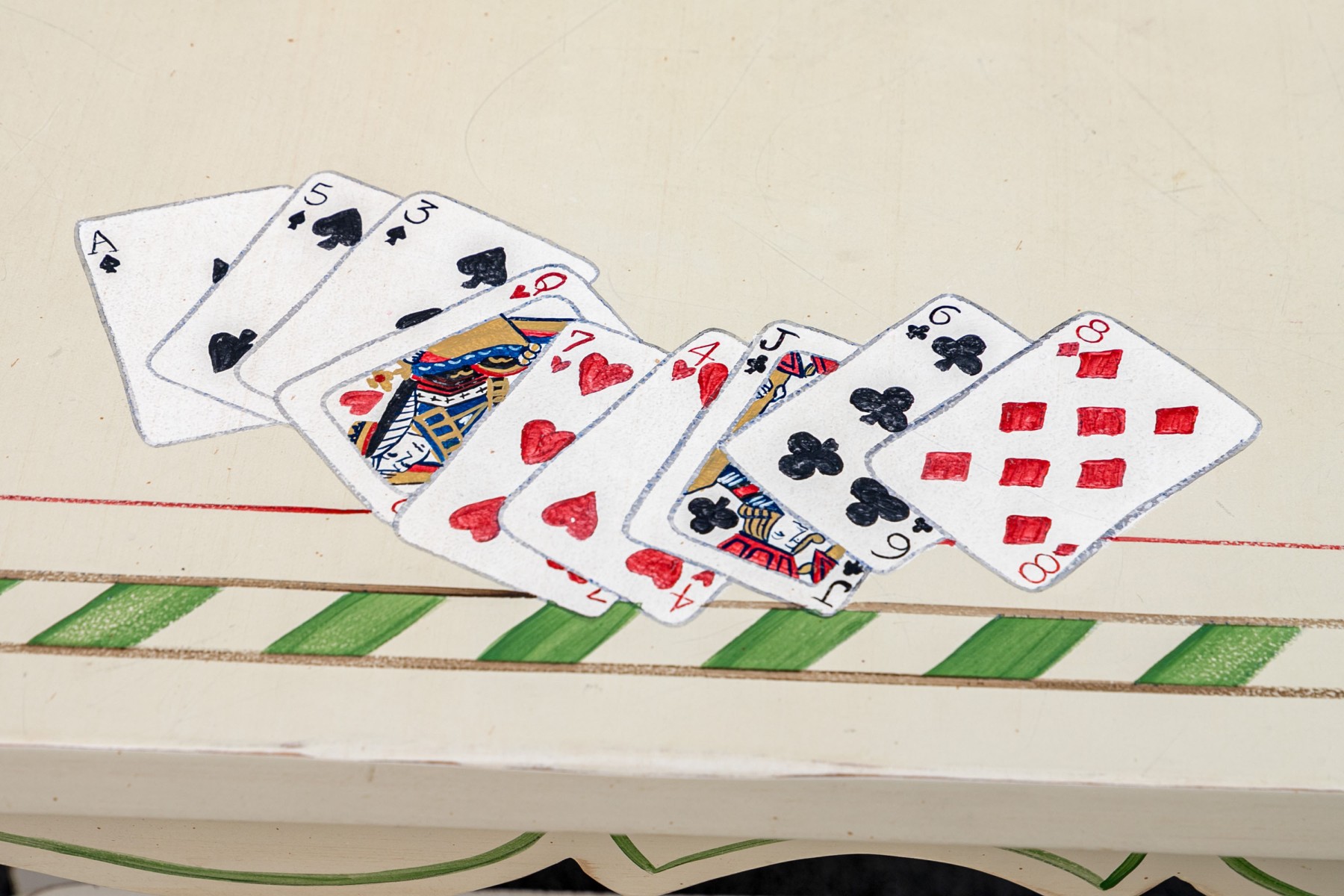 Buying & Design hand carved and painted games table on cabriole legs with card painted motif.