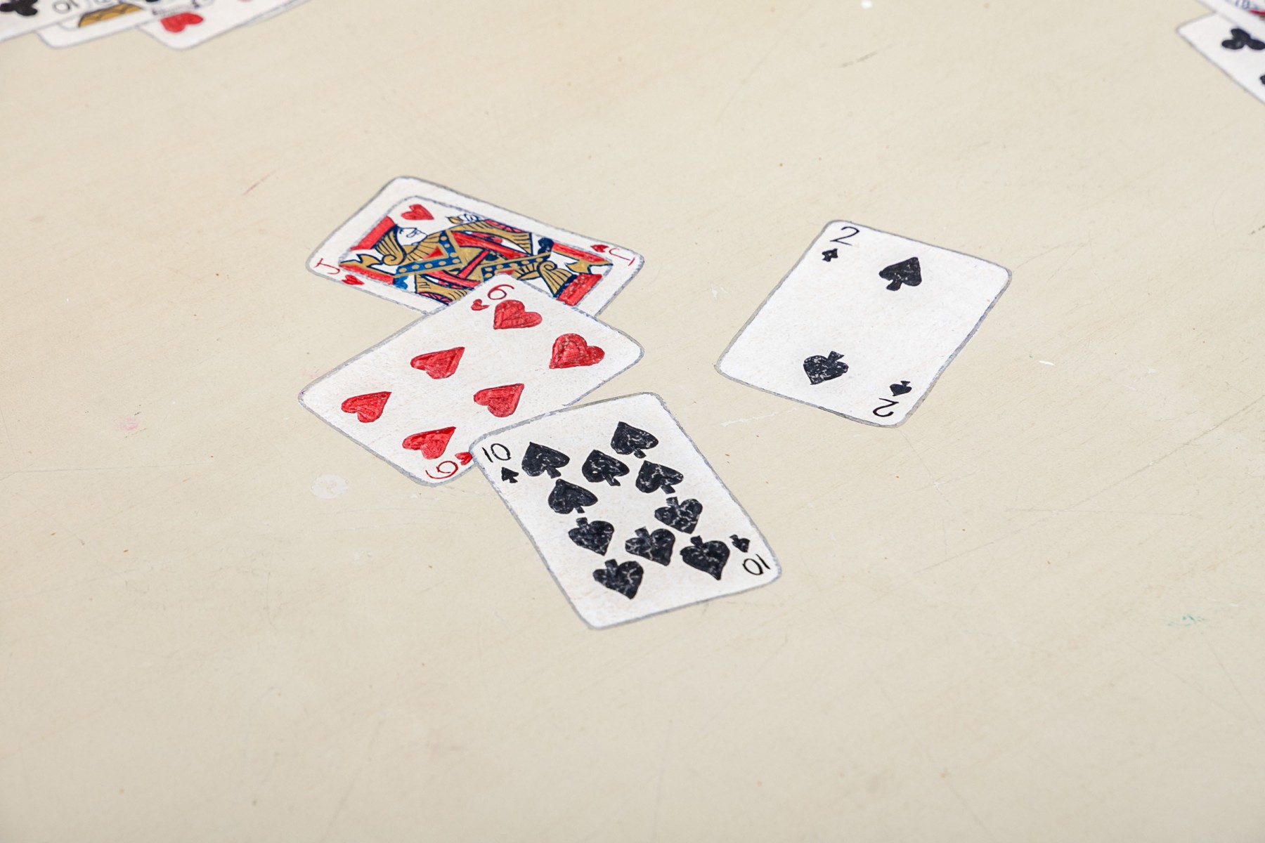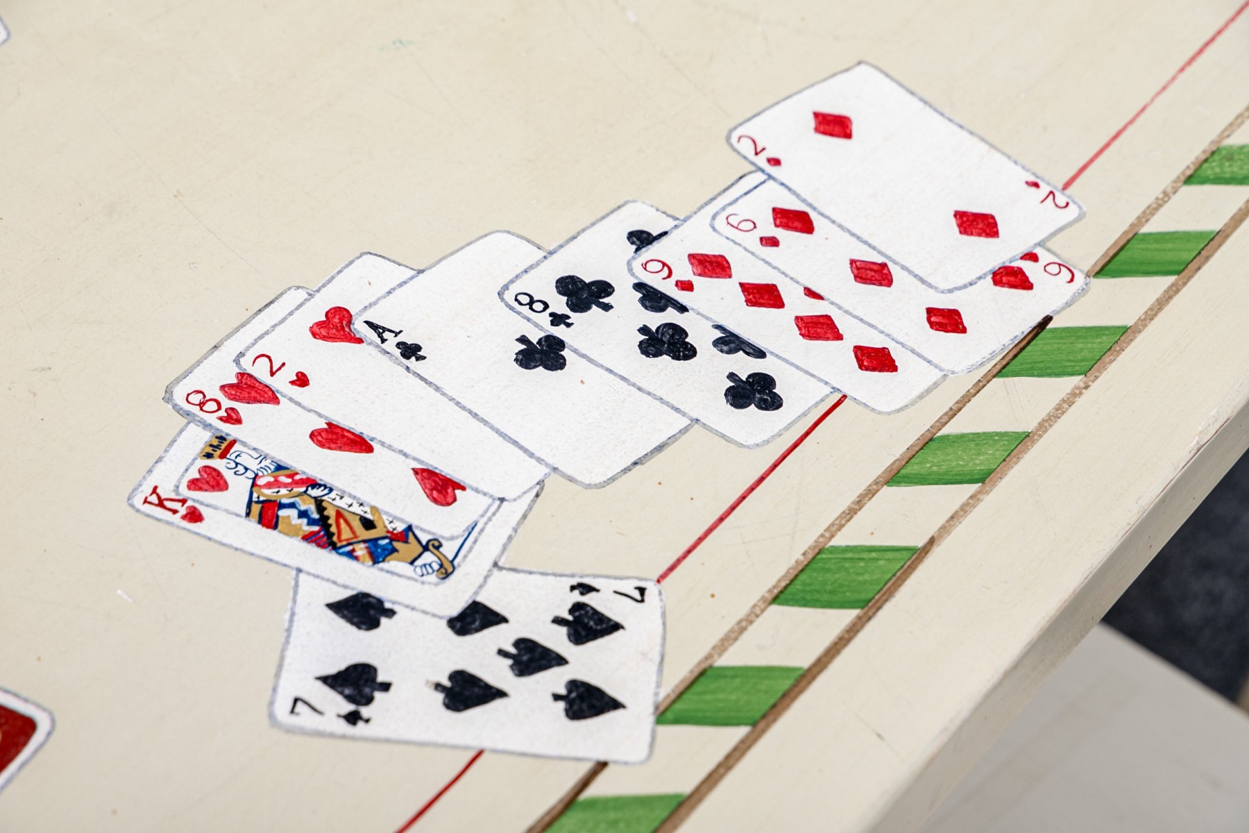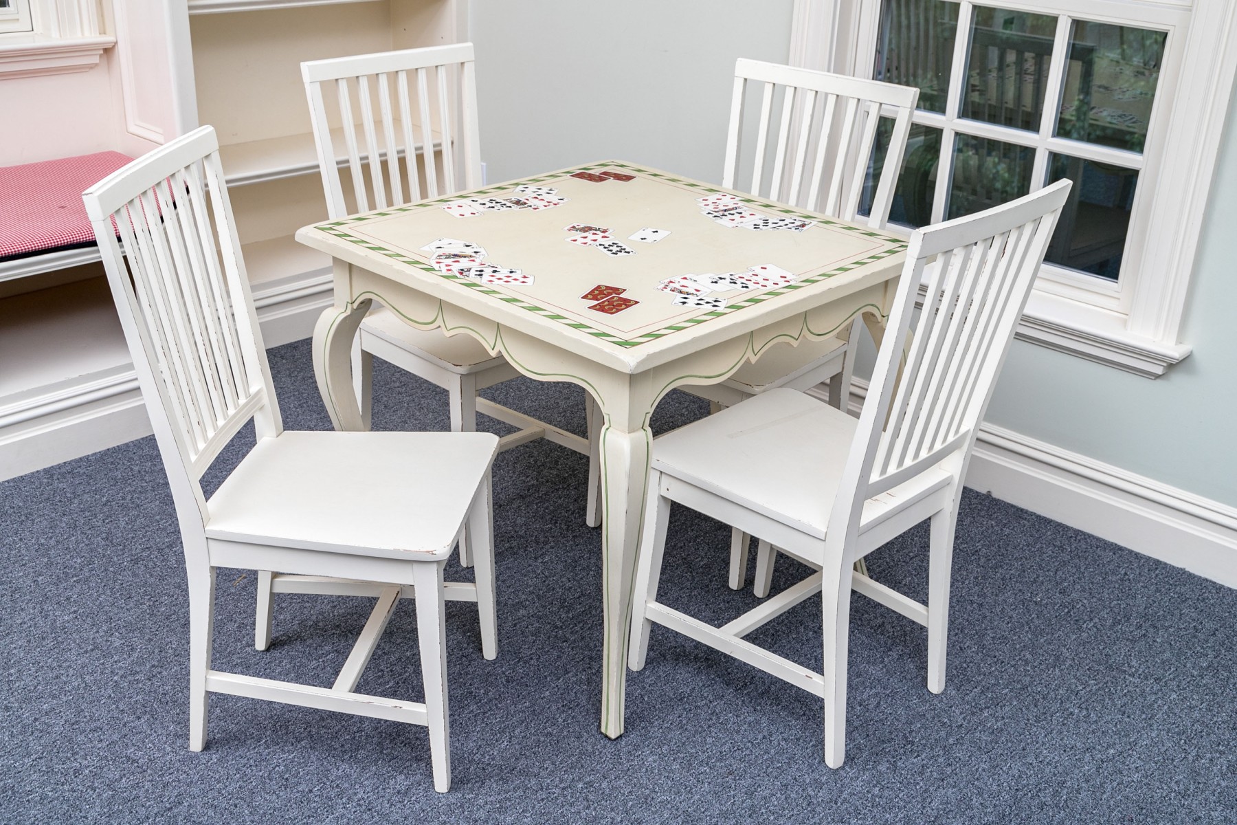 Buying & Design hand carved and painted games table on cabriole legs with card painted motif.