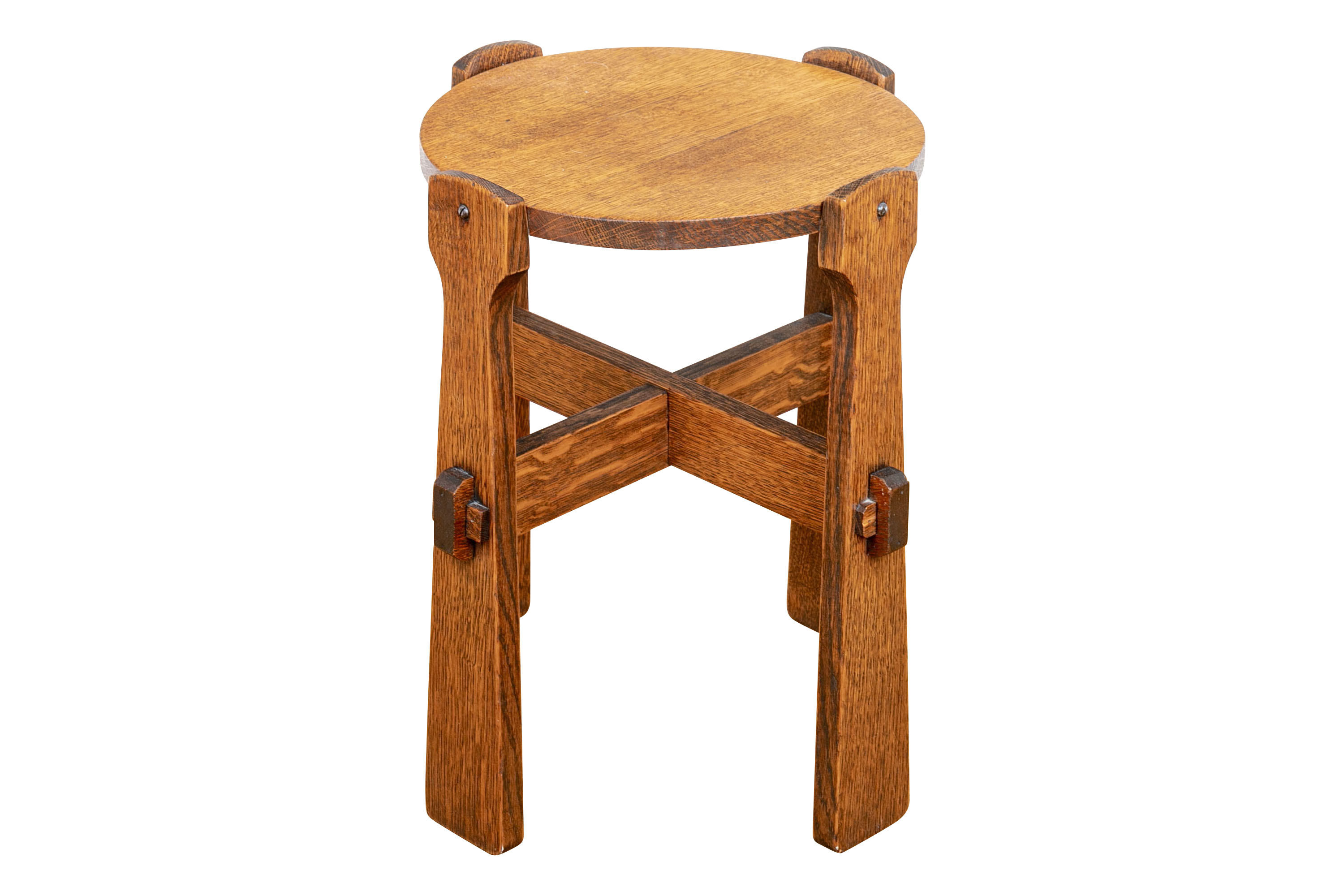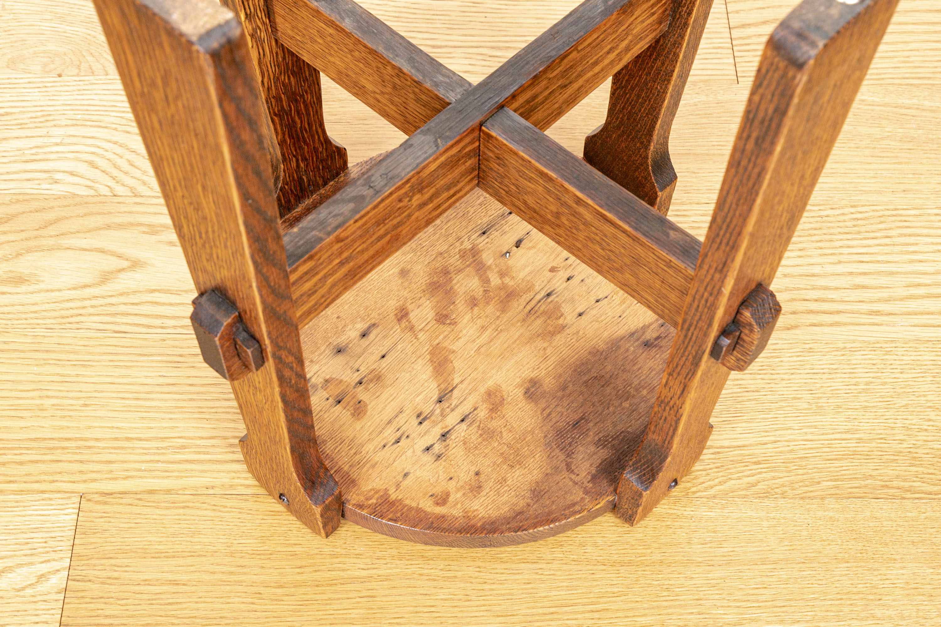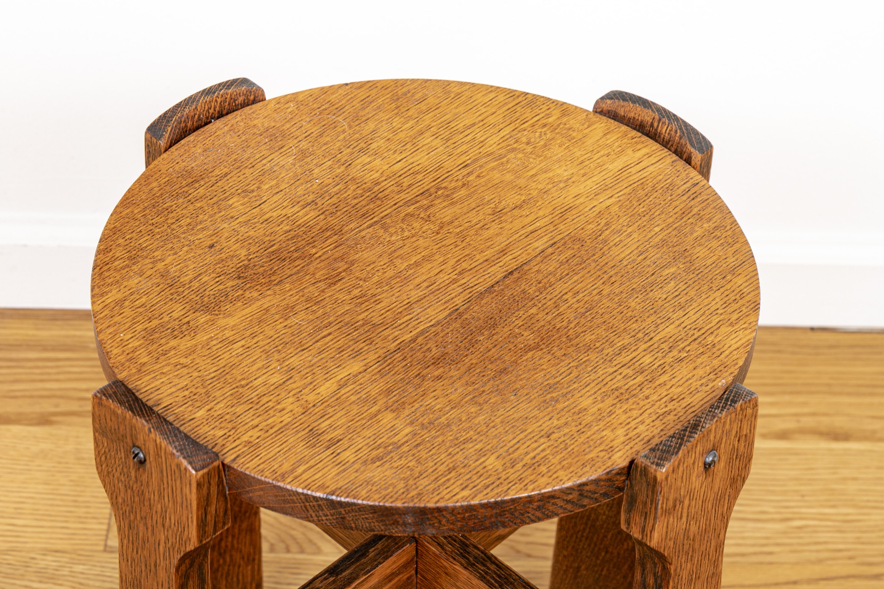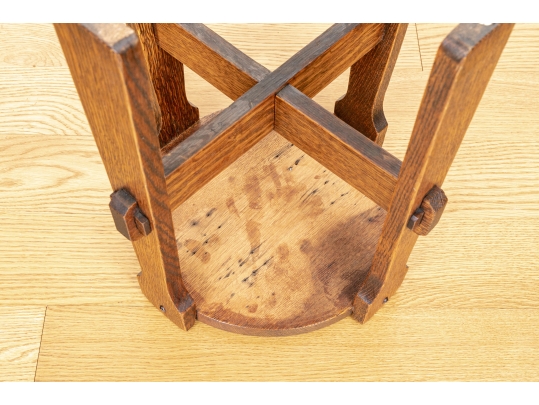 Originally purchased at Liberty, London. Arts and Crafts oak round accent table with X-form stretcher and keyed mortise & tenon joinery, resting on straight legs.