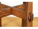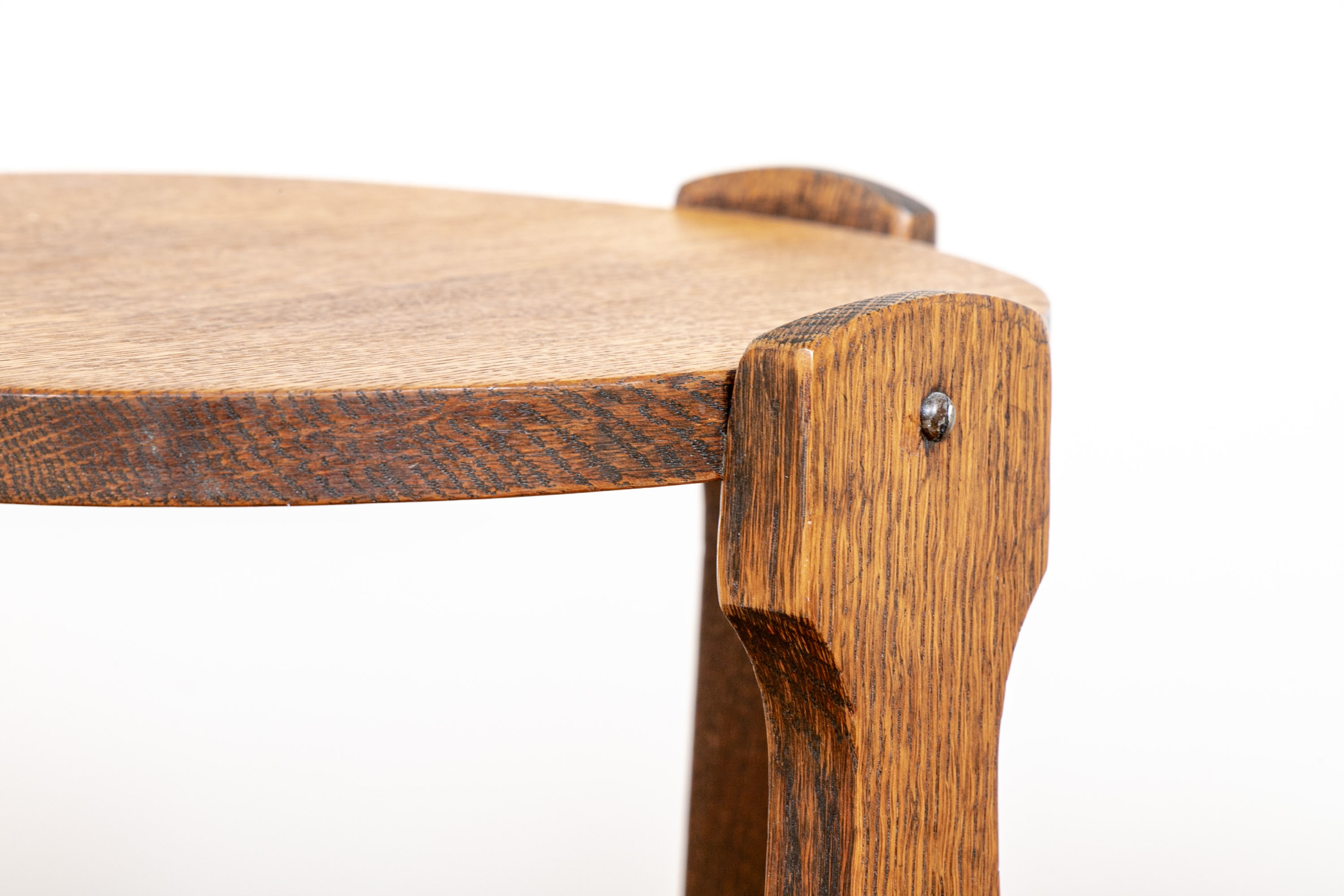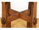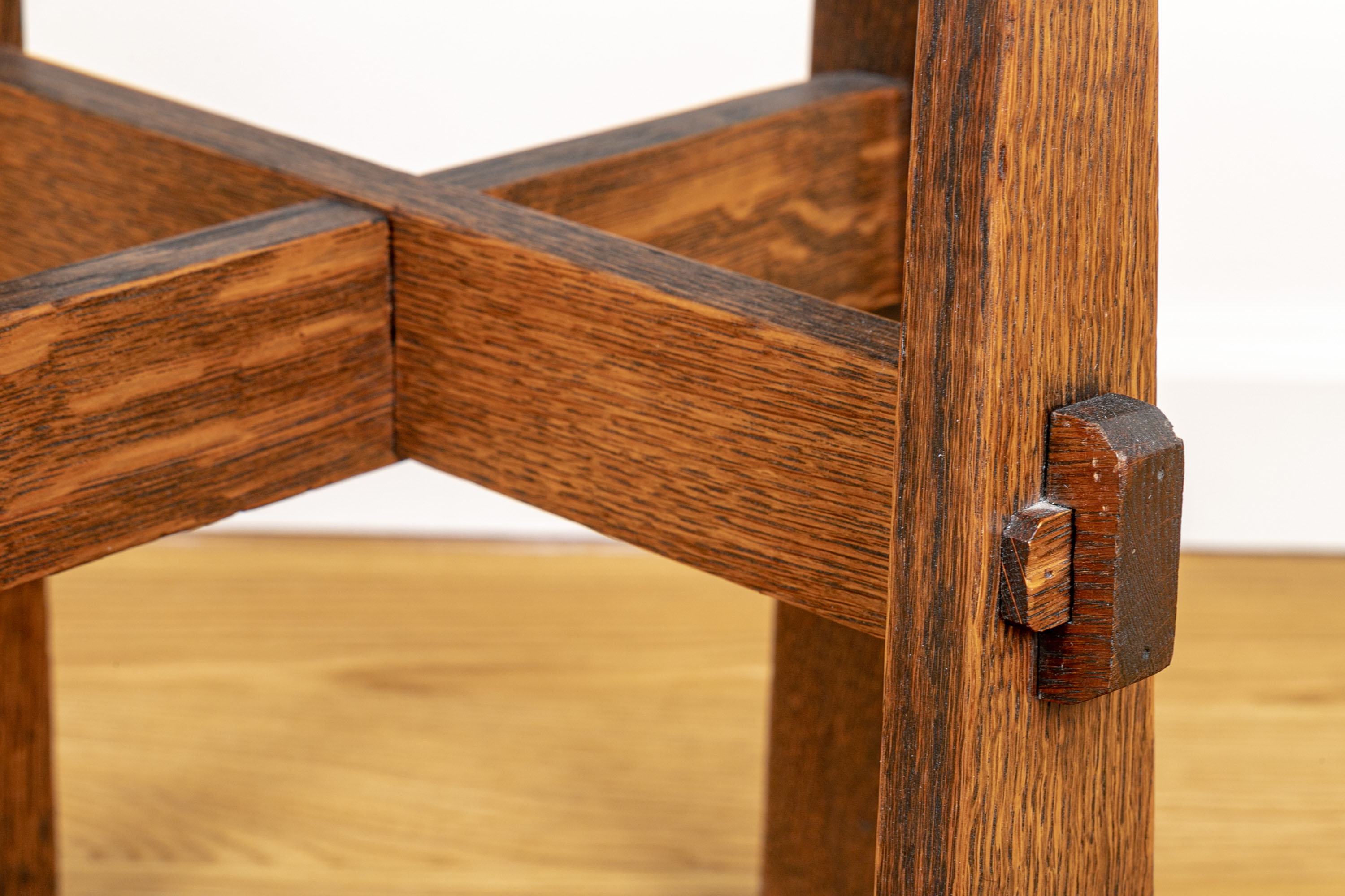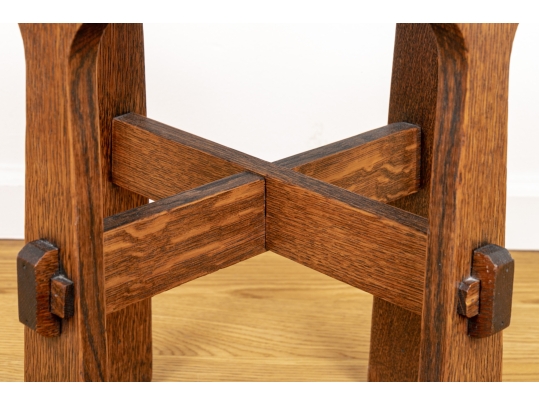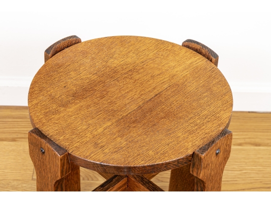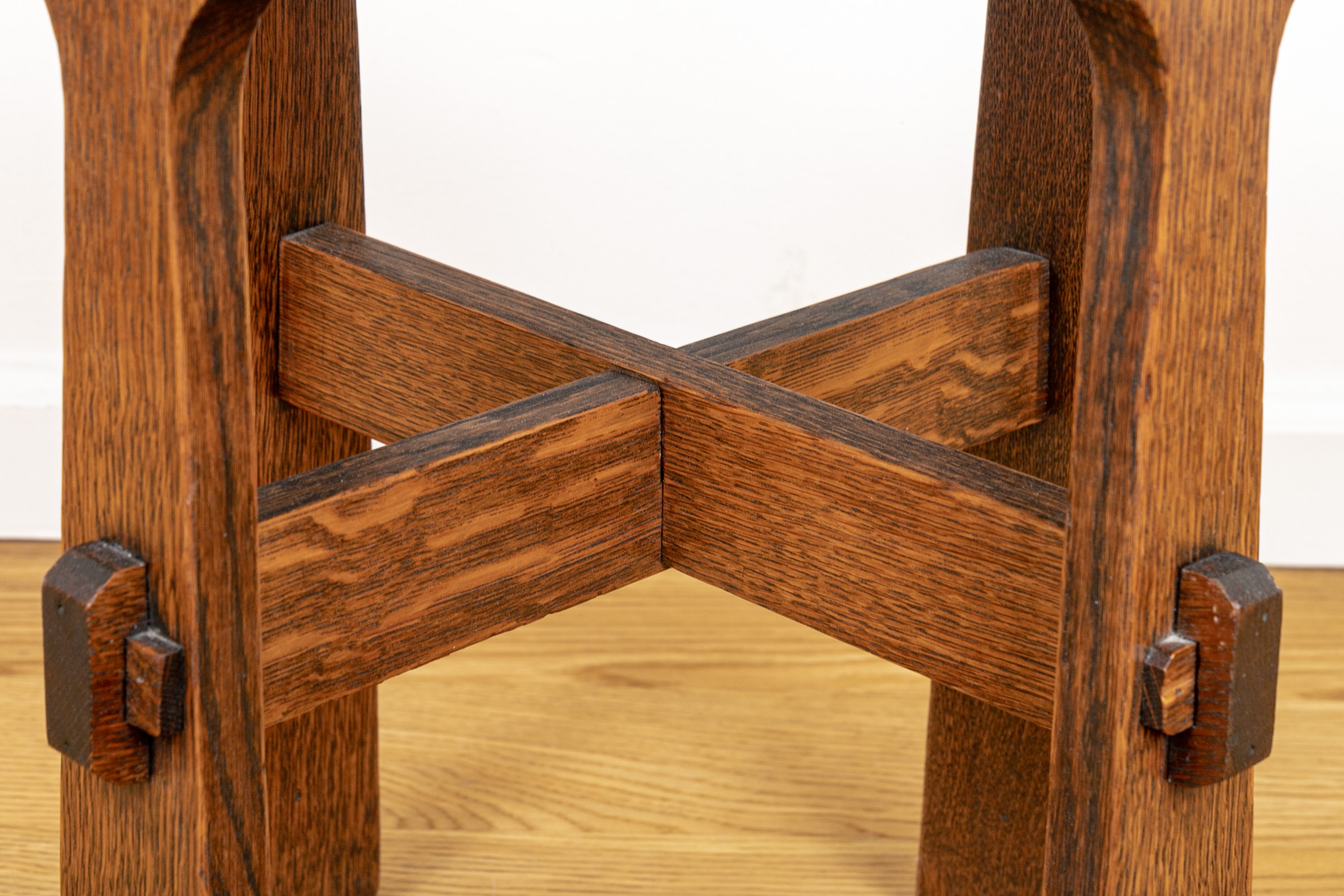 Originally purchased at Liberty, London. Arts and Crafts oak round accent table with X-form stretcher and keyed mortise & tenon joinery, resting on straight legs.