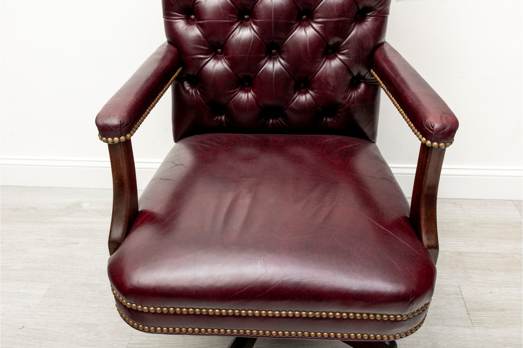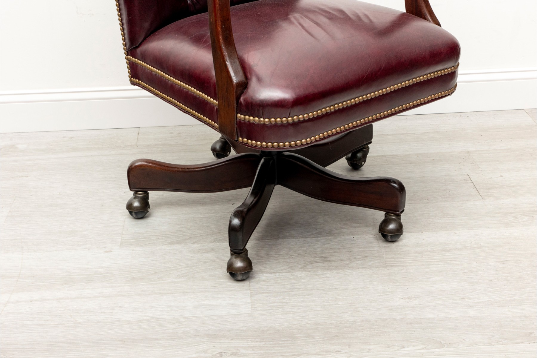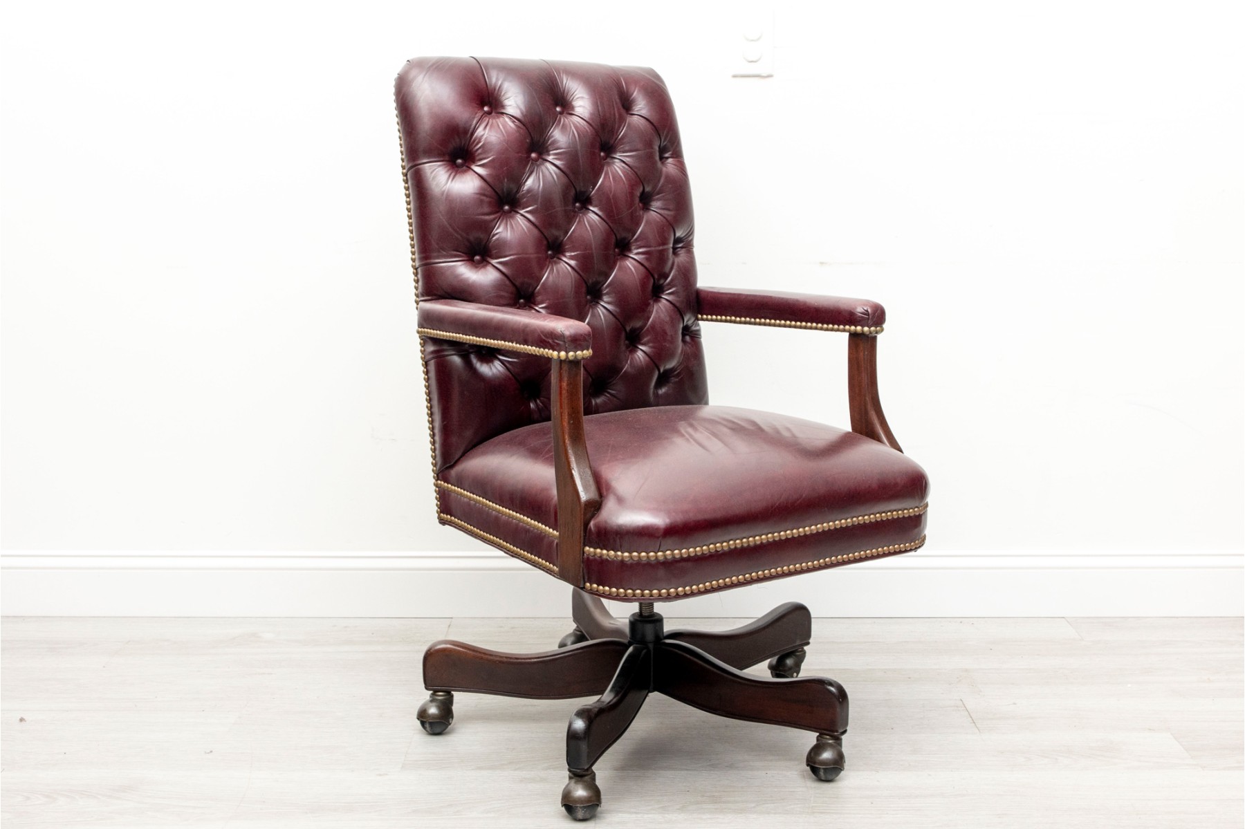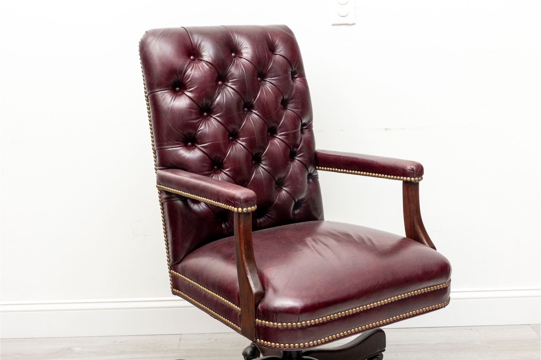 Cabot Wrenn executive swivel desk chair in gorgeous burgundy leather, displaying a button-tufted back and upholstered arms with nail head trims.