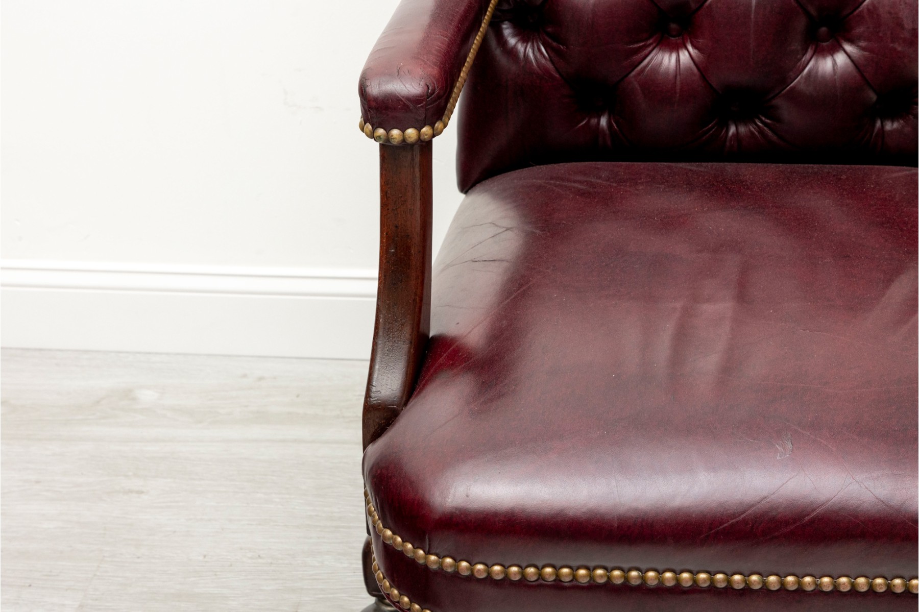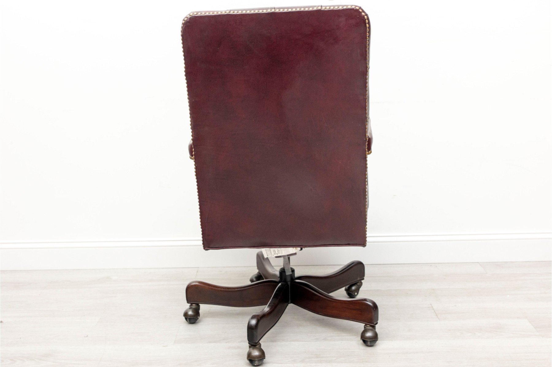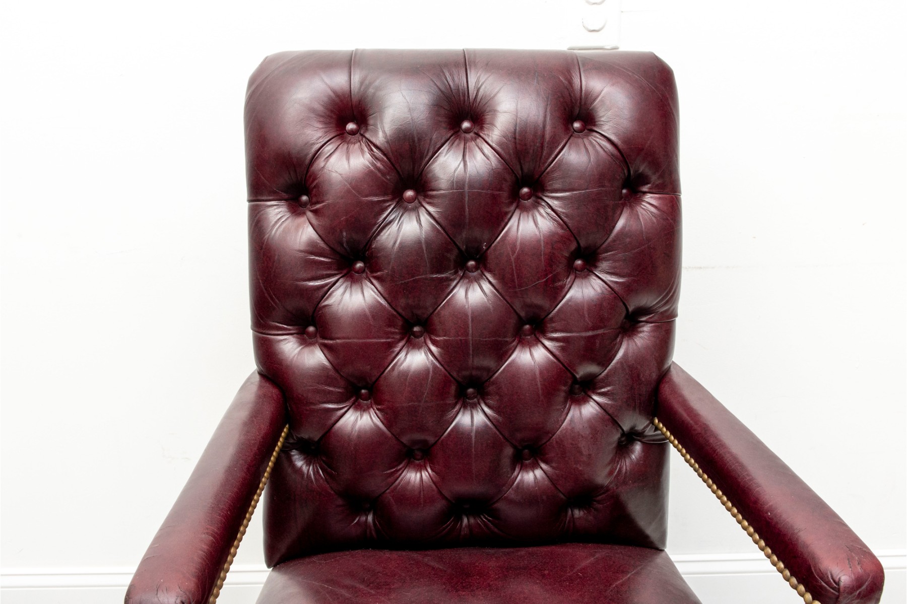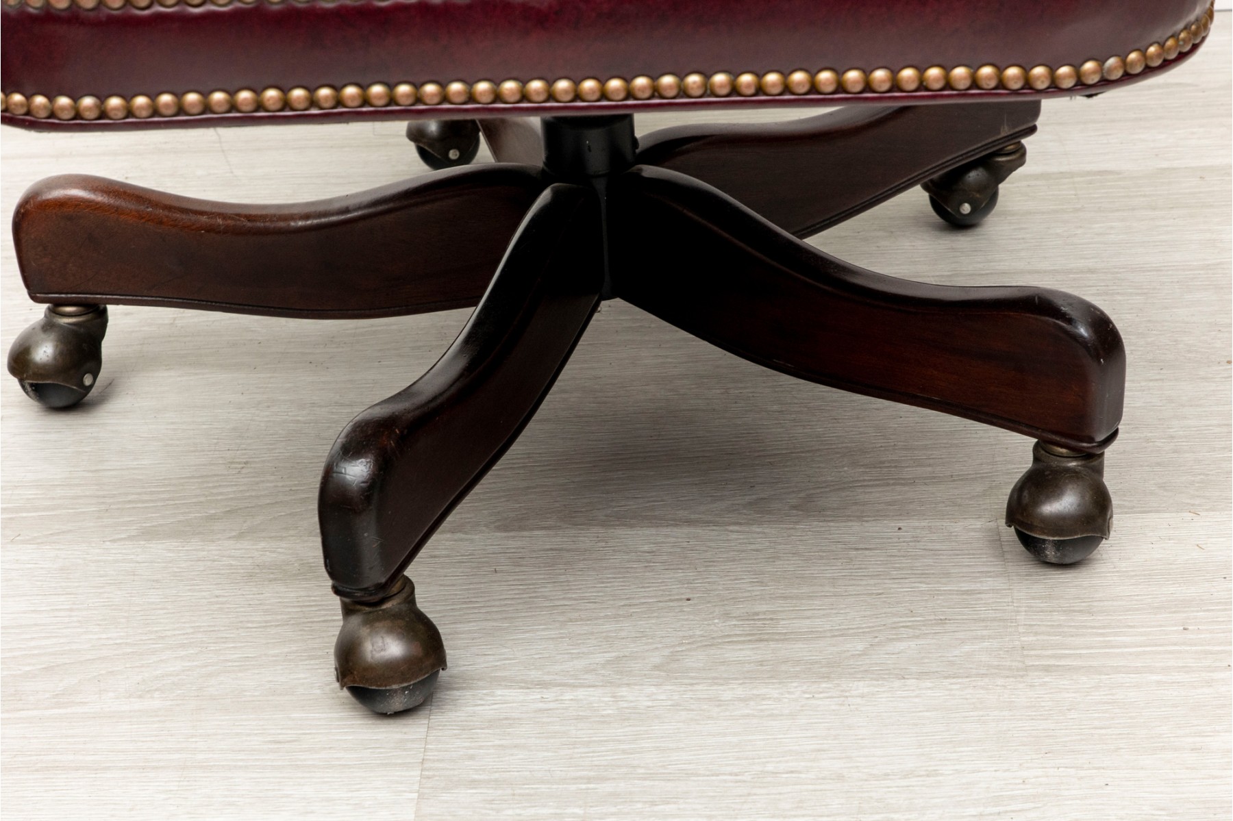 Cabot Wrenn executive swivel desk chair in gorgeous burgundy leather, displaying a button-tufted back and upholstered arms with nail head trims.