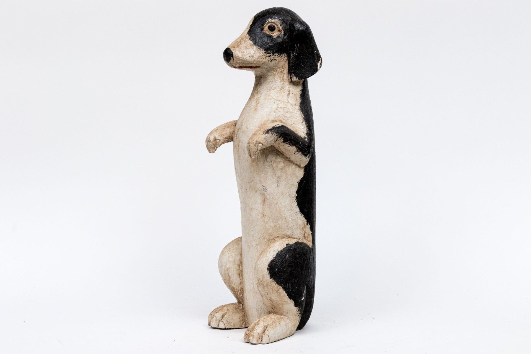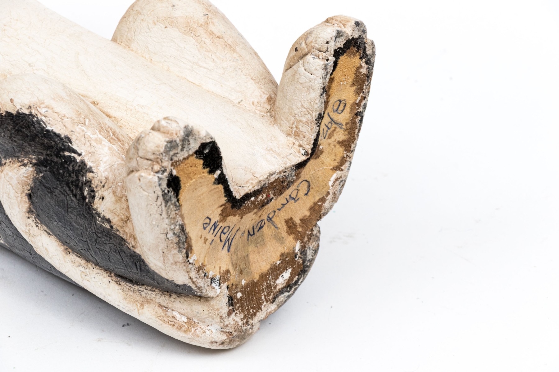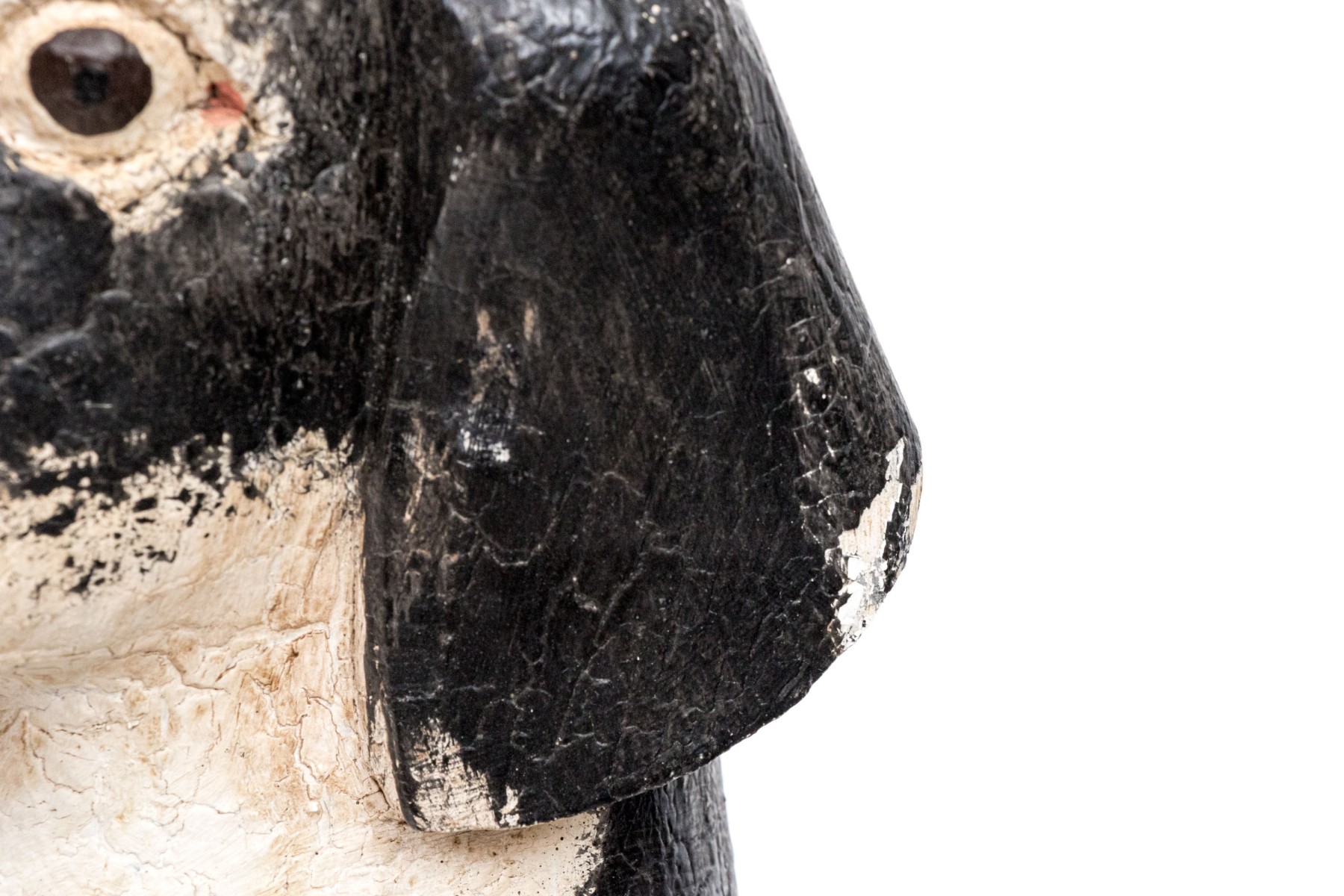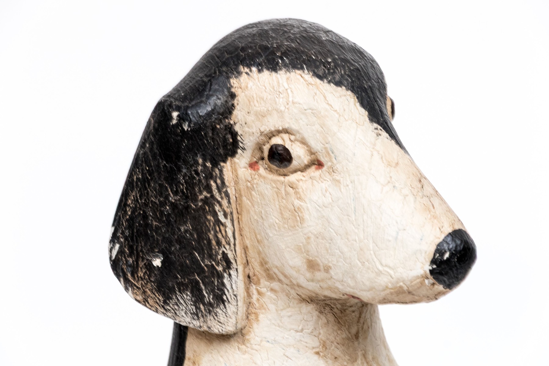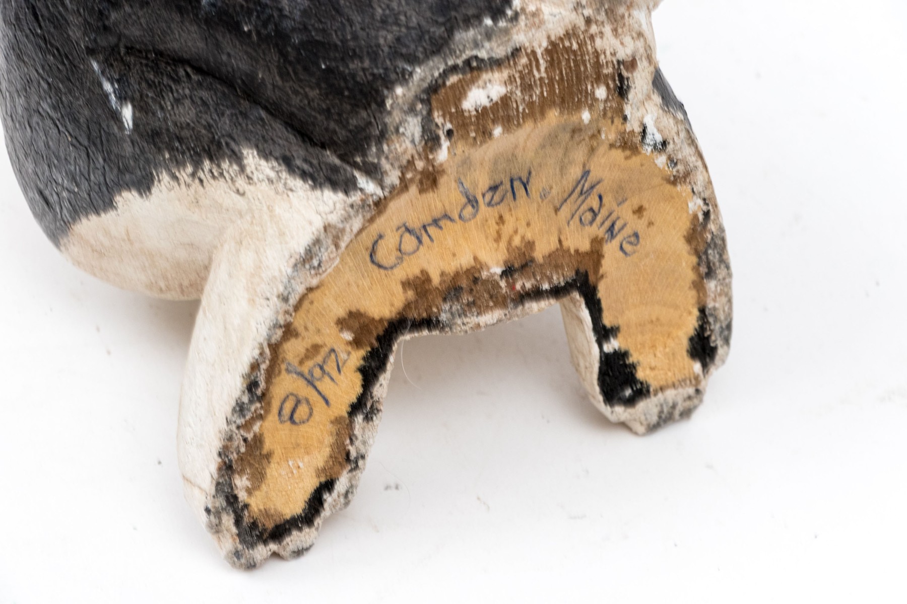 A delightful vintage Camden Maine carved and painted wood sculpture of a dog posed sitting on its hind legs with front paws as though begging. The dog is beautifully detailed and painted in black and white. Marked and dated 8/92 underfoot.