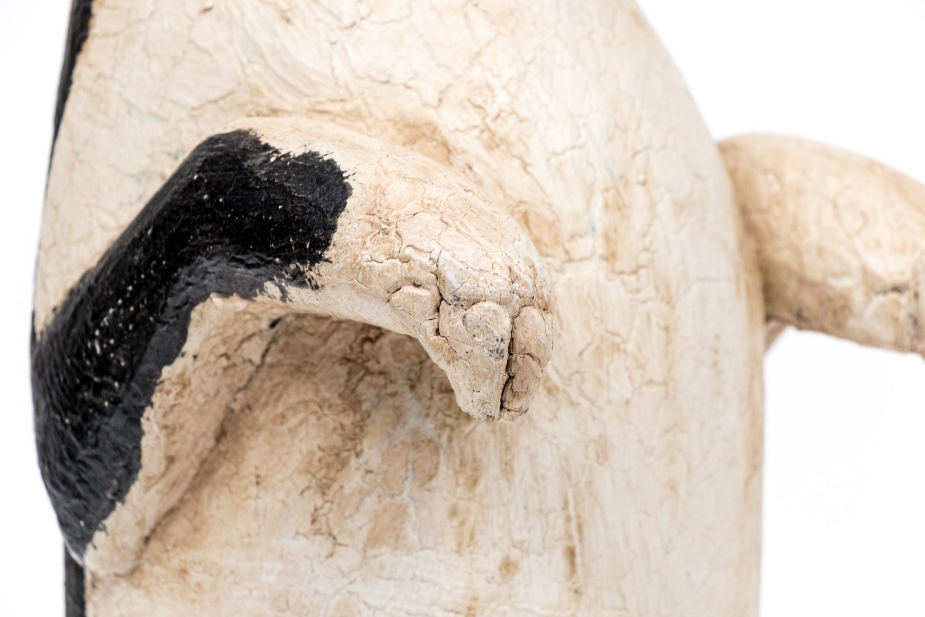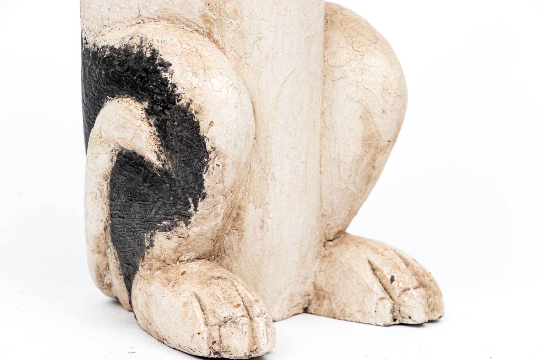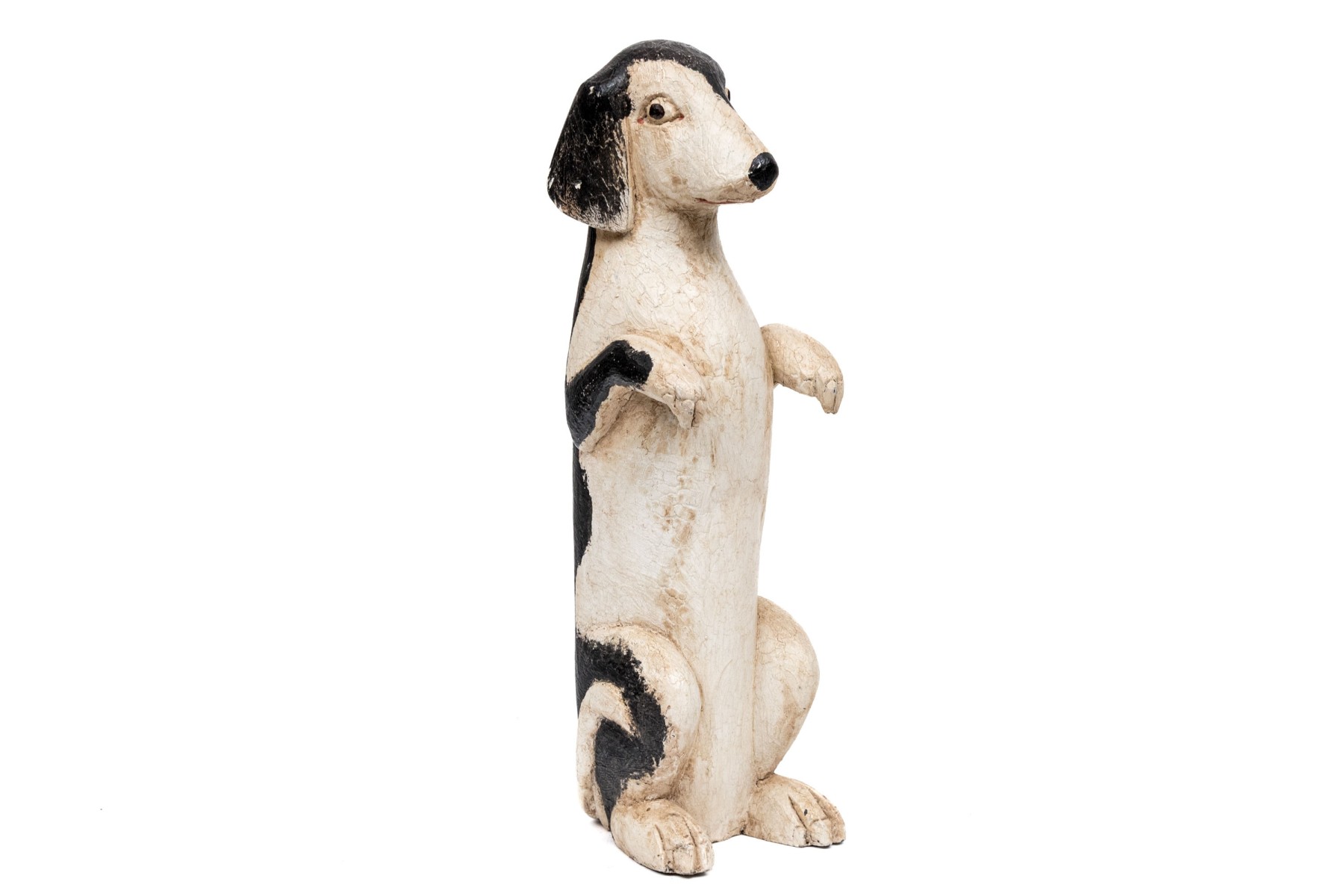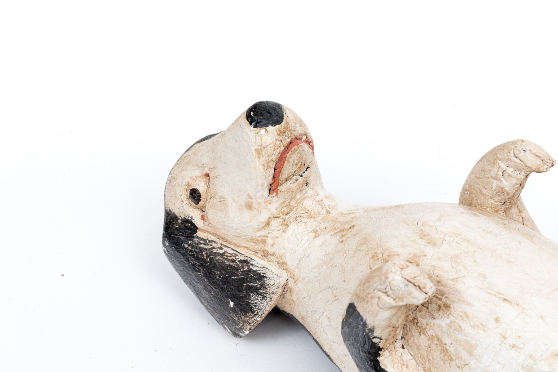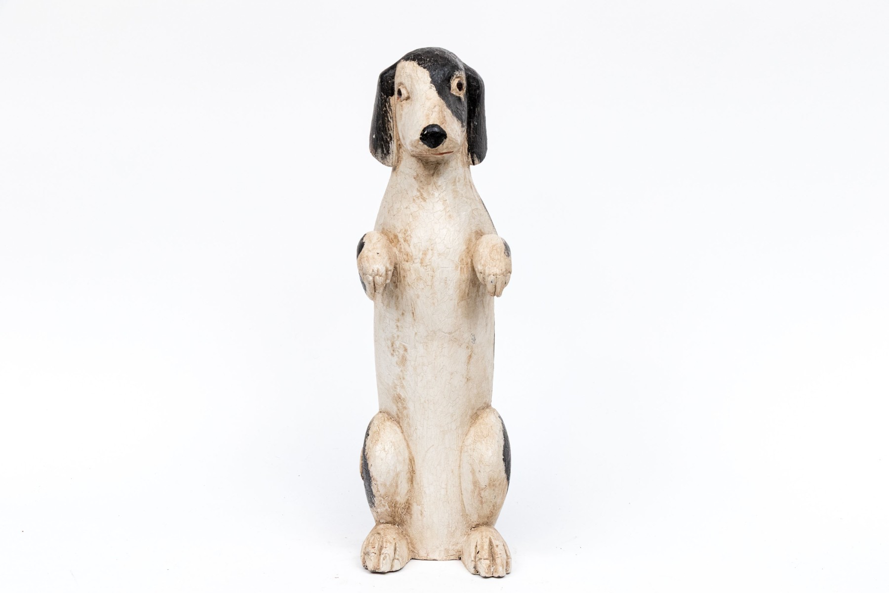 A delightful vintage Camden Maine carved and painted wood sculpture of a dog posed sitting on its hind legs with front paws as though begging. The dog is beautifully detailed and painted in black and white. Marked and dated 8/92 underfoot.