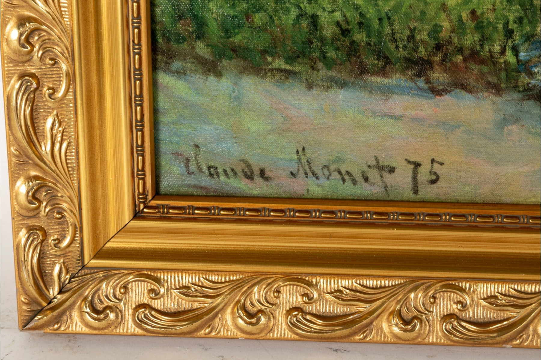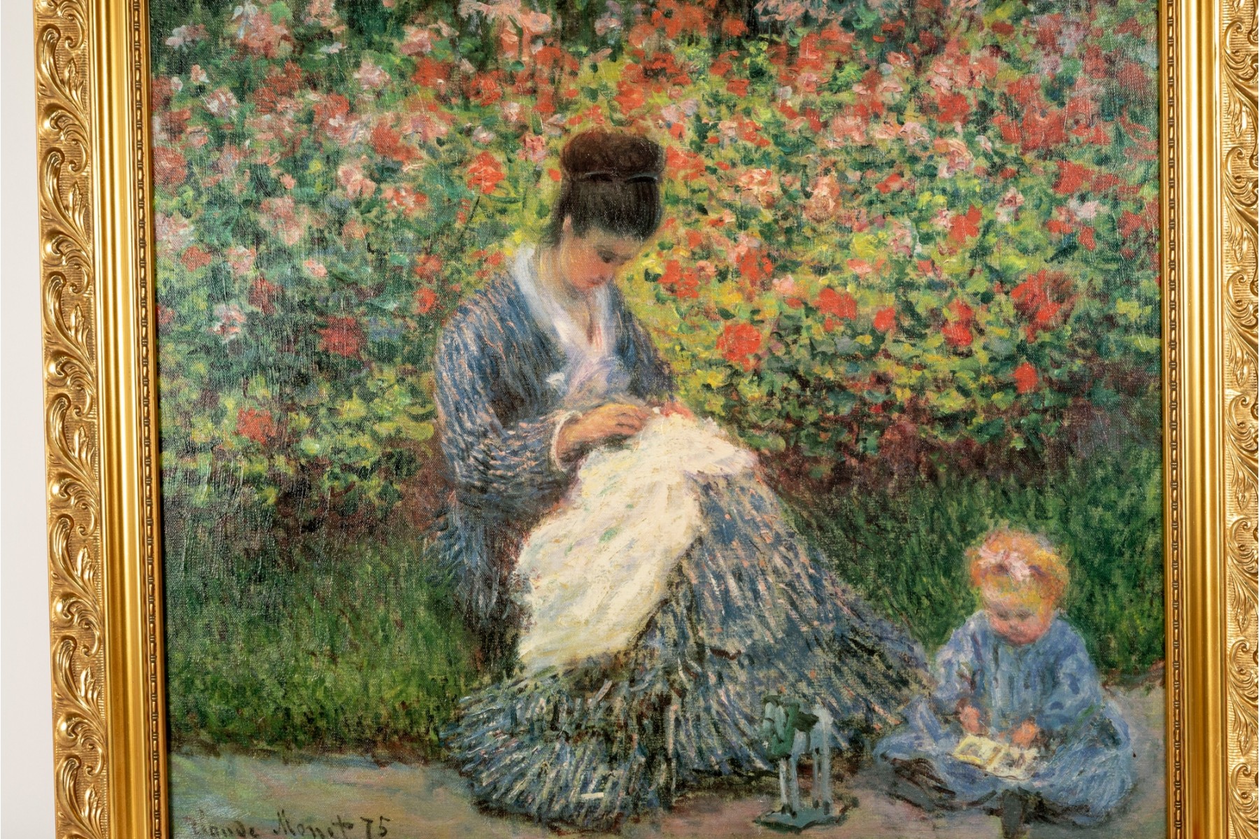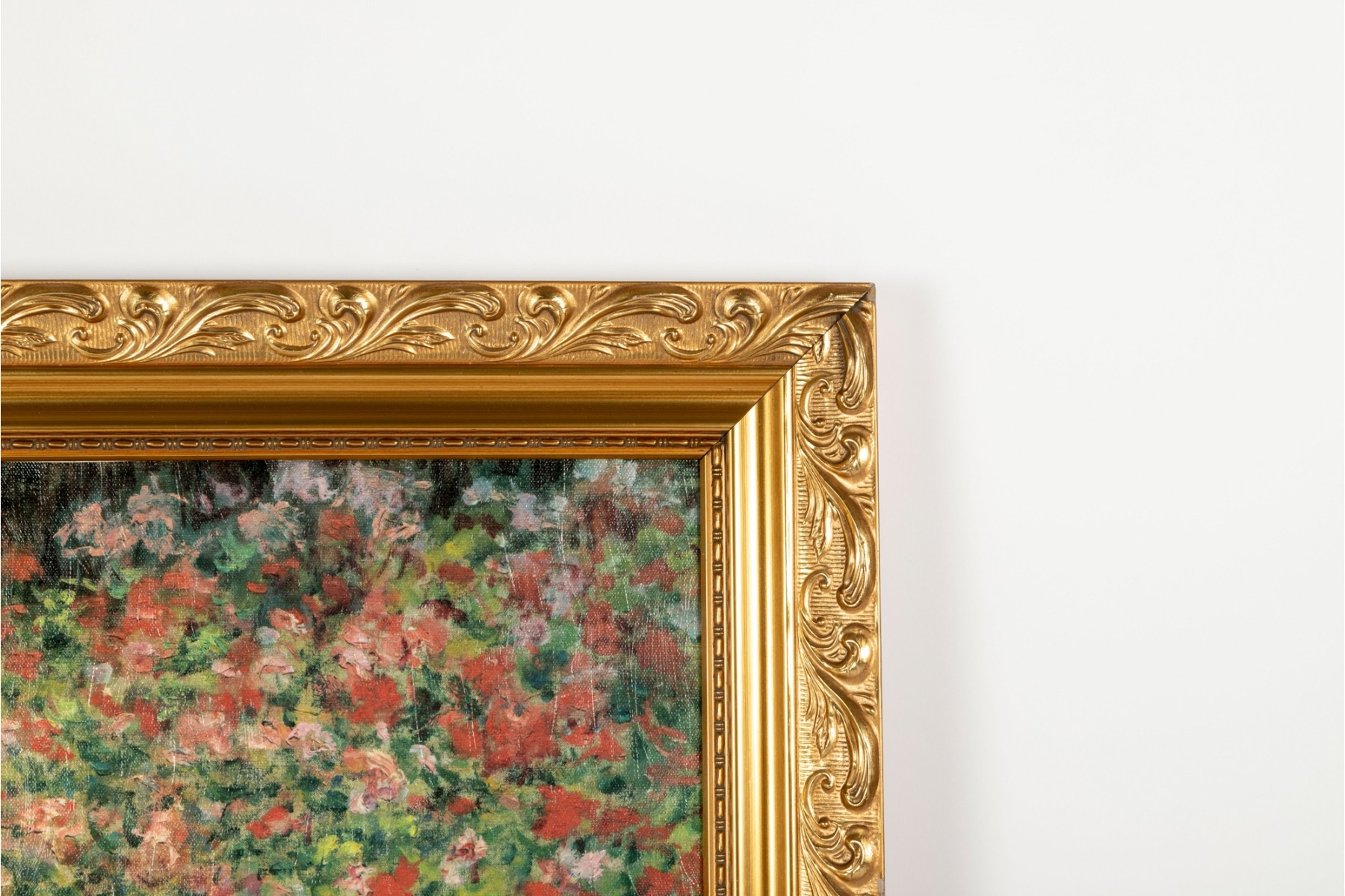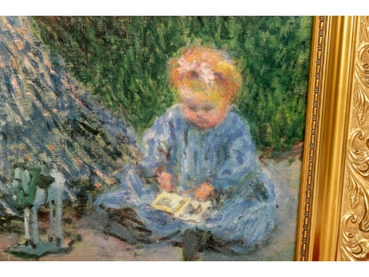 This "Camille Monet and a Child in the Garden at Argenteuil" by Claude Monet is a reproduction print of the iconic Impressionist painting. The artwork captures a peaceful moment in the garden of Monet’s home in Argenteuil, where his wife Camille and their son Jean are immersed in the lush, vibrant landscape. The artwork is presented in a gold-tone frame, carved with vintage-like allure.