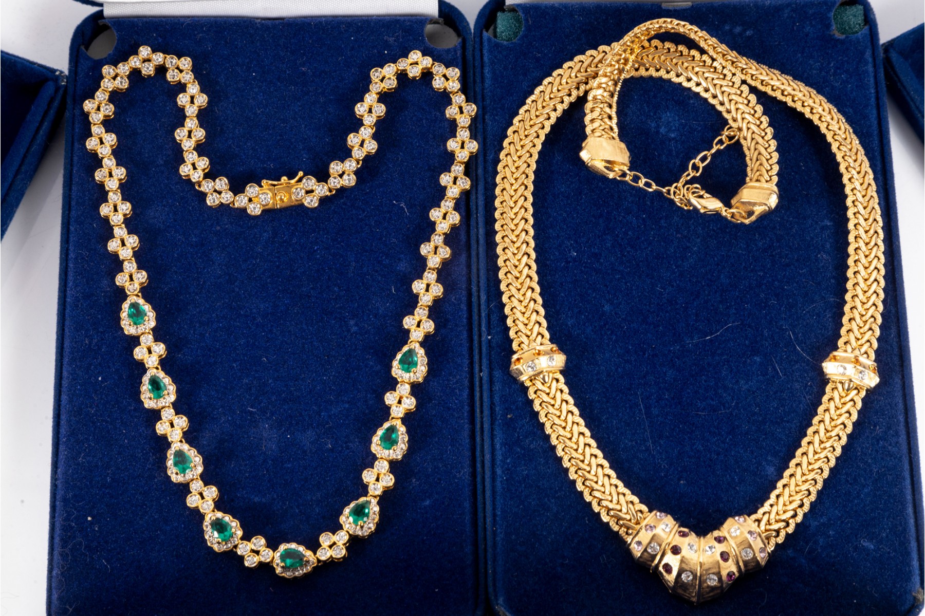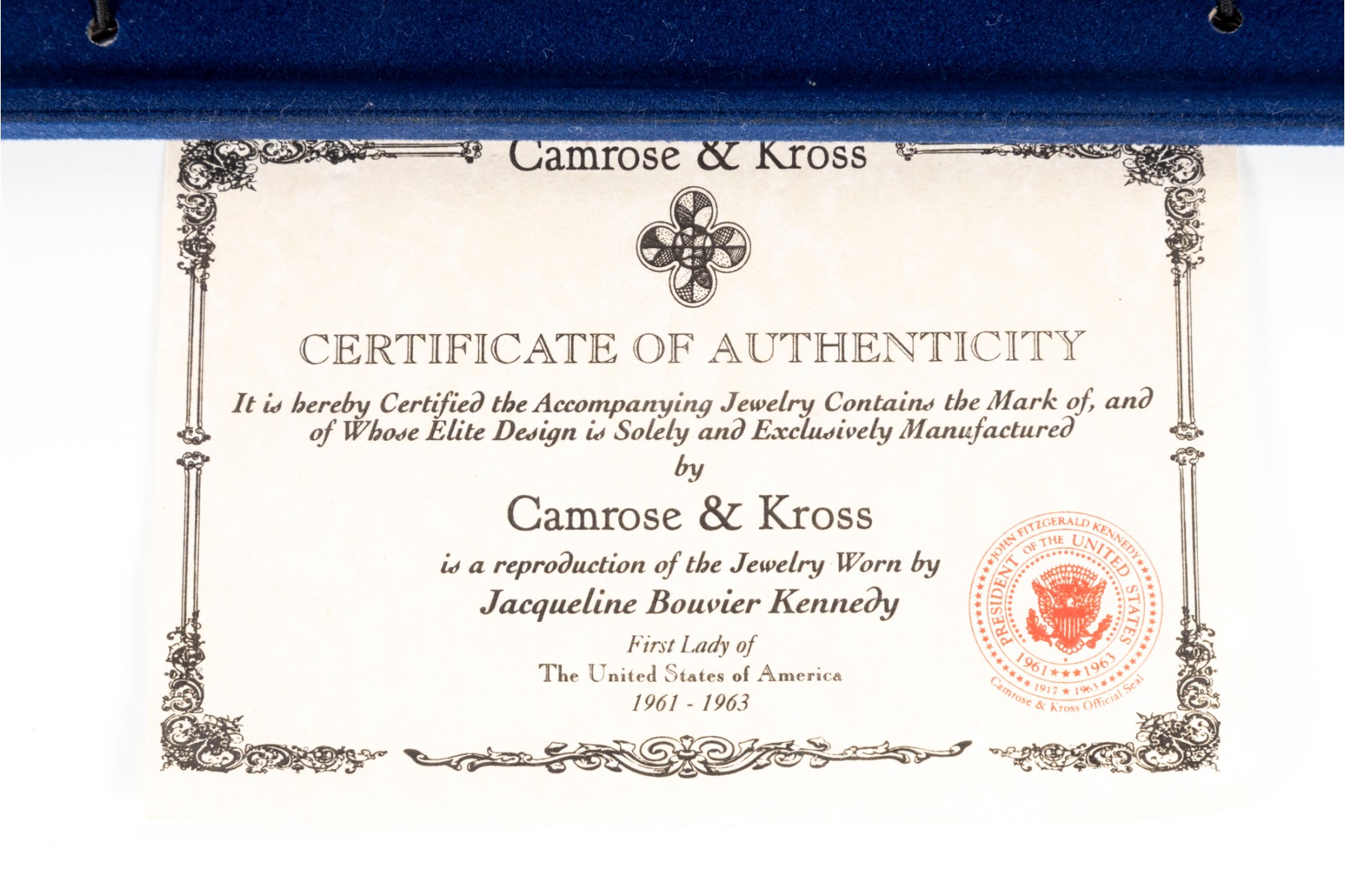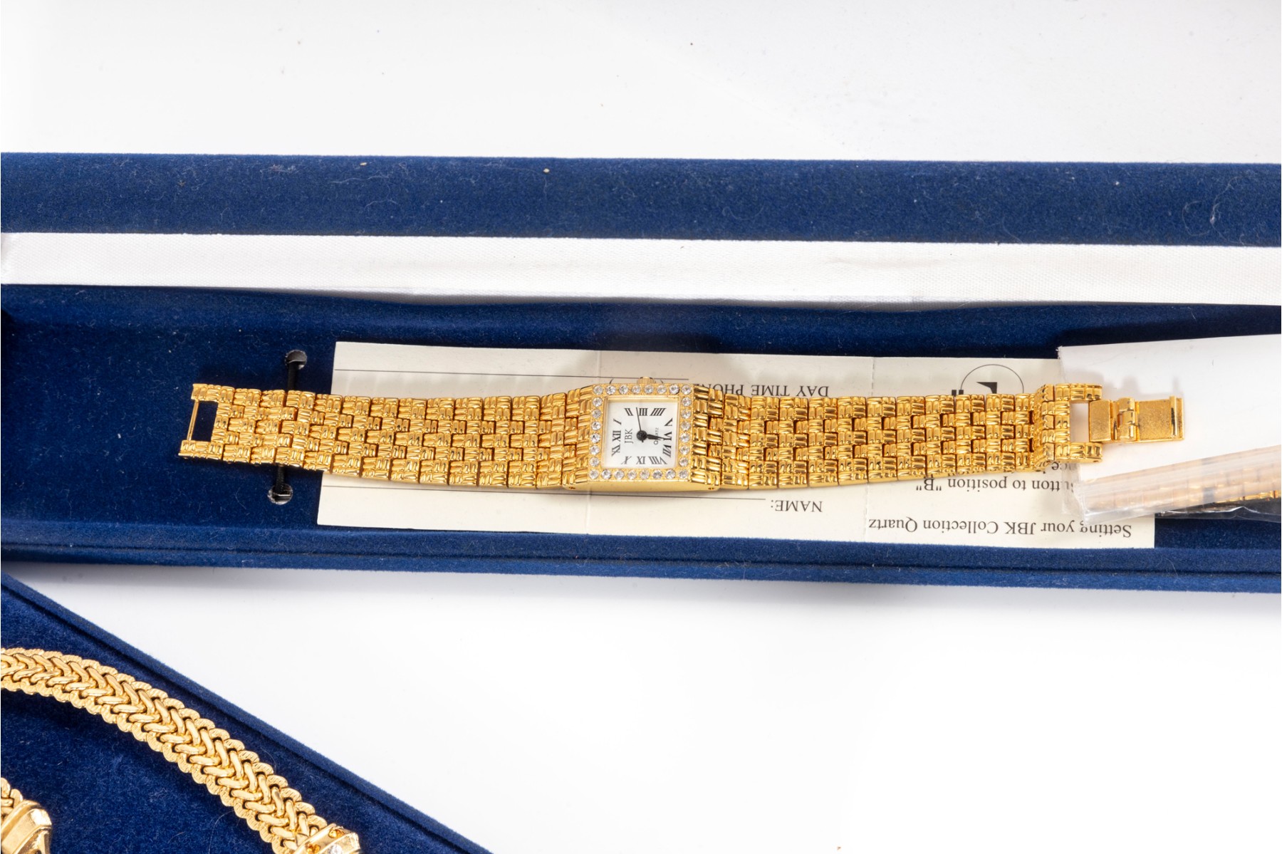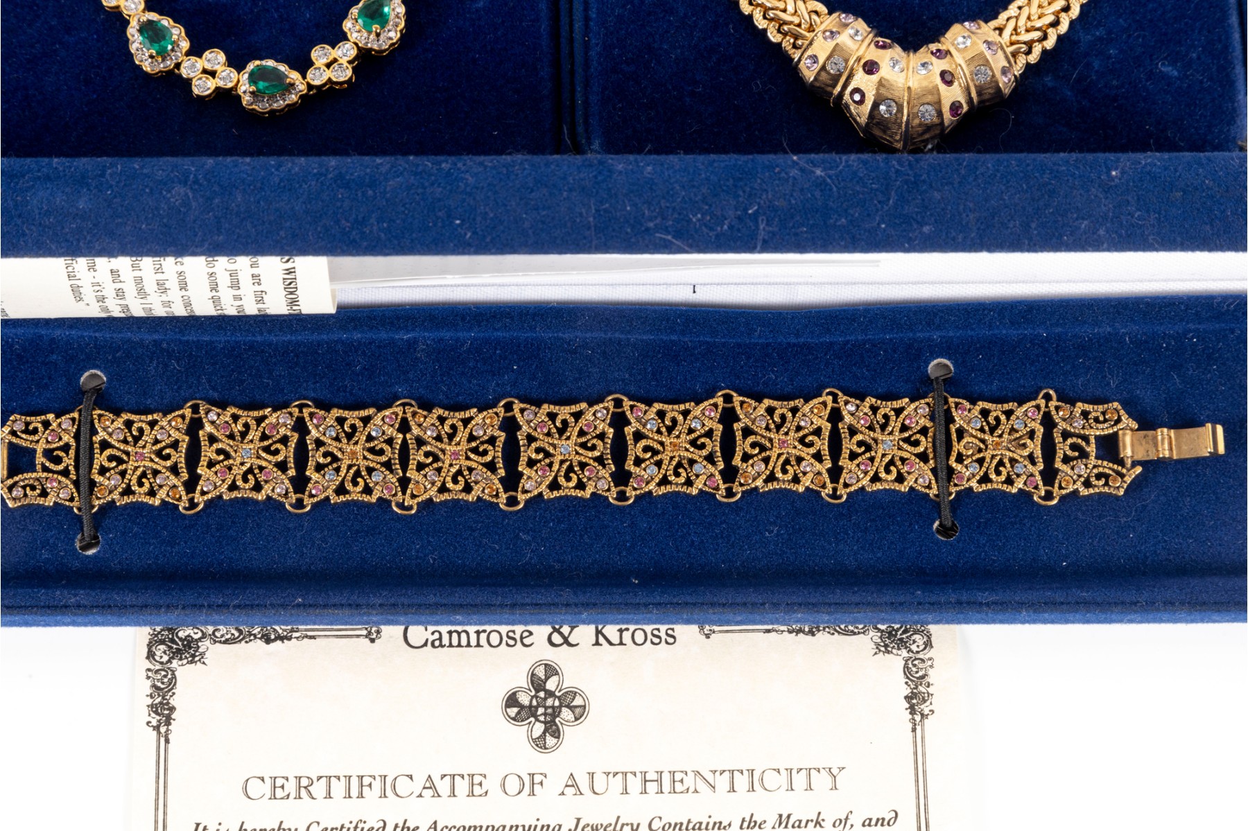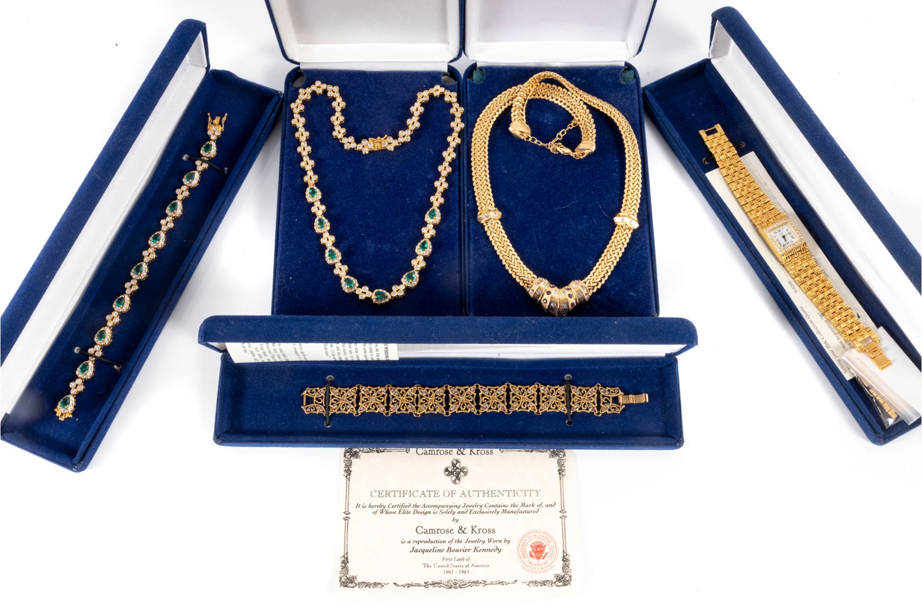 A collection of Camrose & Kross JBK fashion jewelry based off of Jacqueline Kennedy pieces, featuring dazzling goldtone pieces with rhinestone accents. Each piece is accompanied by a branded blue velveteen display box.