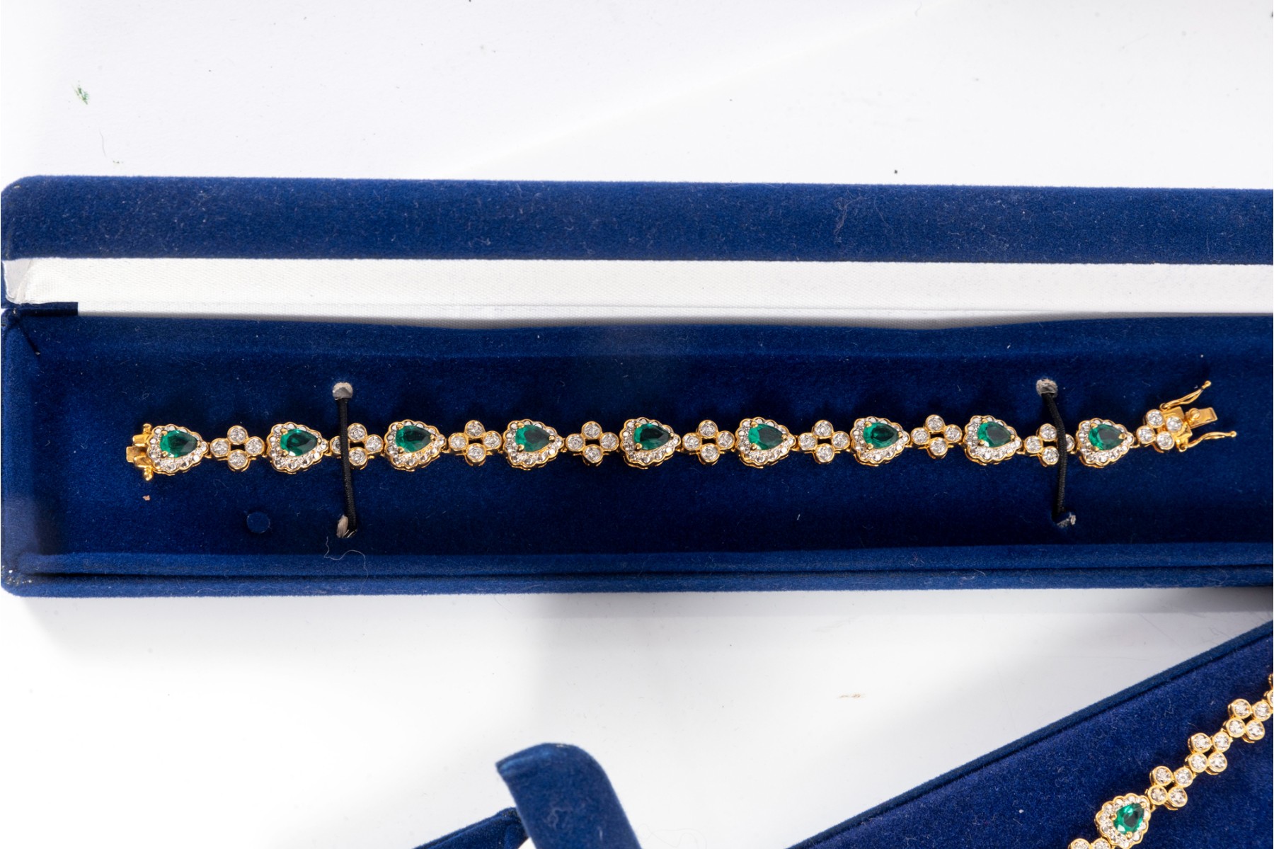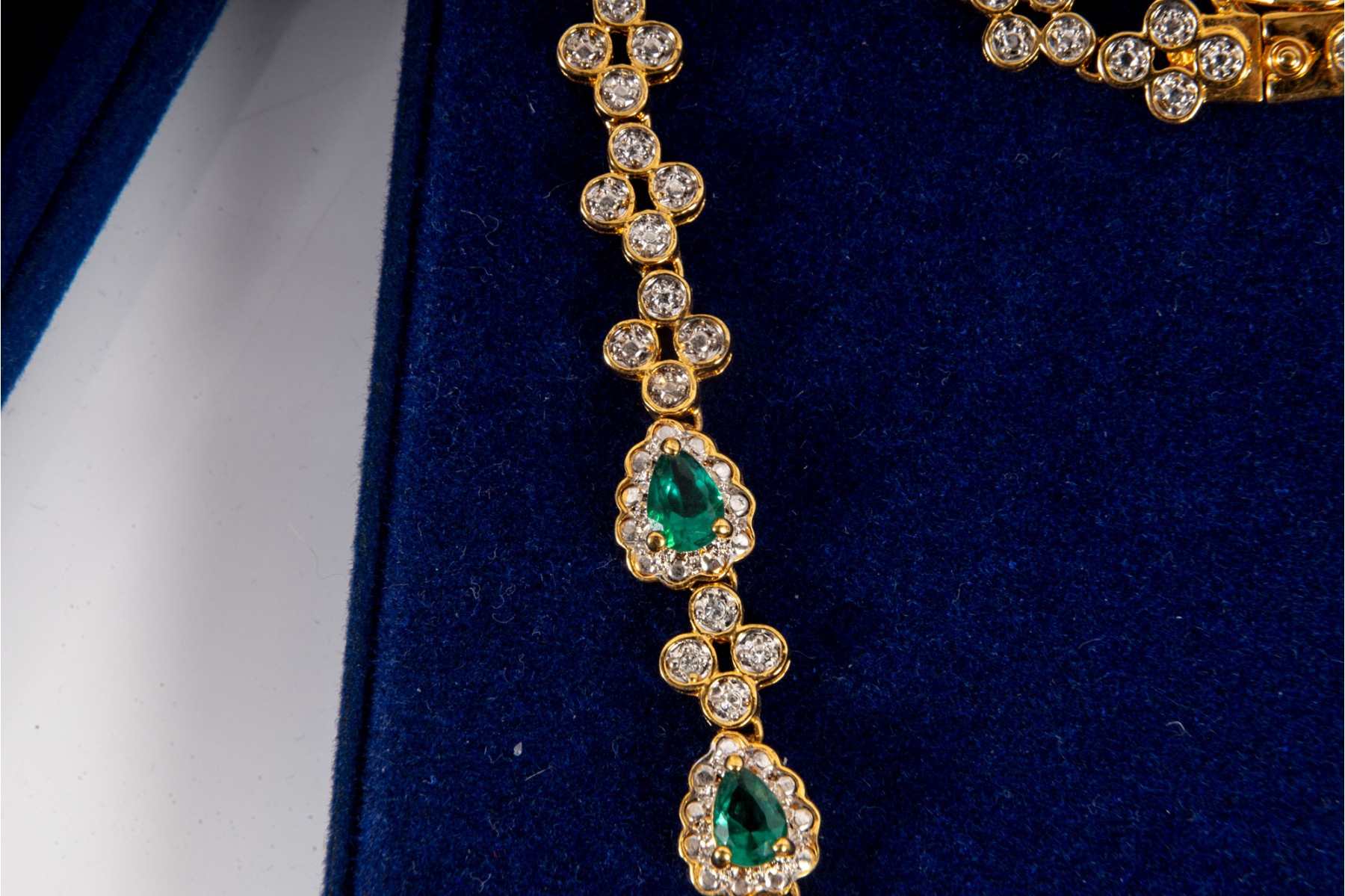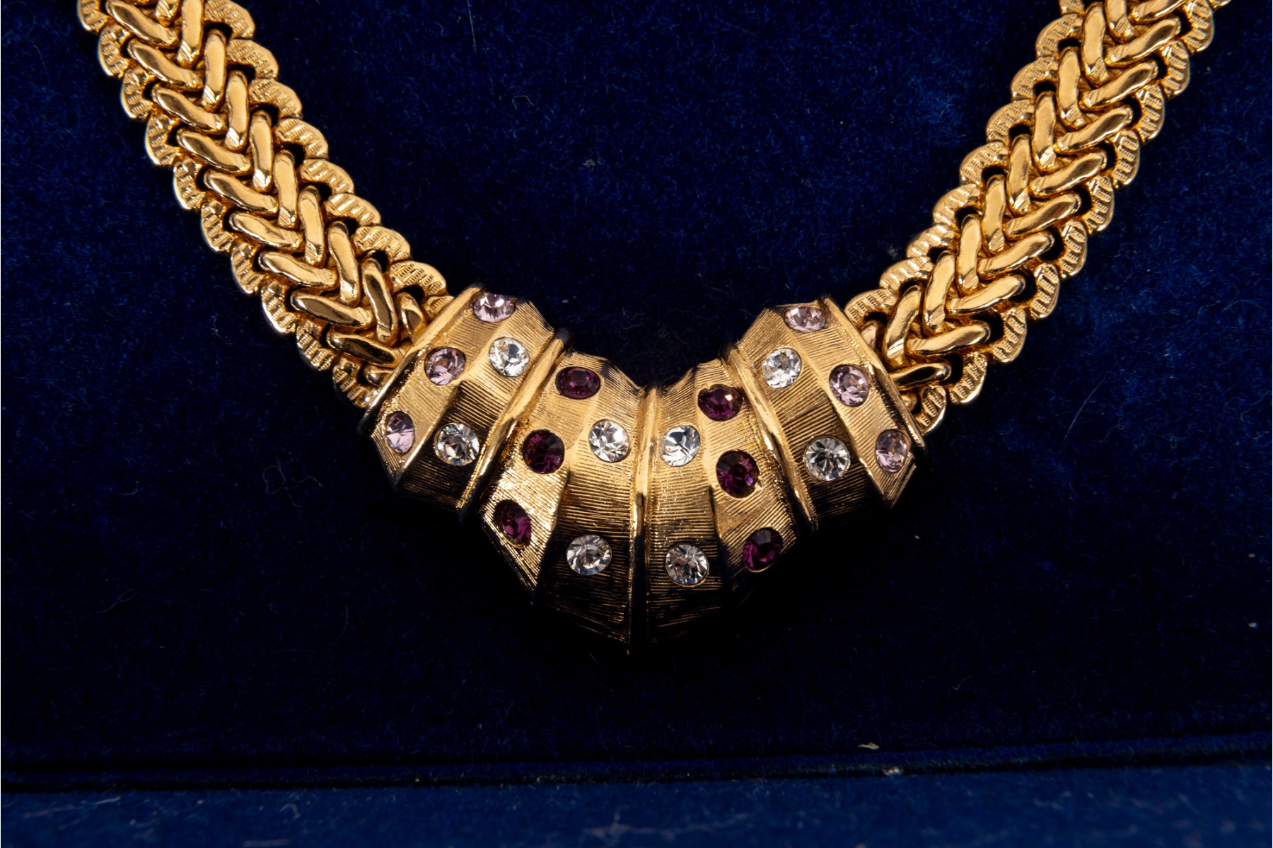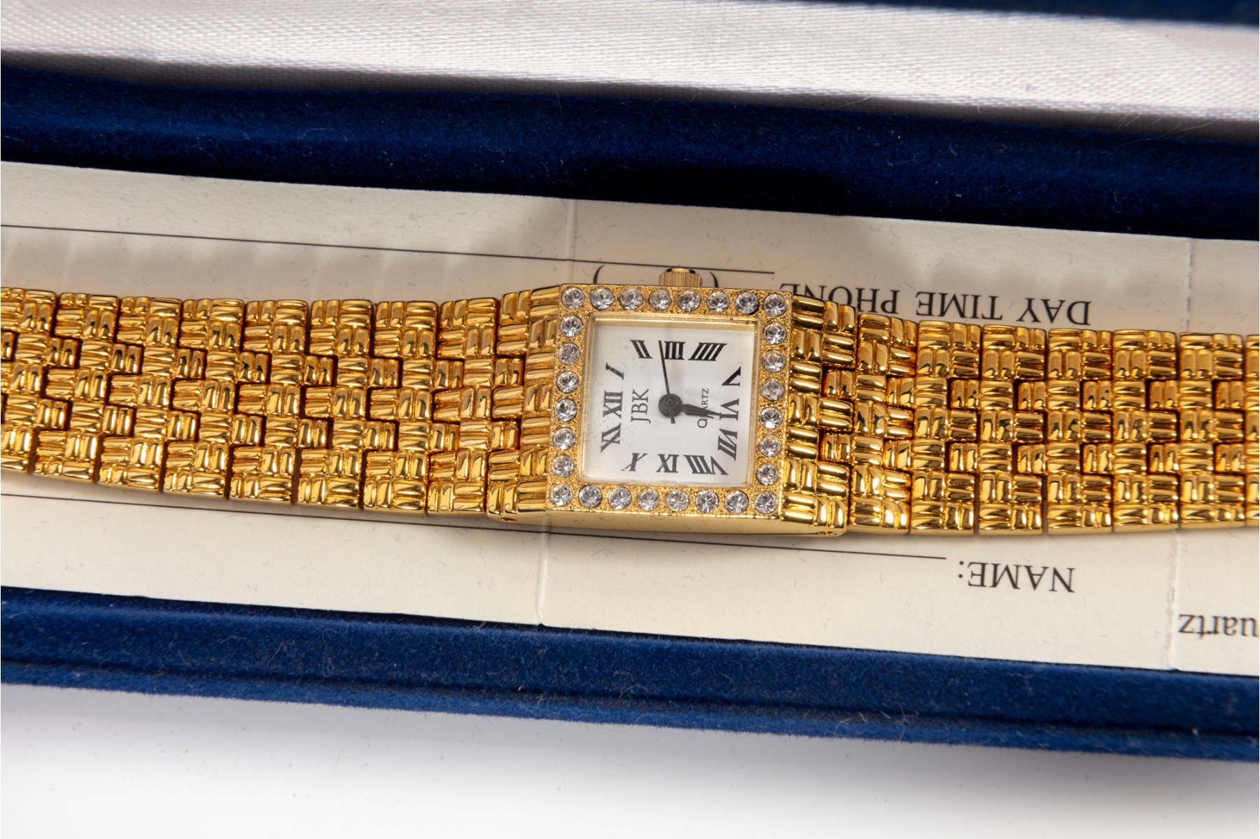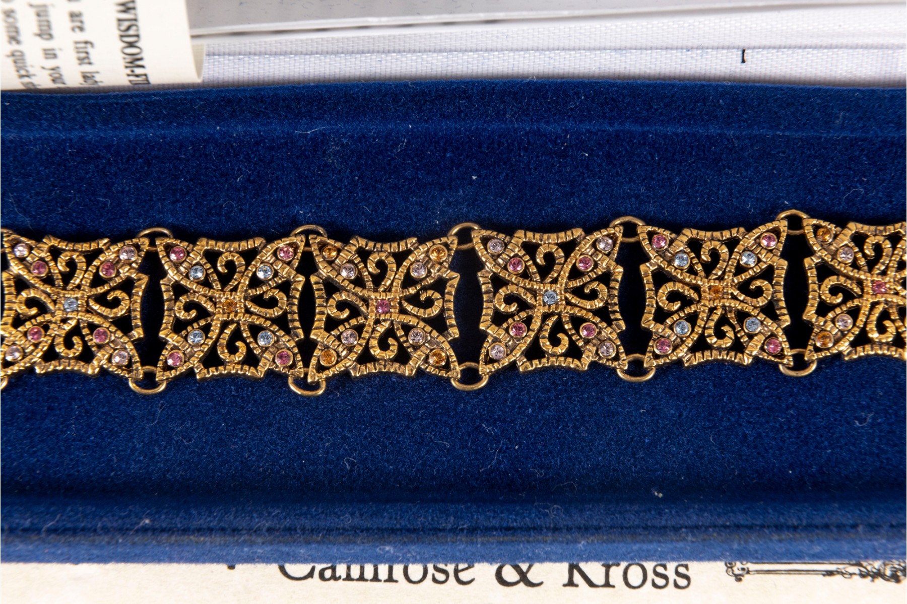 A collection of Camrose & Kross JBK fashion jewelry based off of Jacqueline Kennedy pieces, featuring dazzling goldtone pieces with rhinestone accents. Each piece is accompanied by a branded blue velveteen display box.