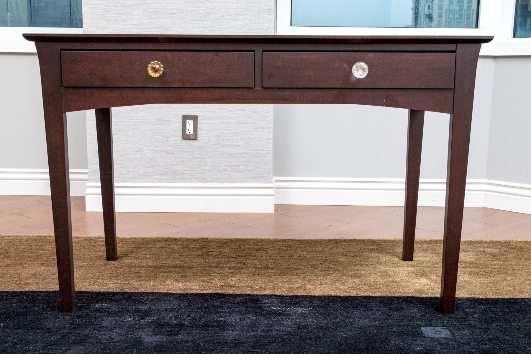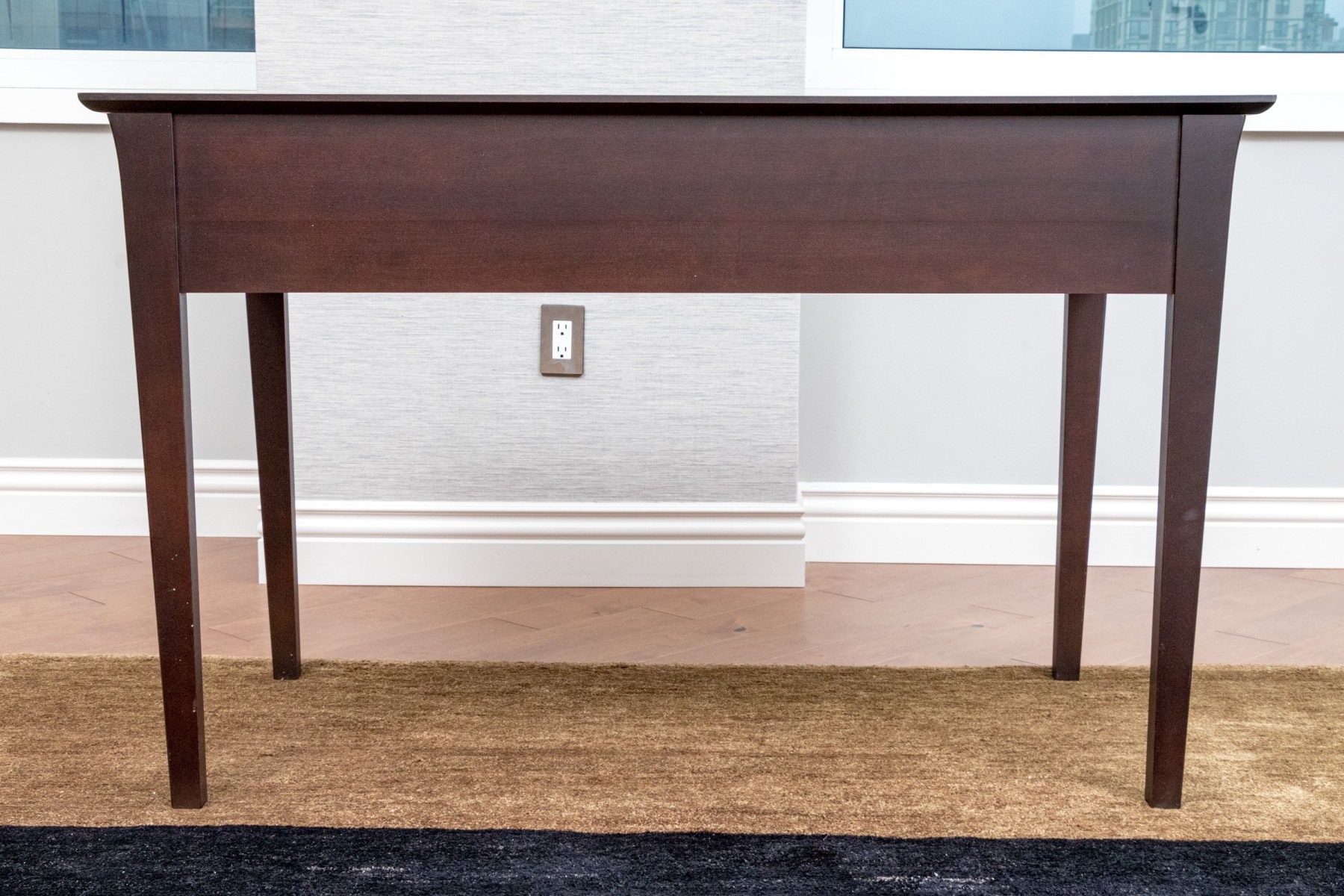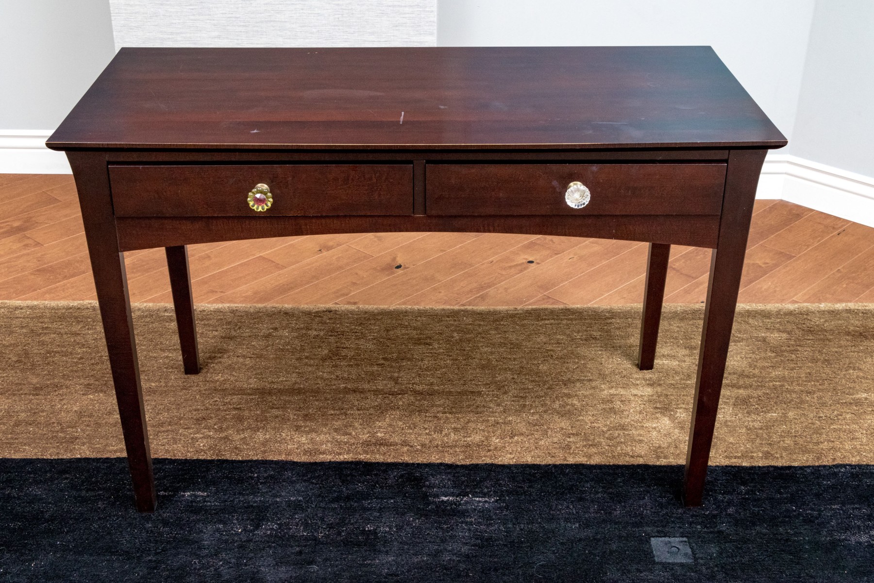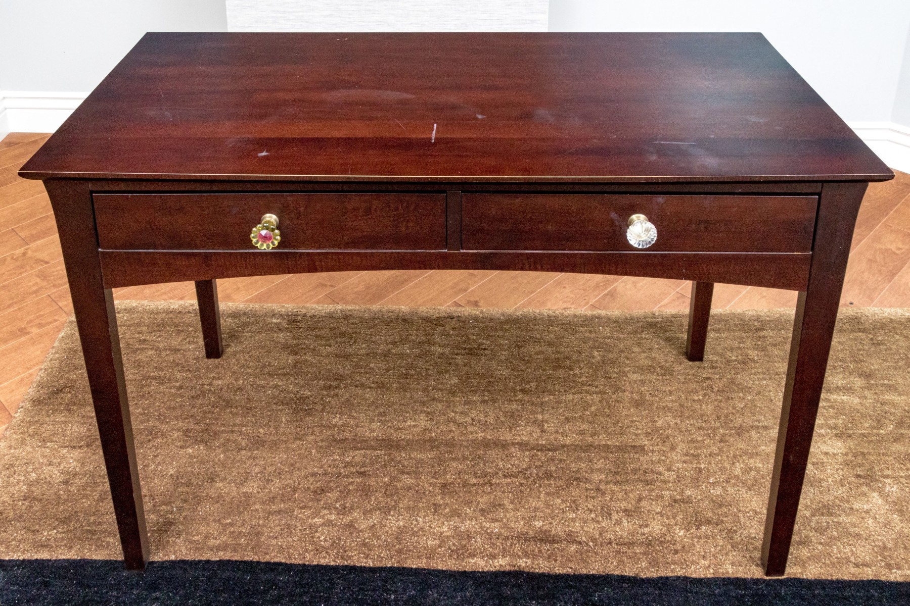 A wonderful Baronet A wonderful Baronet writing desk with a versatile blend of transitional style with a touch of stately Federal flare. The desk is beautifully crafted in rich red-brown wood, showcasing a spacious rectangular top over two drawers. Finished with a gently arched apron and straight legs.