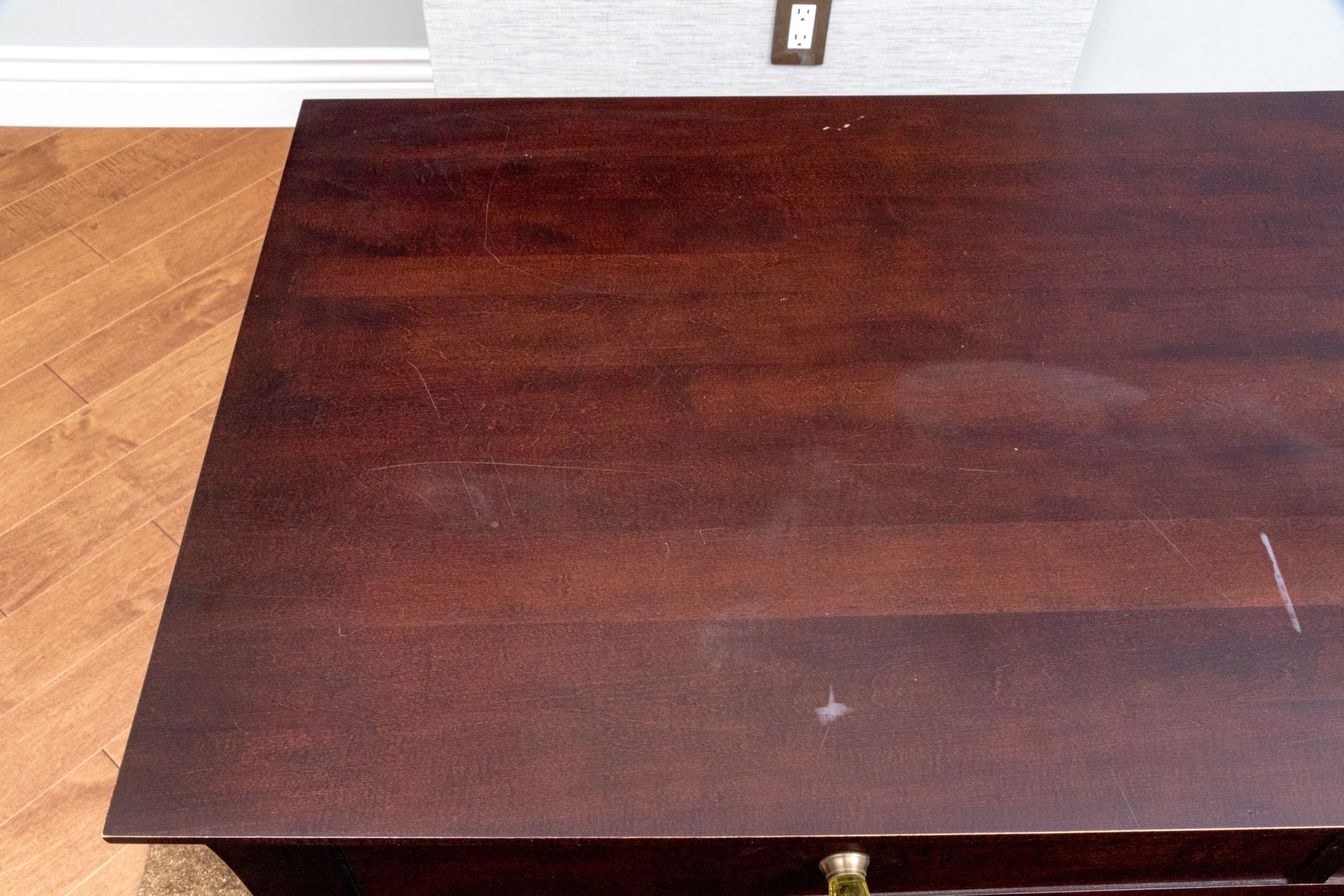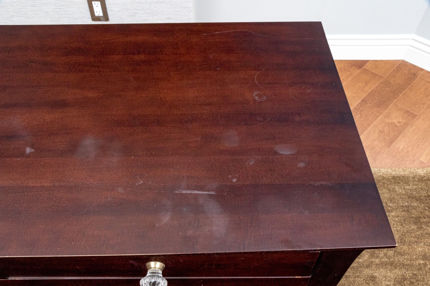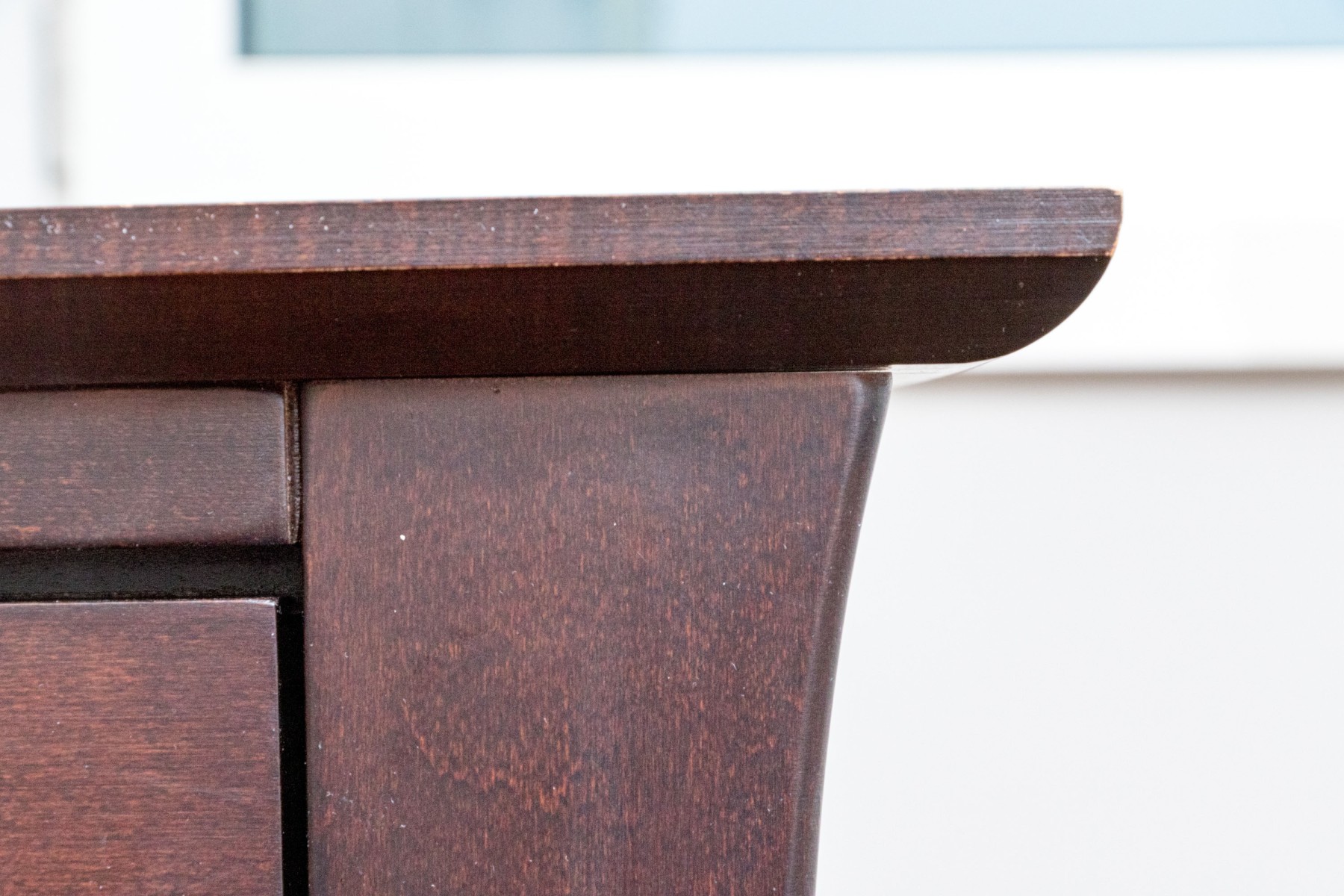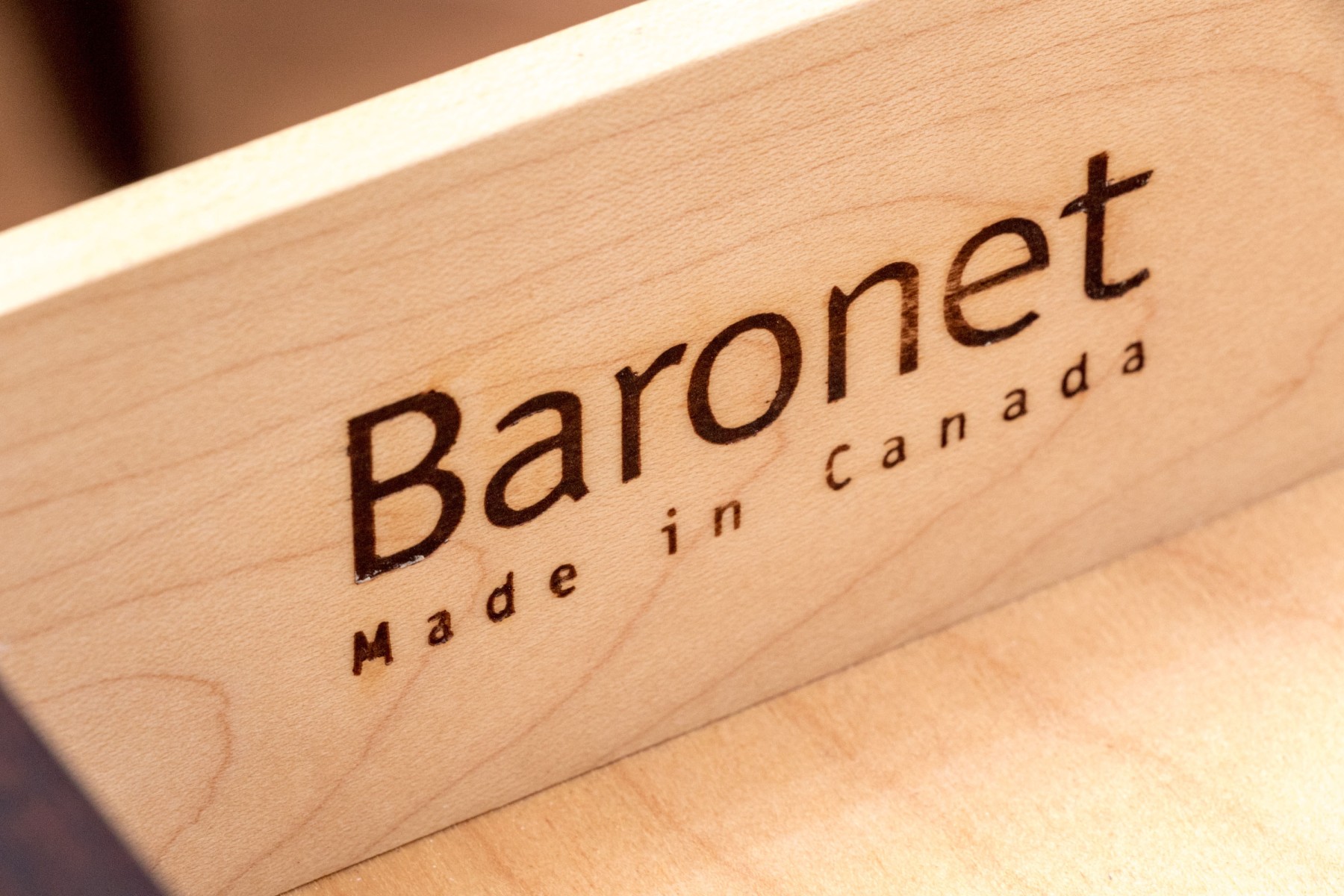 A wonderful Baronet A wonderful Baronet writing desk with a versatile blend of transitional style with a touch of stately Federal flare. The desk is beautifully crafted in rich red-brown wood, showcasing a spacious rectangular top over two drawers. Finished with a gently arched apron and straight legs.
