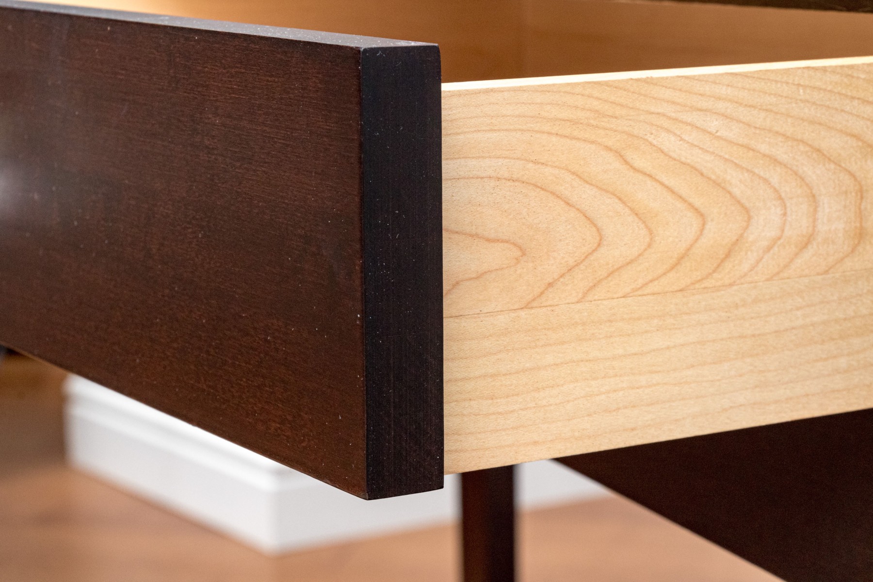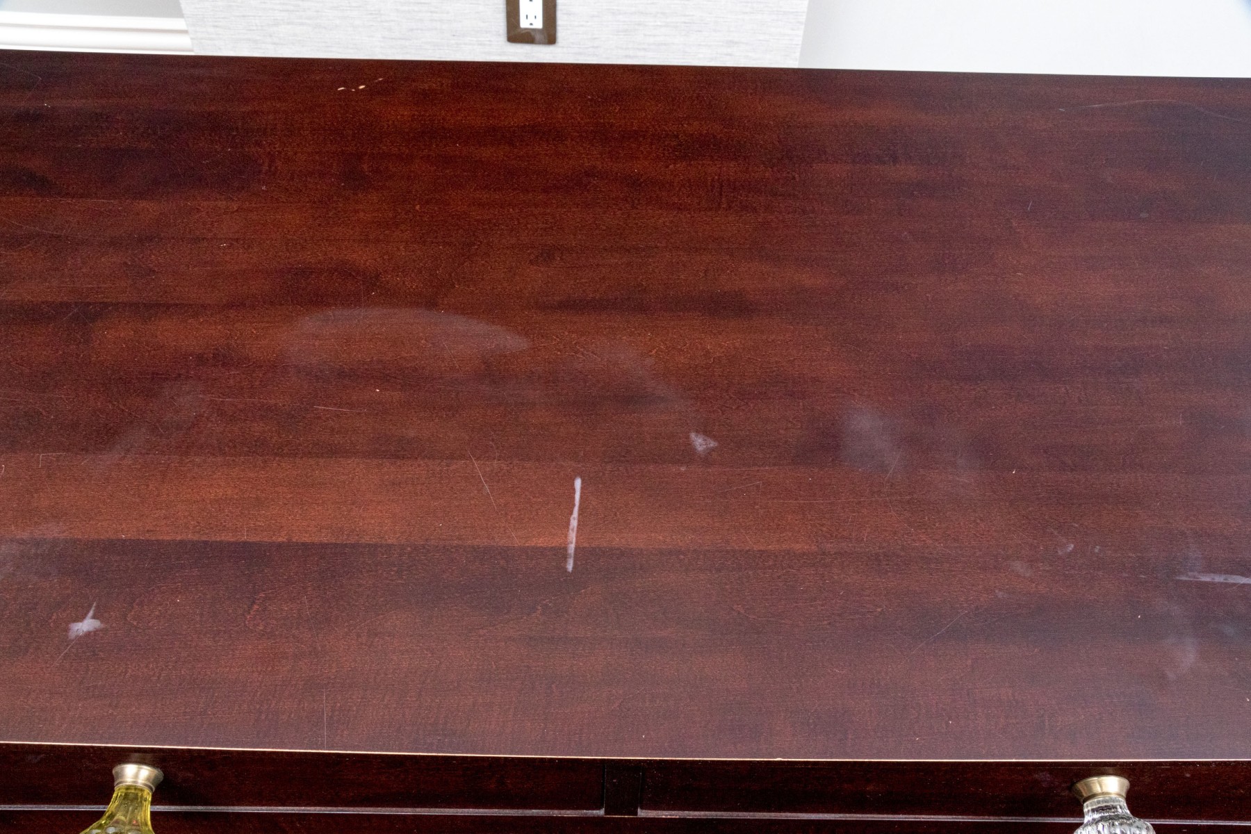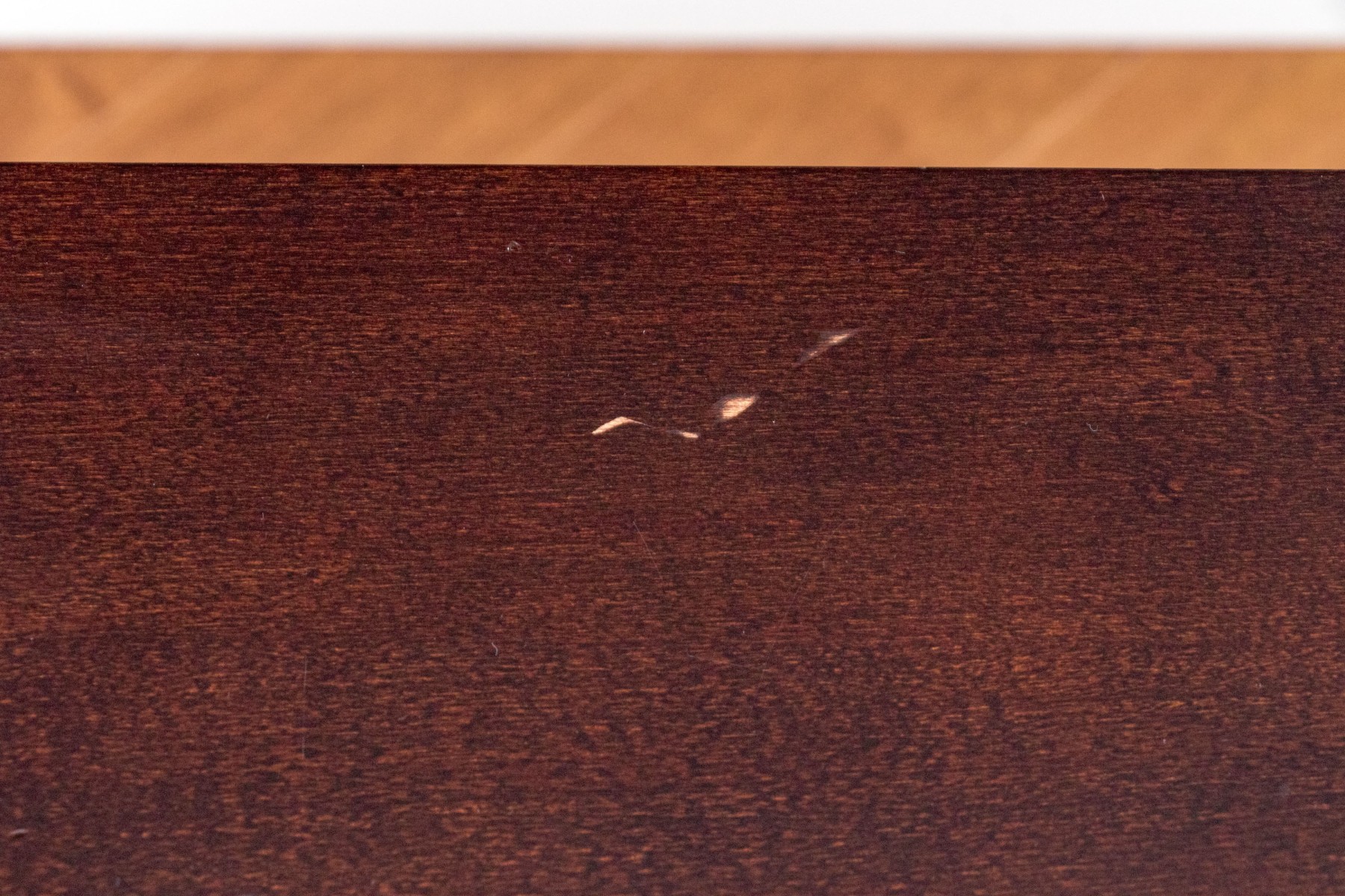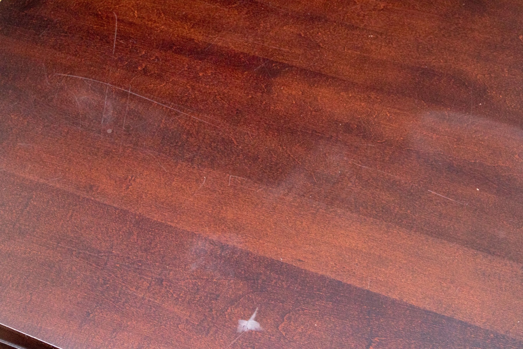 A wonderful Baronet A wonderful Baronet writing desk with a versatile blend of transitional style with a touch of stately Federal flare. The desk is beautifully crafted in rich red-brown wood, showcasing a spacious rectangular top over two drawers. Finished with a gently arched apron and straight legs.