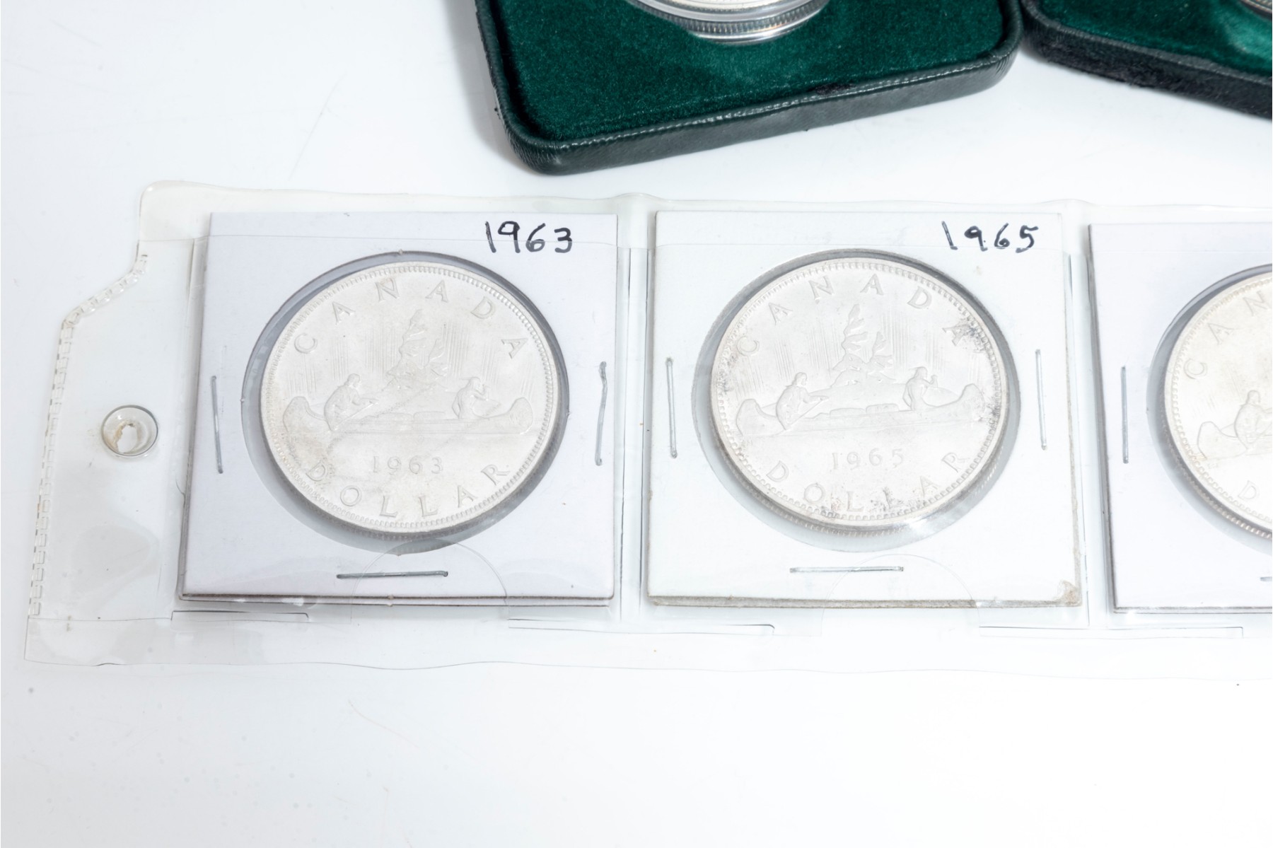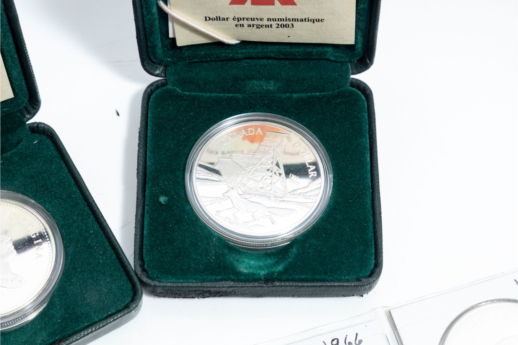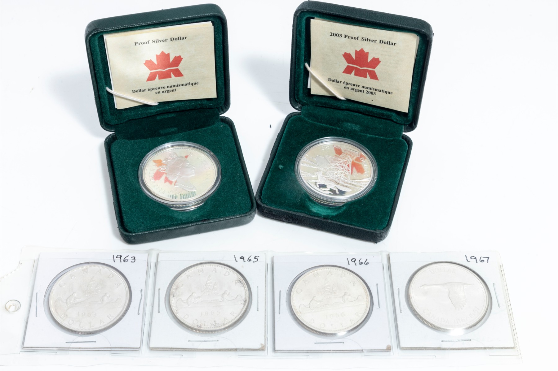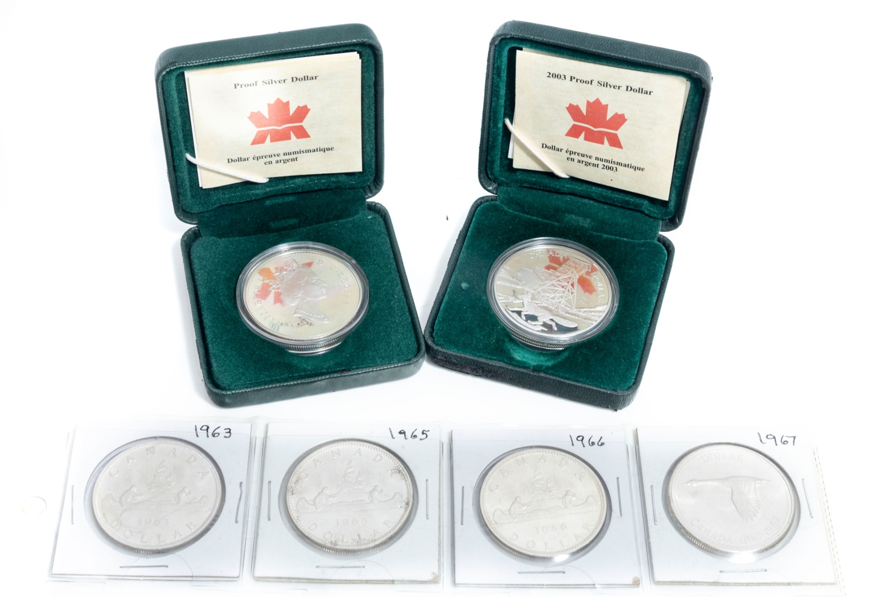 A pair of mixed date Canadian Mint Proof silver dollars. Each dollar coin is contained within their original cases (Complete with informational papers) and protected by plastic coin displays. See photos for coinage details.