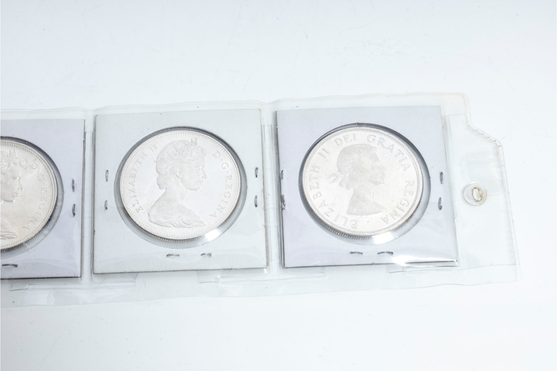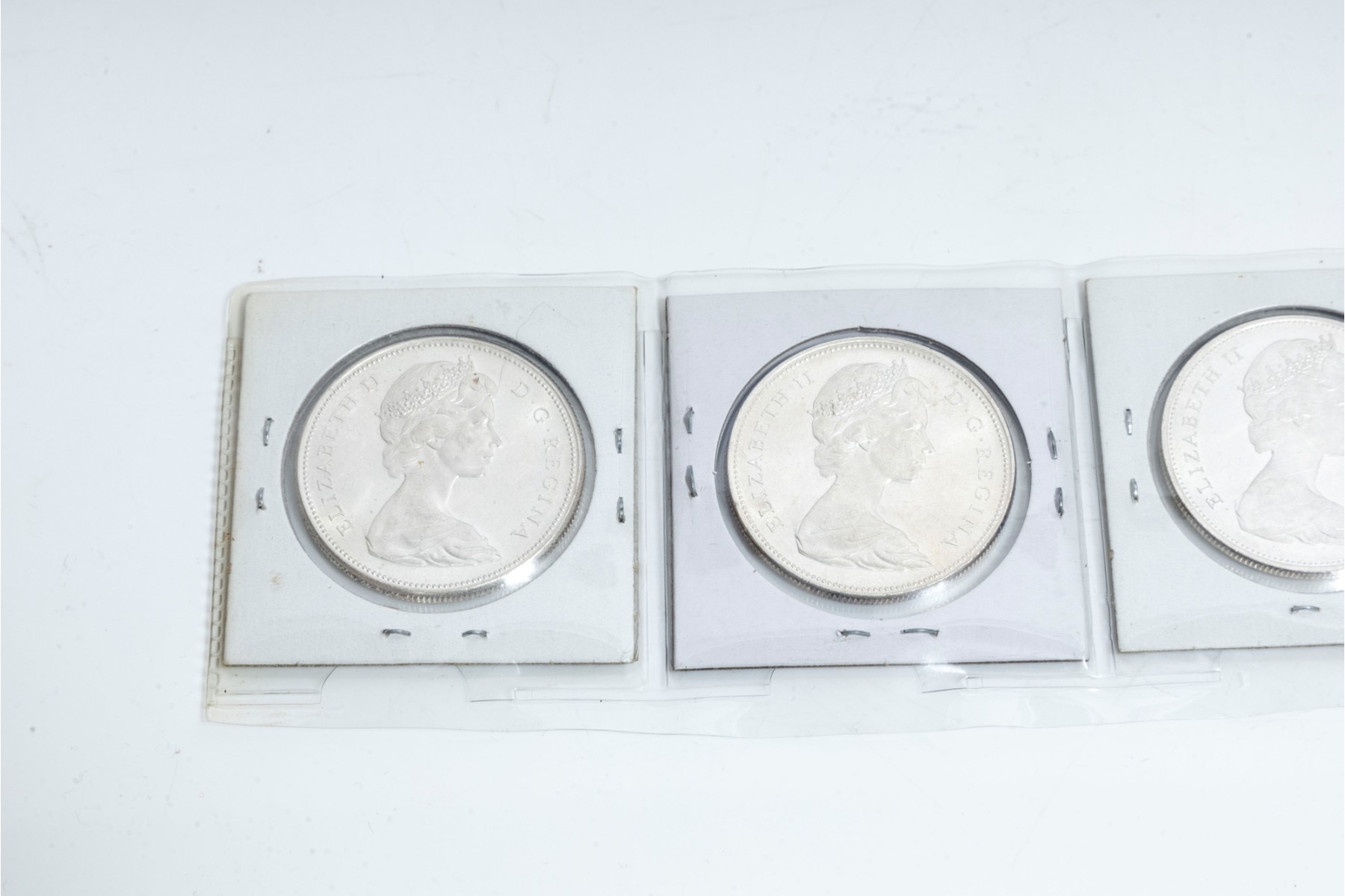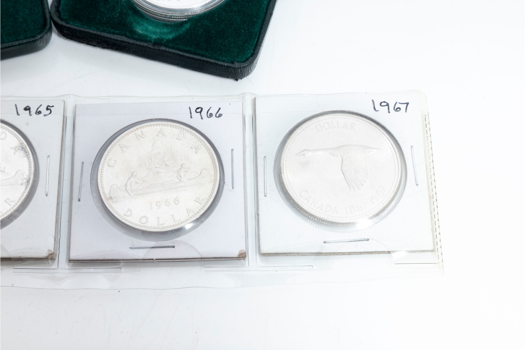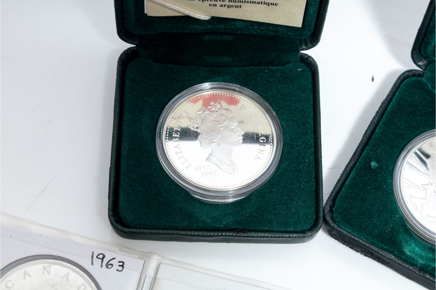 A pair of mixed date Canadian Mint Proof silver dollars. Each dollar coin is contained within their original cases (Complete with informational papers) and protected by plastic coin displays. See photos for coinage details.