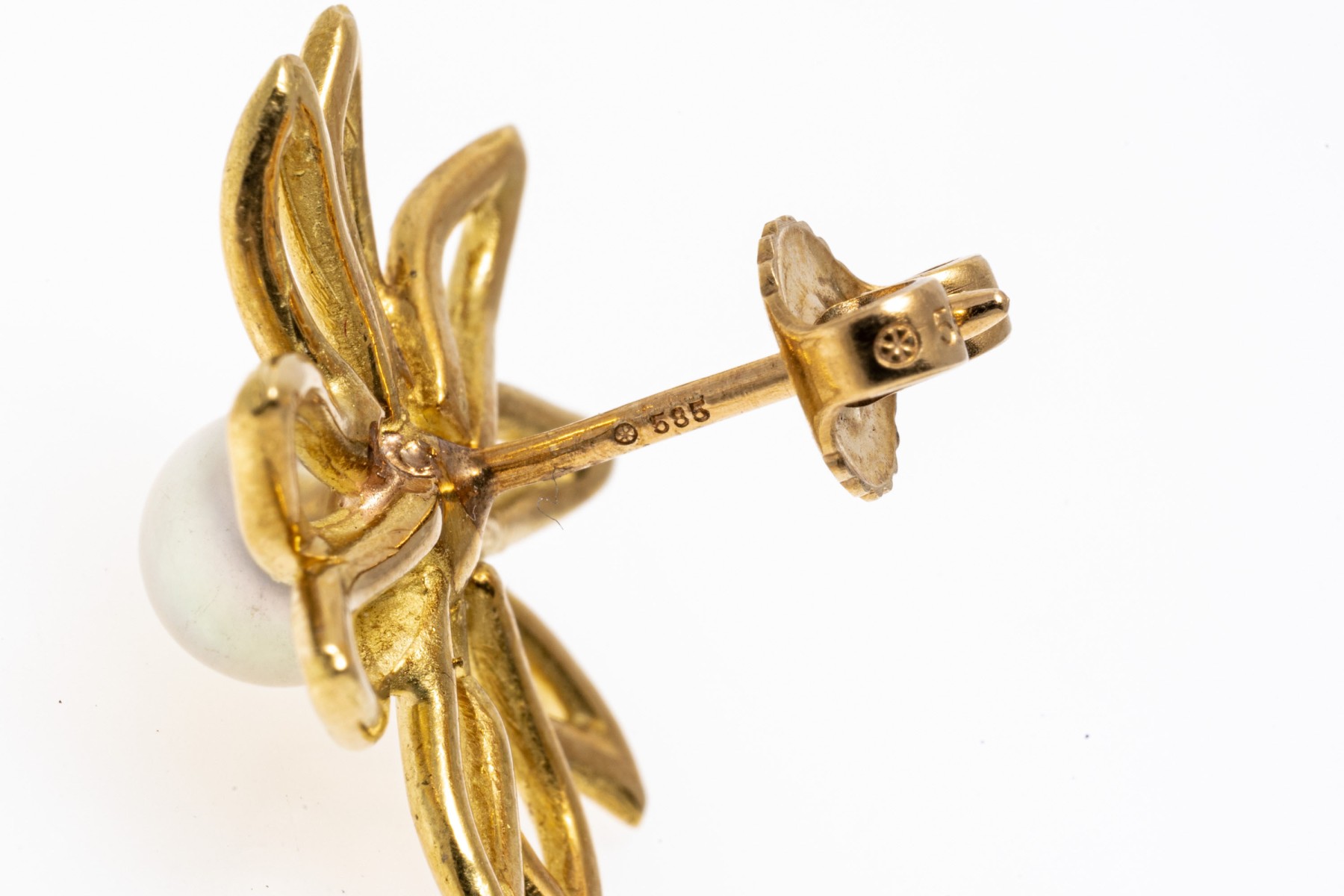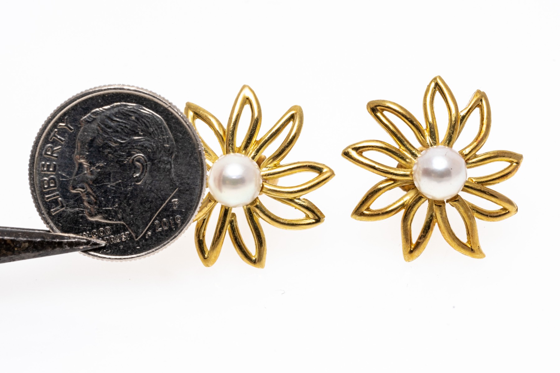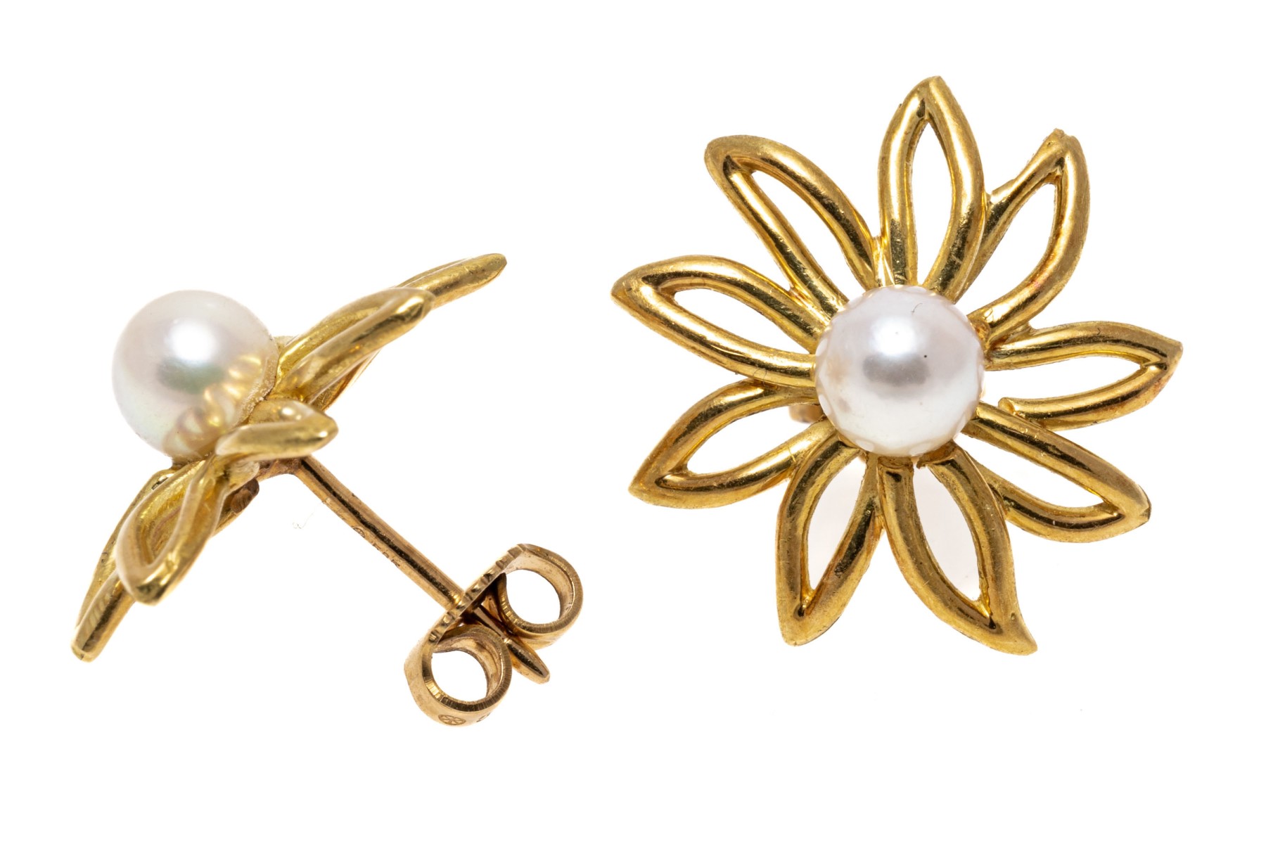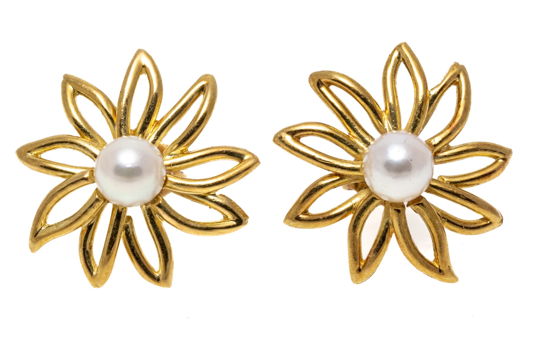 14K yellow gold earrings. These earrings display single 5.5mm cultured pearl with light pink overtones, at the center of an open floral design. Post and clutch backings.